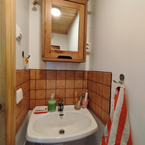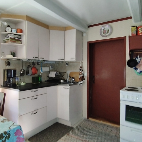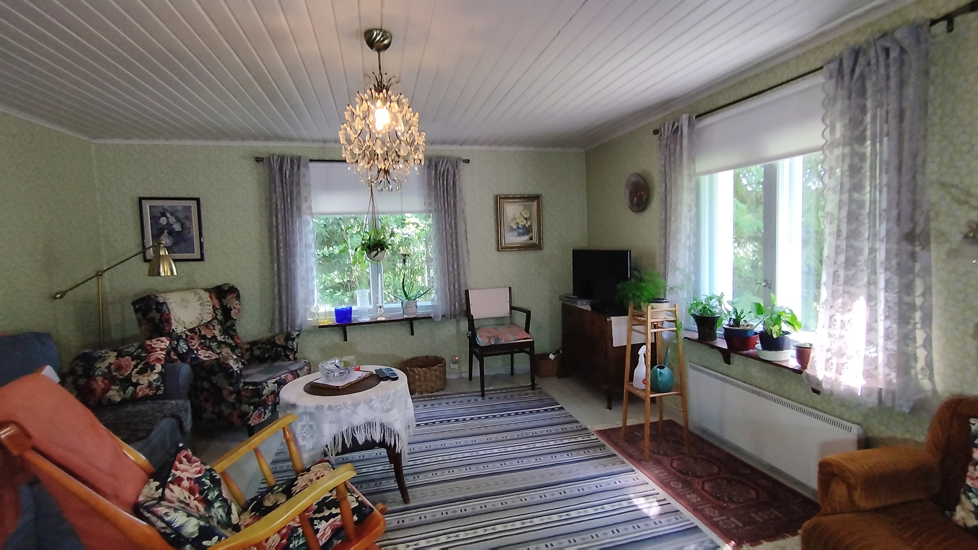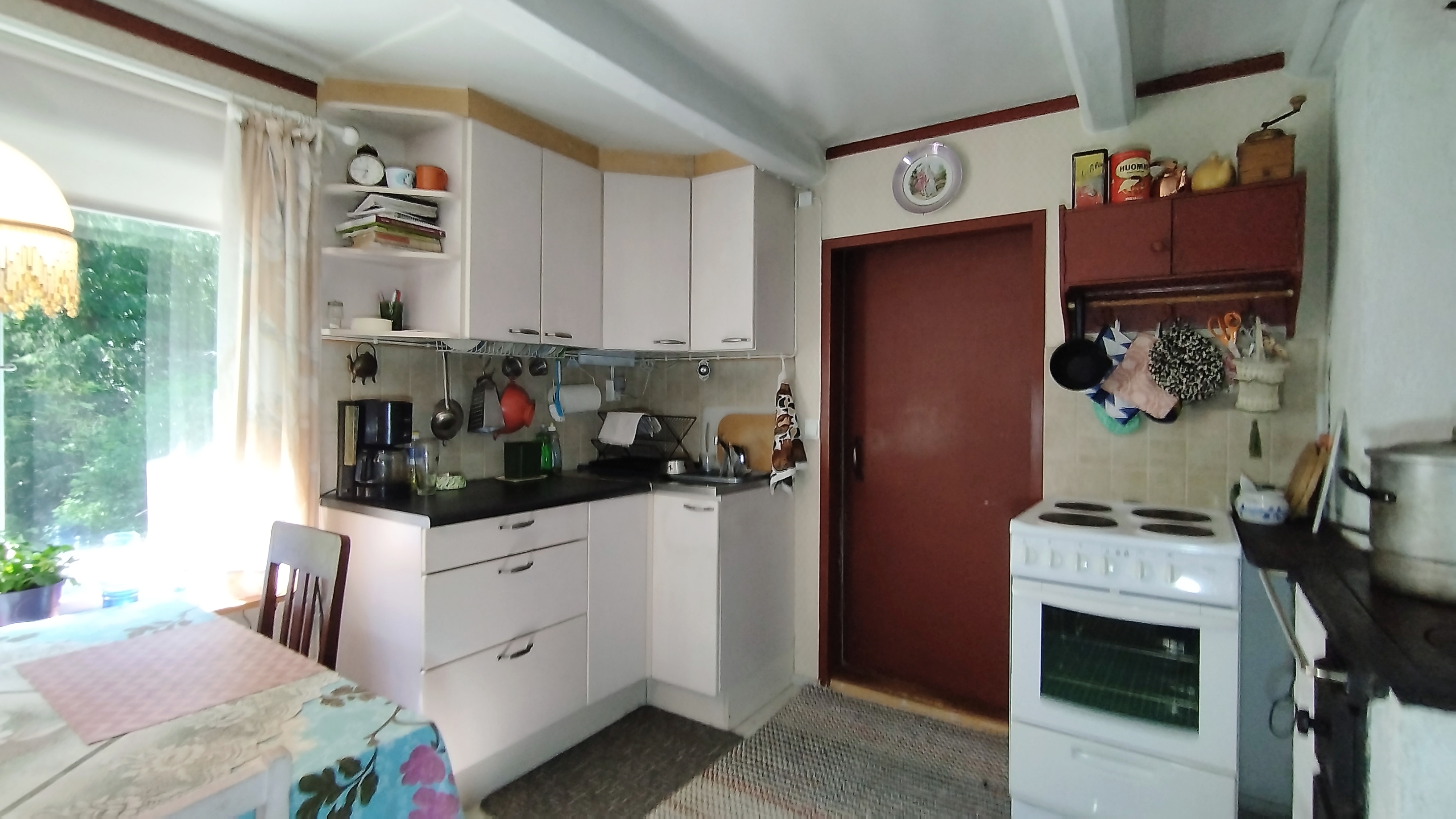 Mökin sydän on tilava keittiö, jossa on uusittu leivinuuni ja puuhella sekä tilaa ruokapöydälle. Suuressa tuvassa varaava takka tuo lämpöä ja tunnelmaa. Wc-tila on varustettu vesiosuuskunnan vesi- ja viemäriliittymillä, mikä lisää asumismukavuutta. Makuuhuone sijaitsee vinttihuoneessa yläkerrassa, ja lisäksi alakerrasta löytyy pieni huone majoittumiseen. Rakennus on vuosien varrella läpikäynyt useita parannuksia, kuten katon, sähköjen ja lattioiden uusimisen, mikä tekee siitä käyttövalmiin vapaa-ajan kodin.