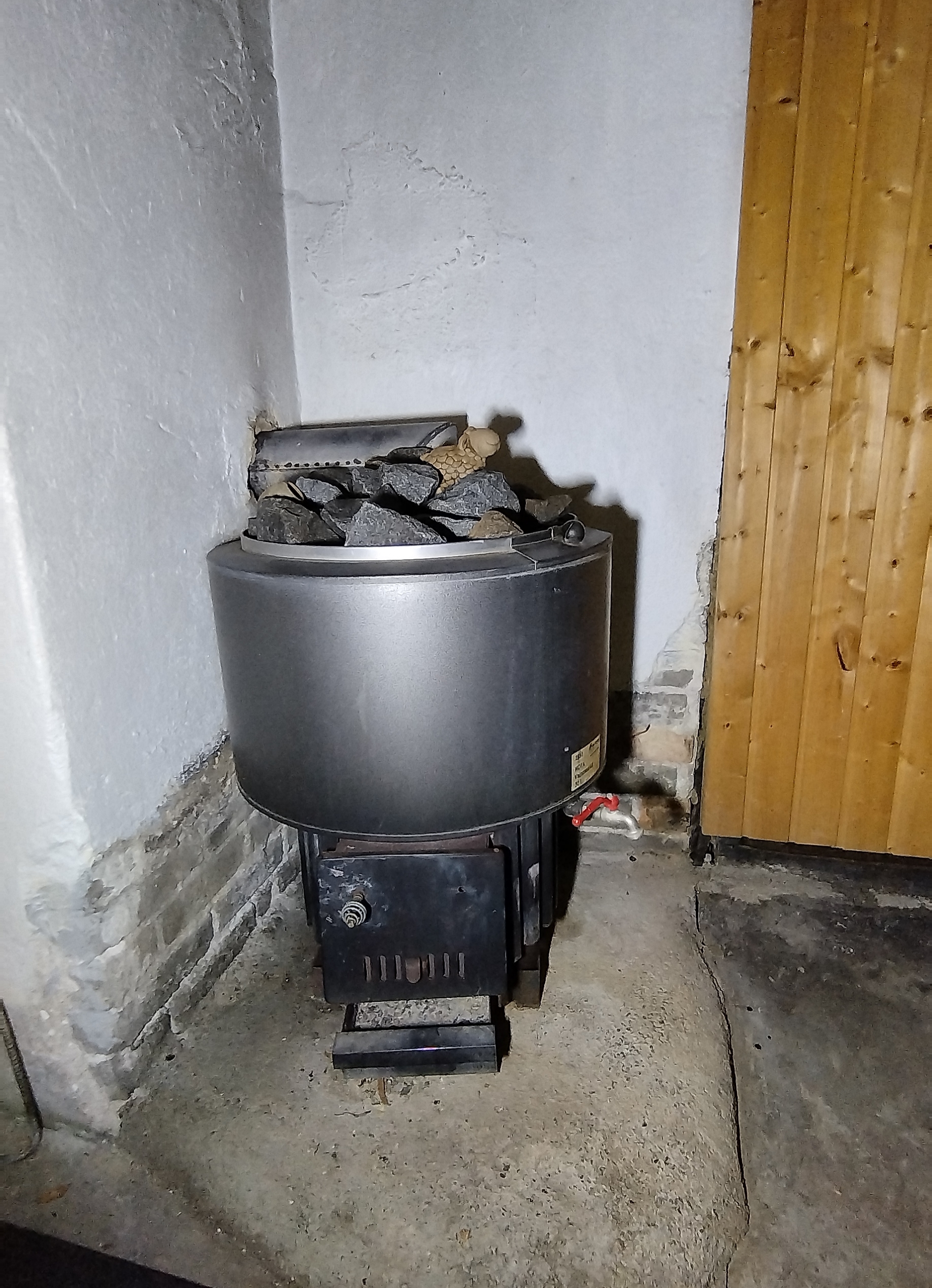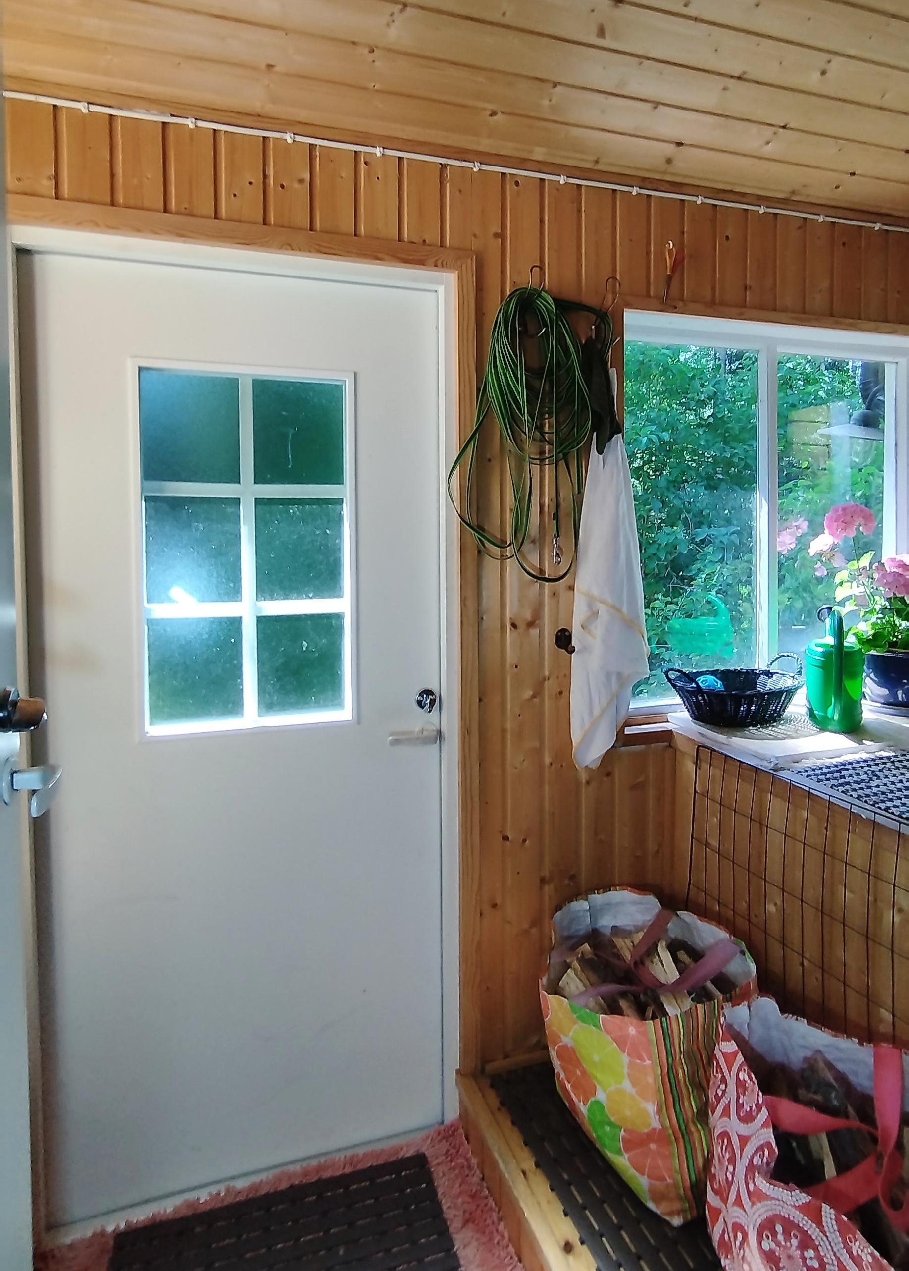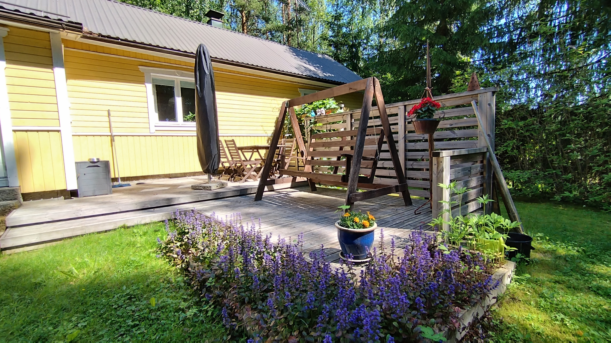 Oma pihasauna, jossa on myös pieni saunatupa ja terassi saunan edessä.