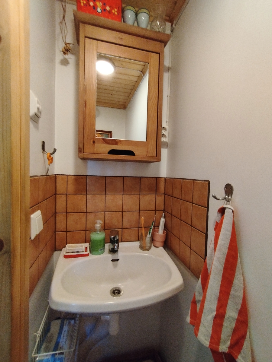 Varusteet: lattiaan asennettu WC, allaskaappi, peilikaappi