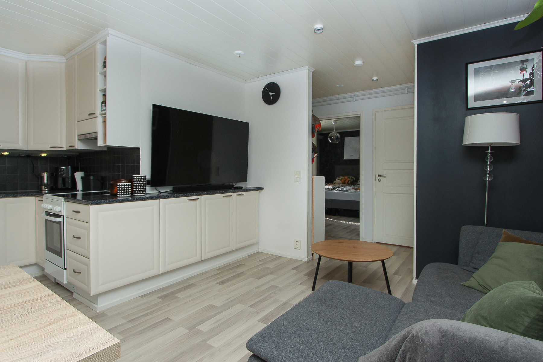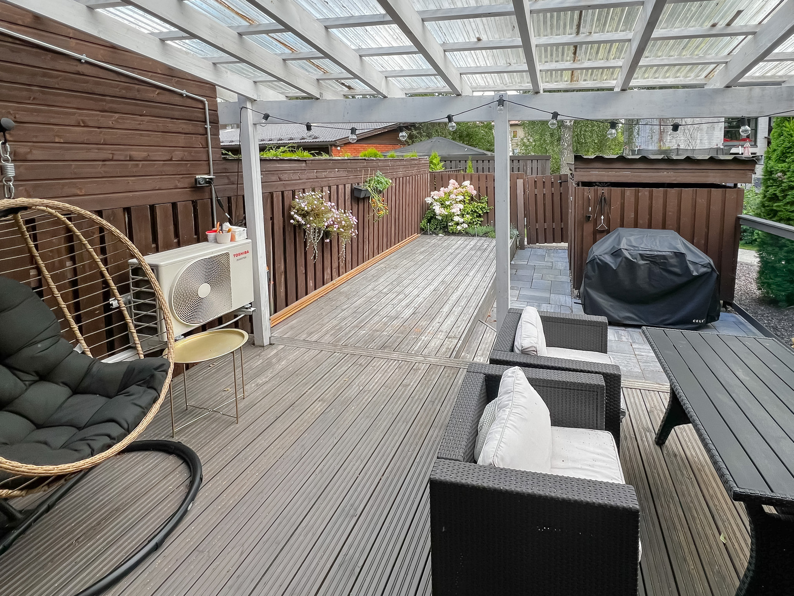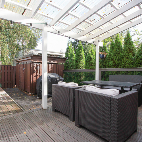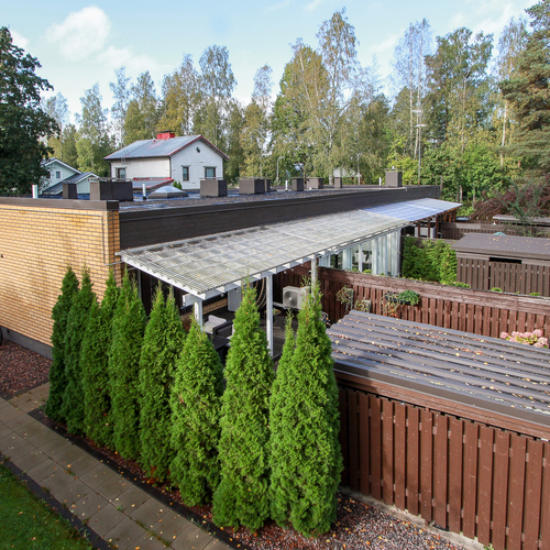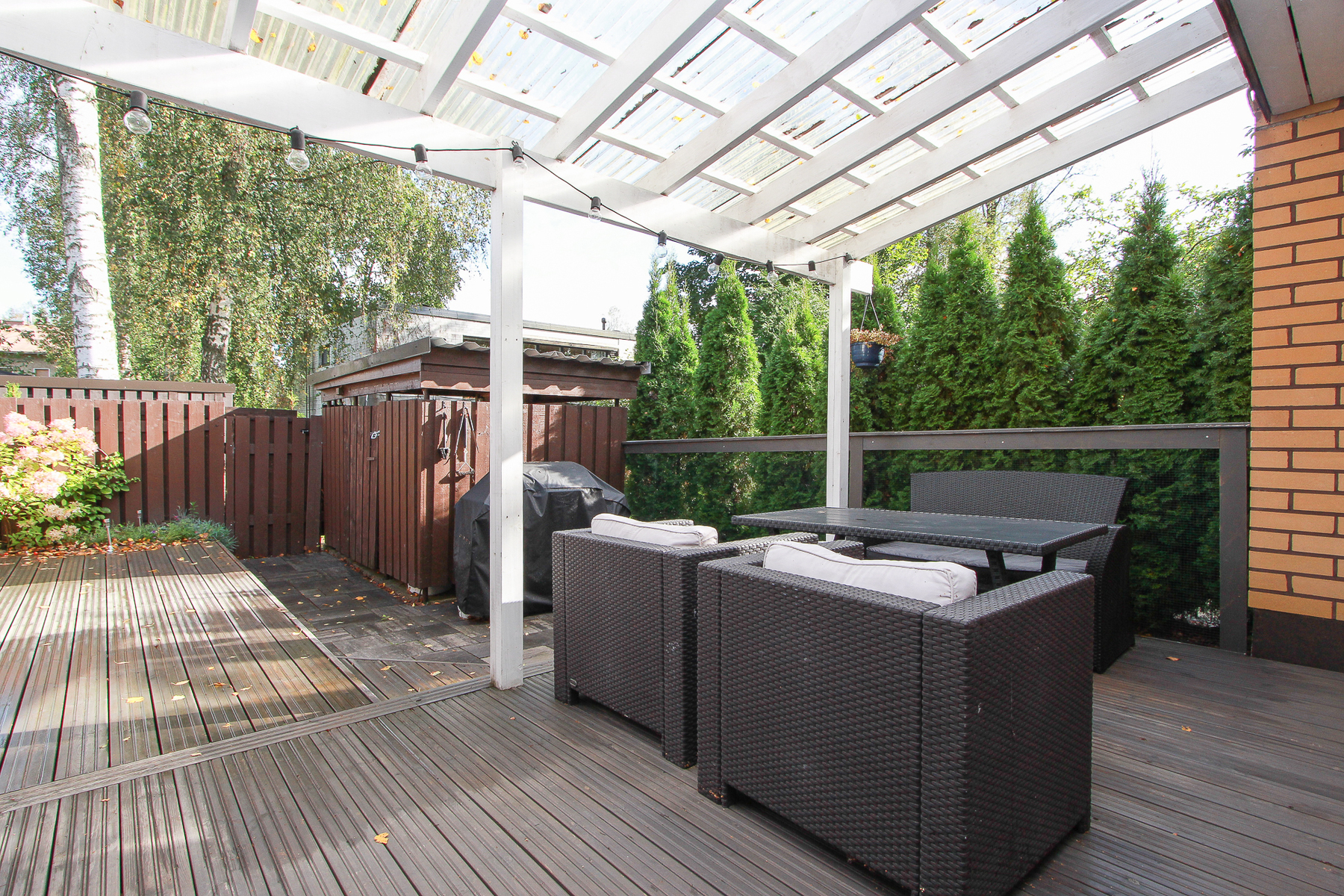 Tämän kodikkaan huoneiston sijainti on talon päädyssä, mikä tarjoaa tavallista enemmän yksityisyyttä. Asunnon sydän on yhtenäinen keittiö ja olohuone, josta on käynti tilavalle, osittain katetulle ja aidatulle terassille. Terassi ja suojaisa oleskelupiha muodostavat rauhallisen keitaan, jossa voi nauttia kesäpäivistä ja iltahetkistä ilman ohikulkijoiden katseita.