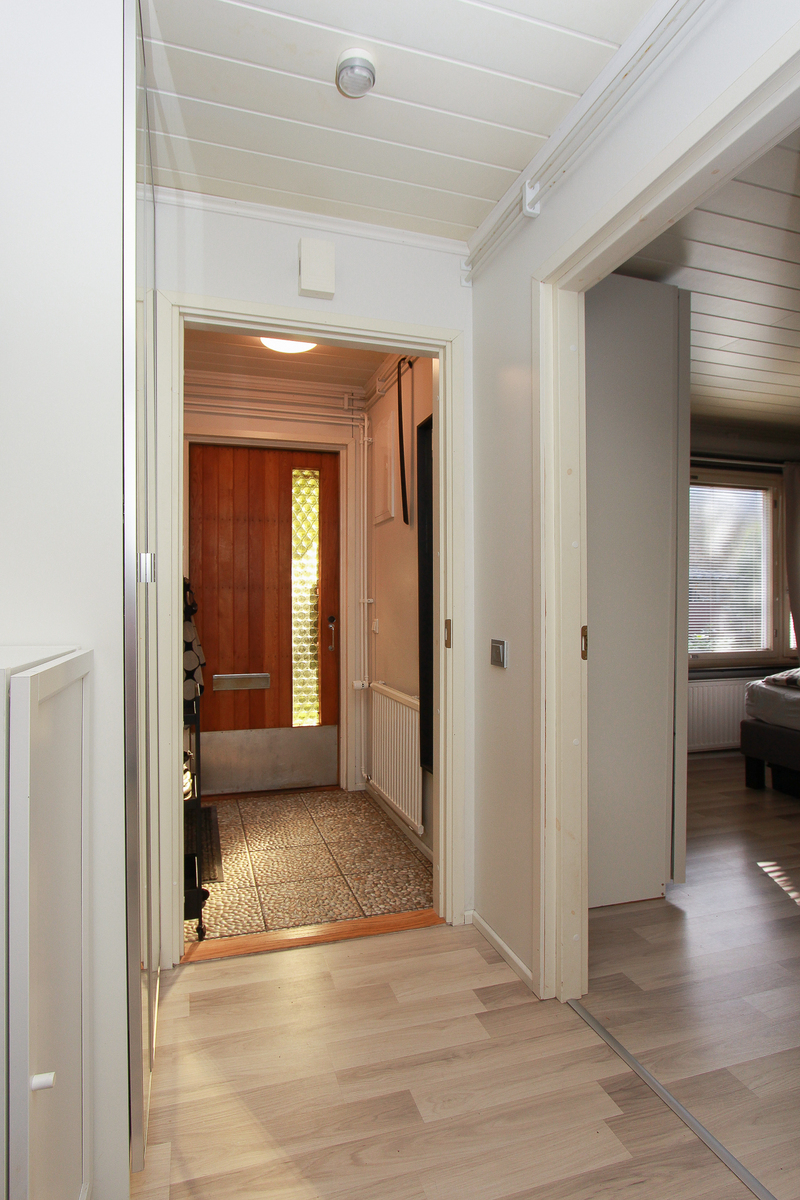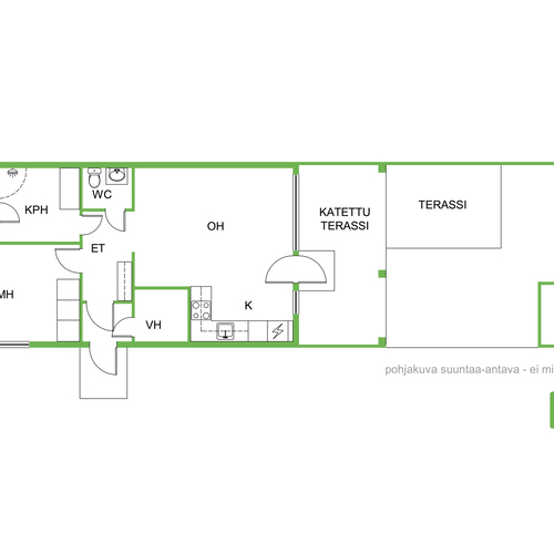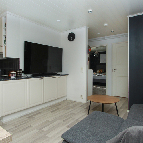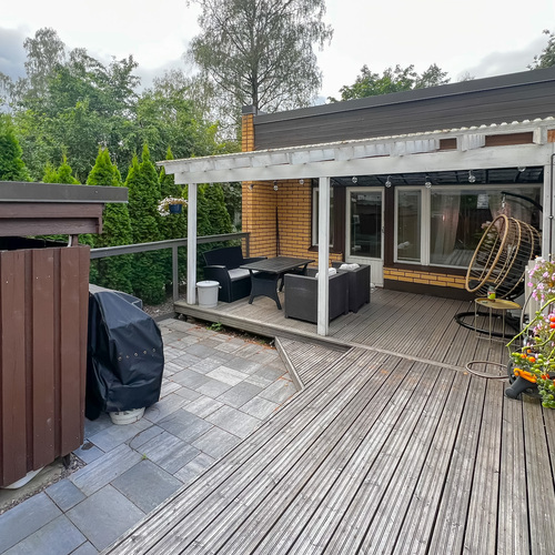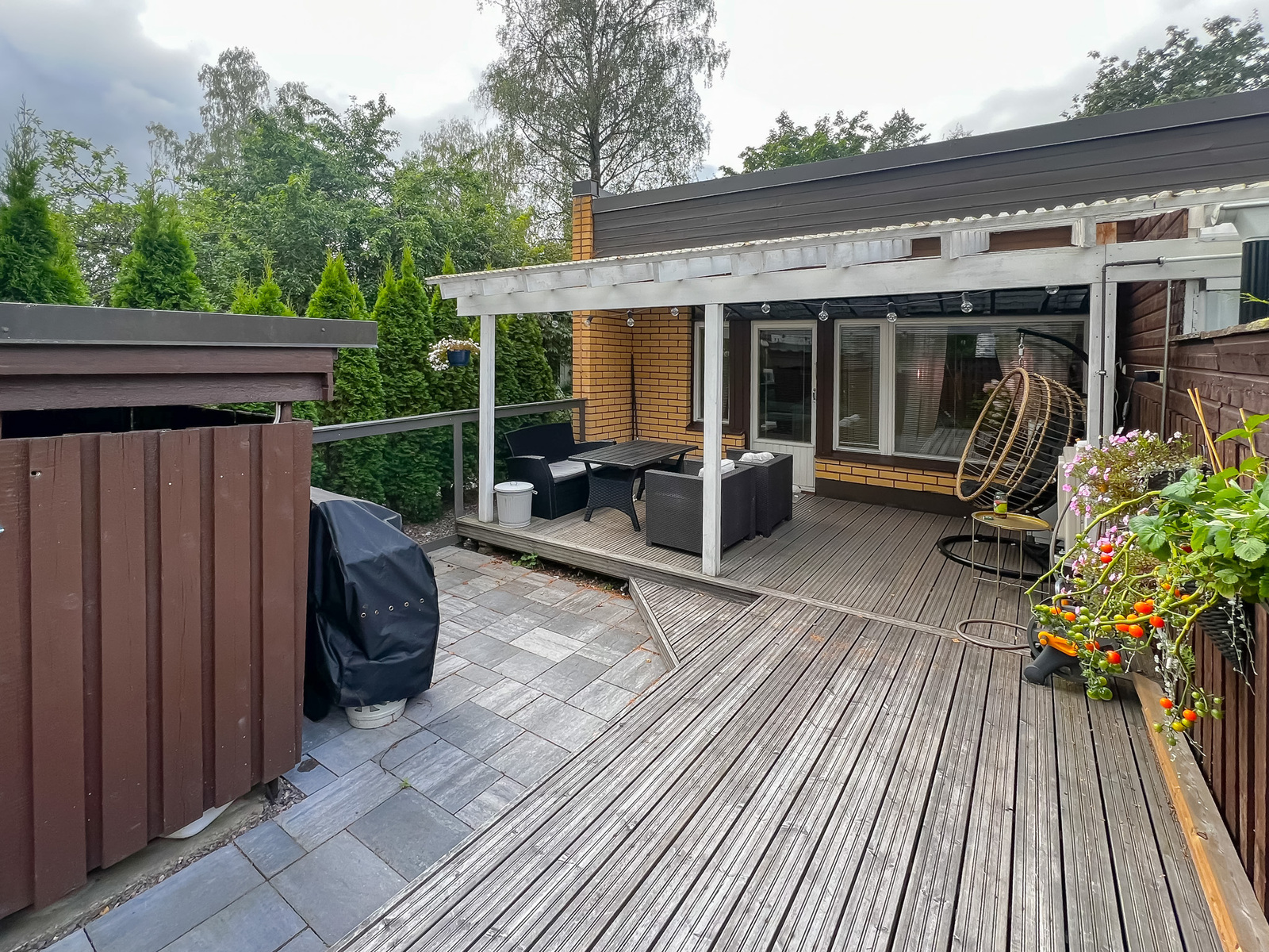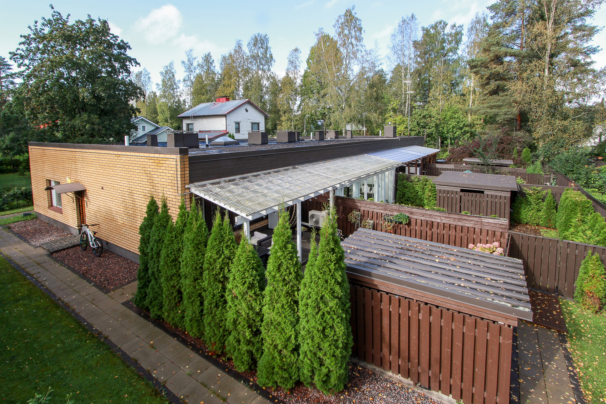 Tämän kodikkaan huoneiston sijainti on talon päädyssä, mikä tarjoaa tavallista enemmän yksityisyyttä. Asunnon sydän on yhtenäinen keittiö ja olohuone, josta on käynti tilavalle, osittain katetulle ja aidatulle terassille. Terassi ja suojaisa oleskelupiha muodostavat rauhallisen keitaan, jossa voi nauttia kesäpäivistä ja iltahetkistä ilman ohikulkijoiden katseita.