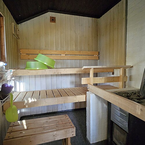 Erillinen puulämmitteinen rantasauna, vesijohto. Saunatuvassa tulisija.