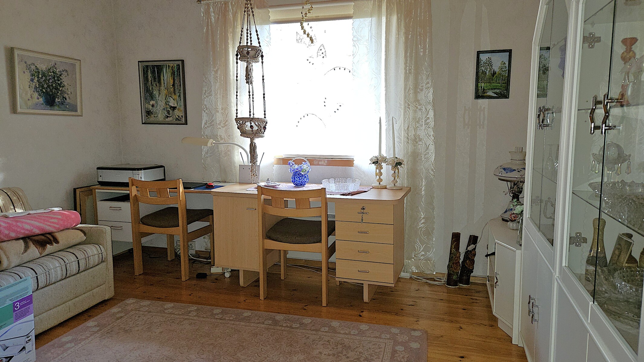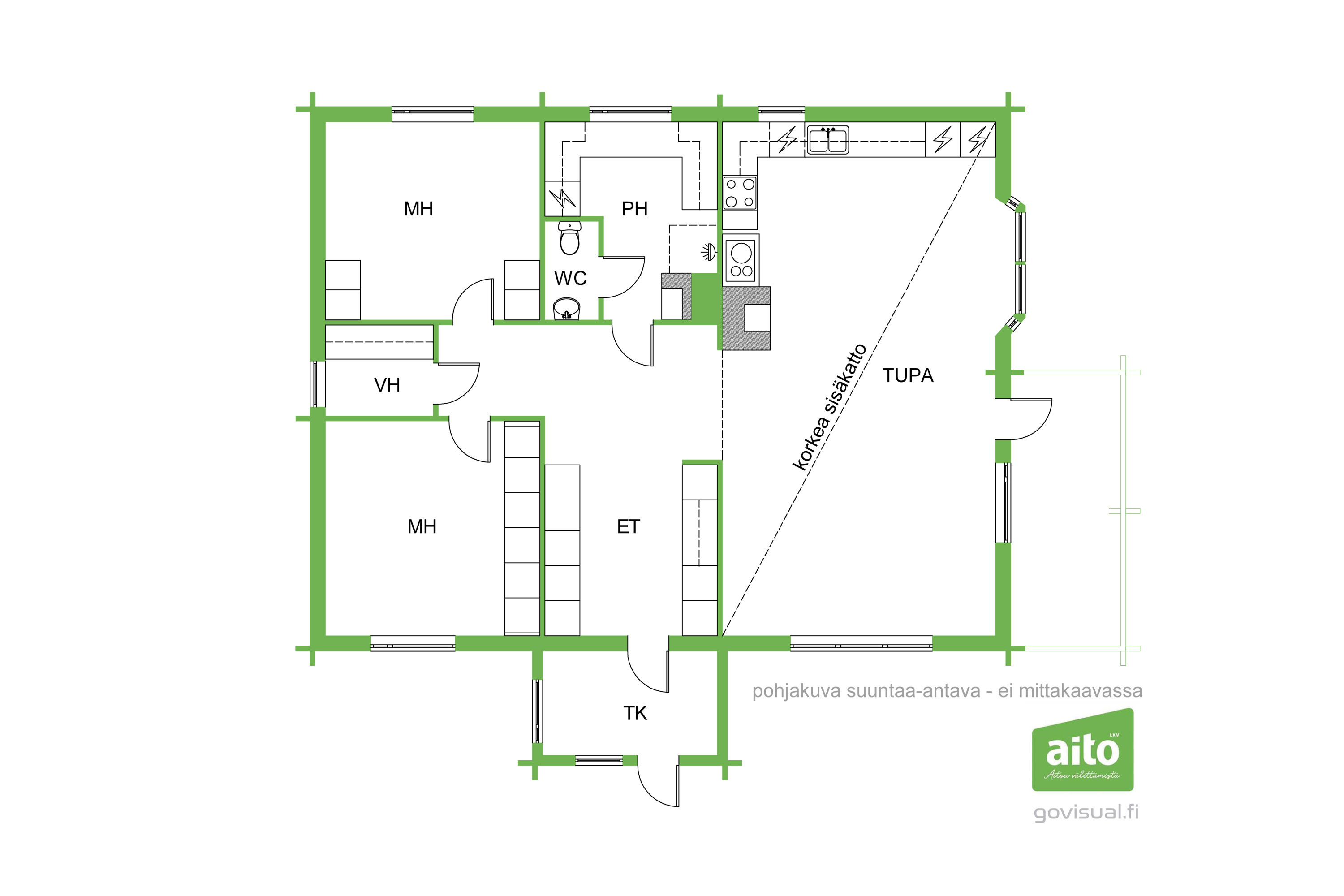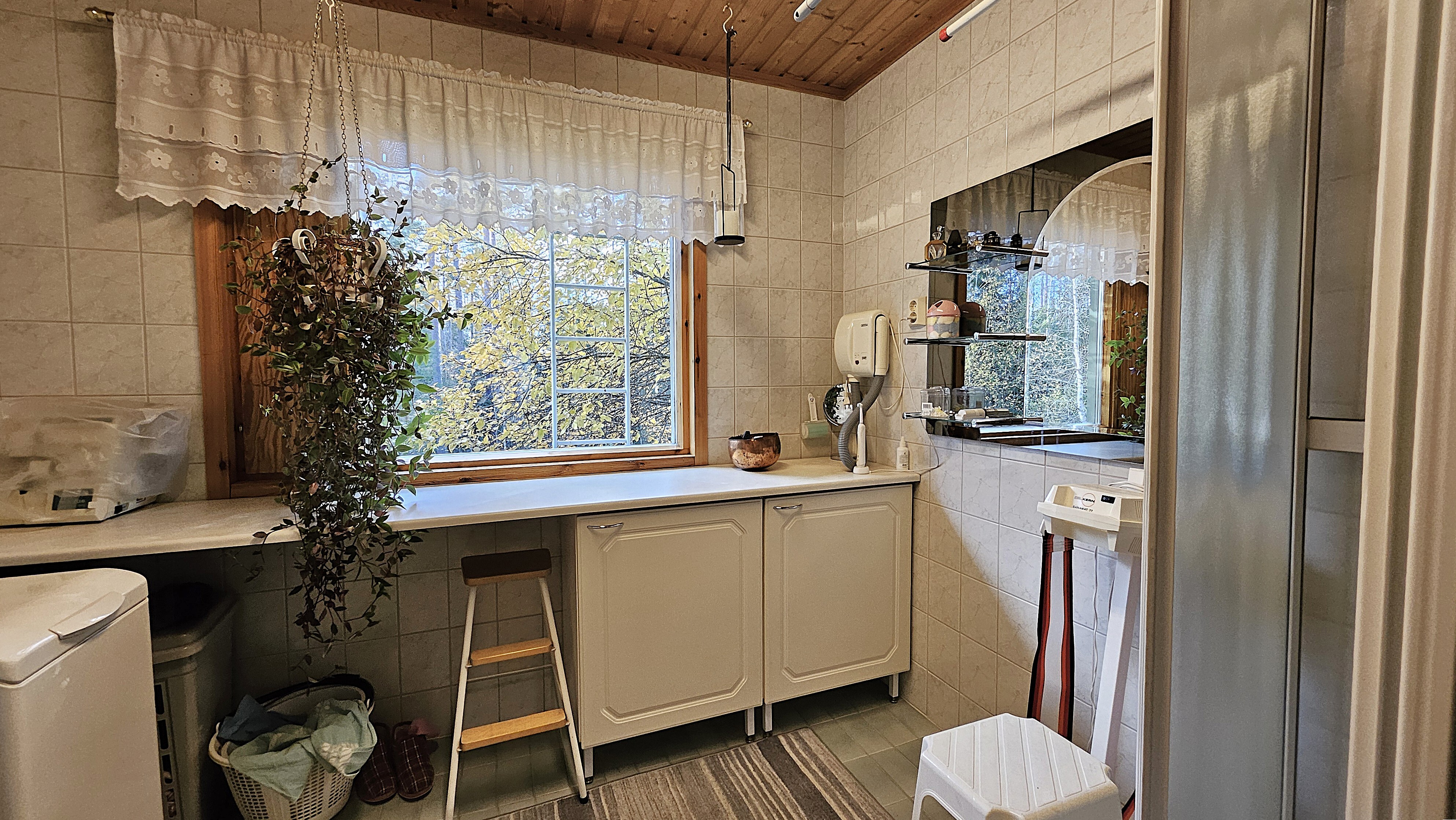 Huoneet: 3 h + k + kph + wc + vh + terassi + erillinen rantasauna, aitta ja talousrakennus. Ja tottakai leikkimökki