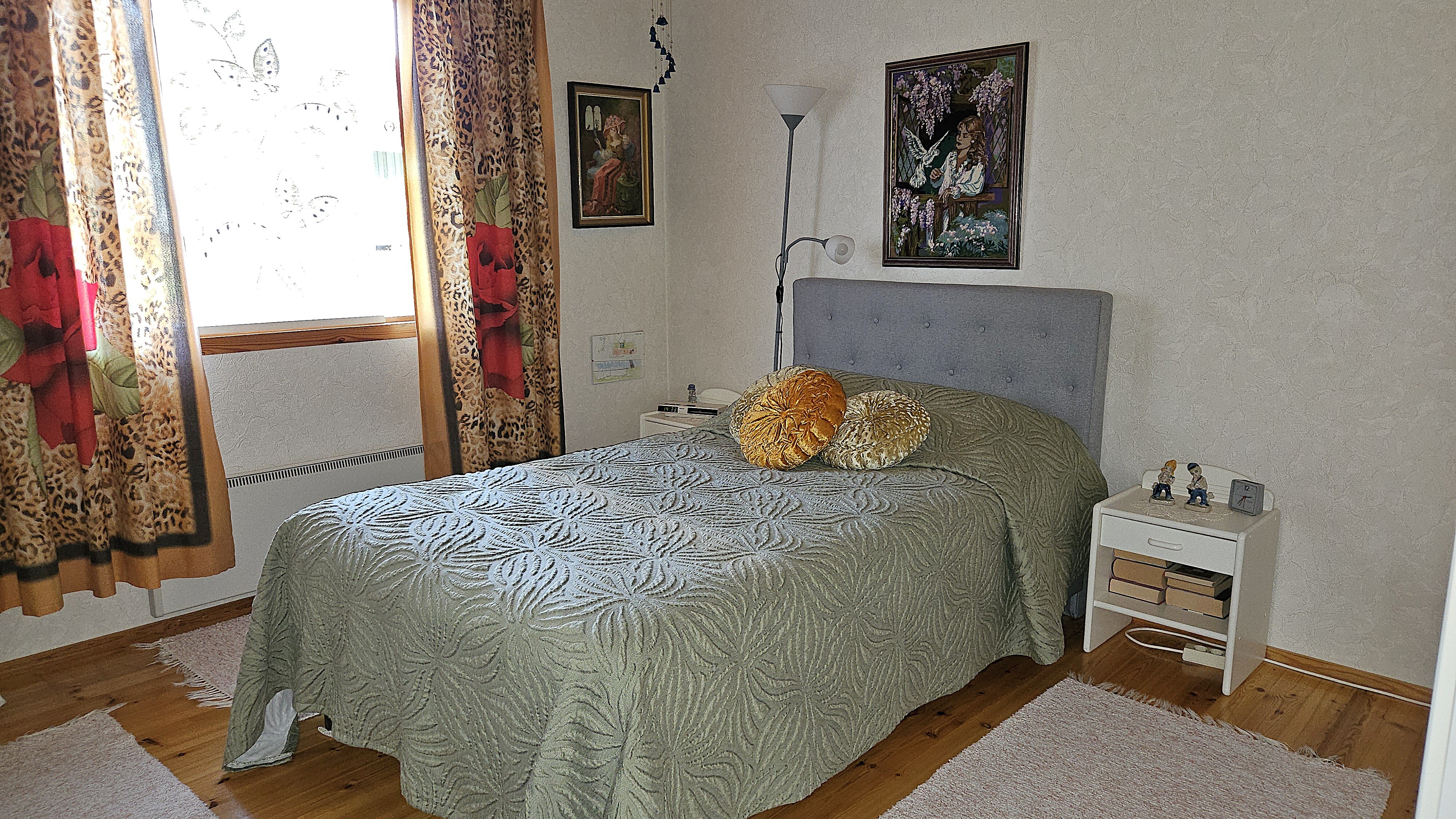 Kodin materiaalit ovat luonnonläheisiä ja kestäviä: hirsipaneeliseinät, lankkulattiat ja puunsävyiset pinnat henkii laatua ja rauhaa. Kaksi makuuhuonetta, tilava vaatehuone ja kodinhoitotila tekevät asumisesta sujuvaa.