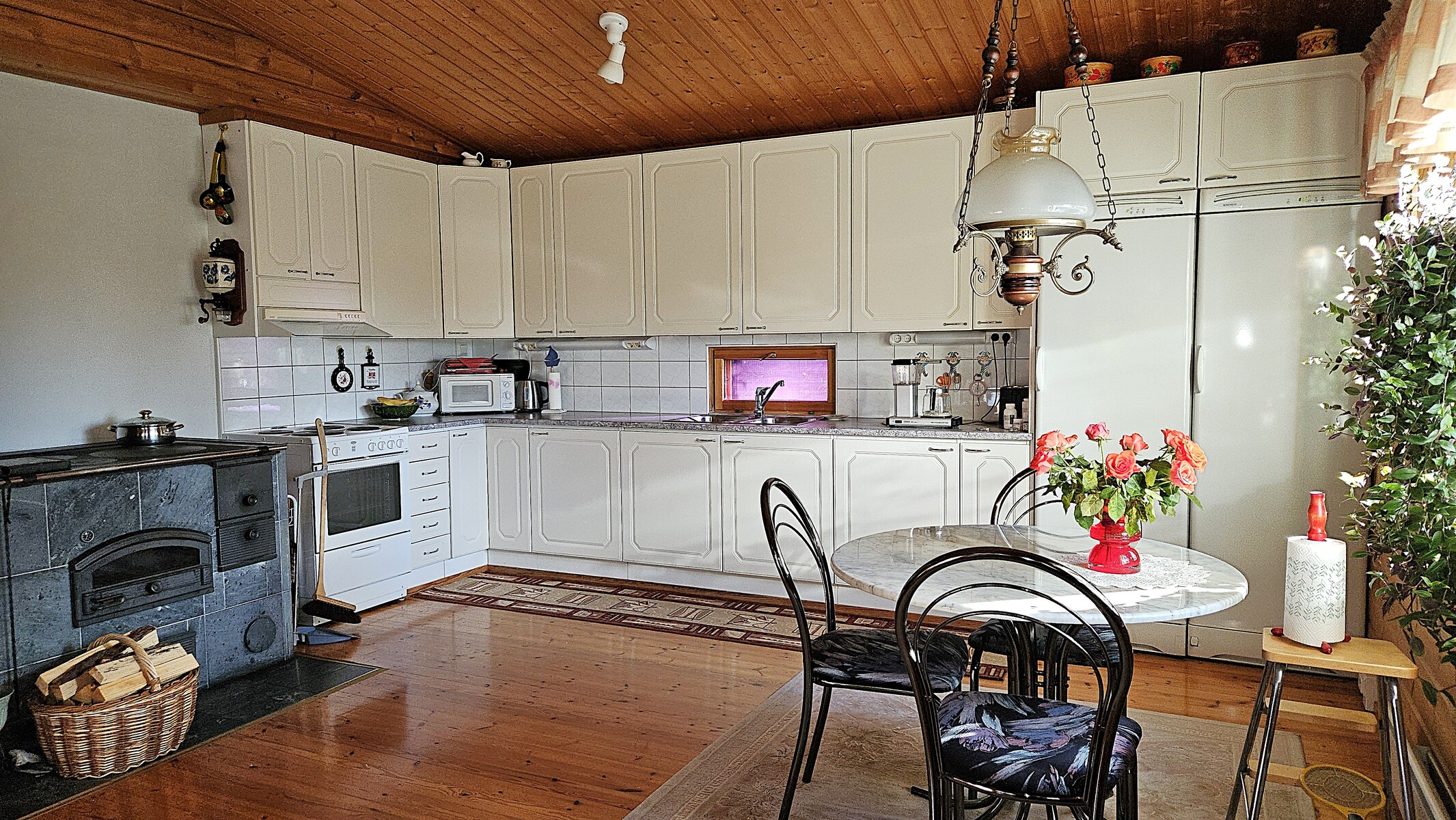 Avara tupakeittiö hurmaa vuolukivisellä puuhellalla ja leivinuunilla, jotka tuovat lämpöä ja tunnelmaa niin arkeen kuin juhlaan. Olohuoneen suuret ikkunat avautuvat järvelle – näkymät ovat kuin elävä maisemataulu.