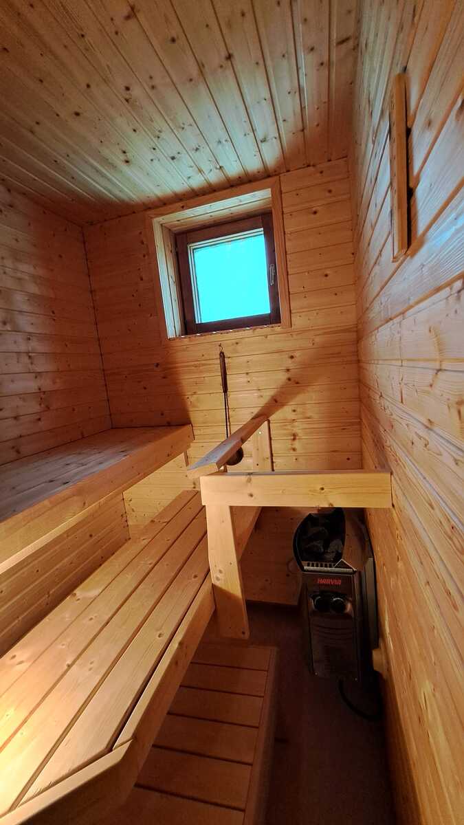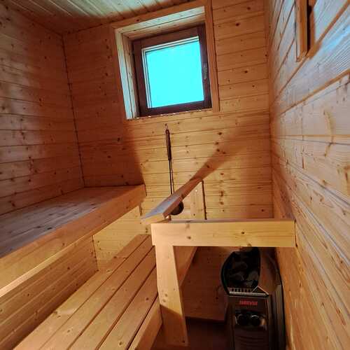 Sähkökiuas, lauteet yhdellä seinustalla, ikkuna ulos, lasiovi puukehyksillä, lattiakaivo.