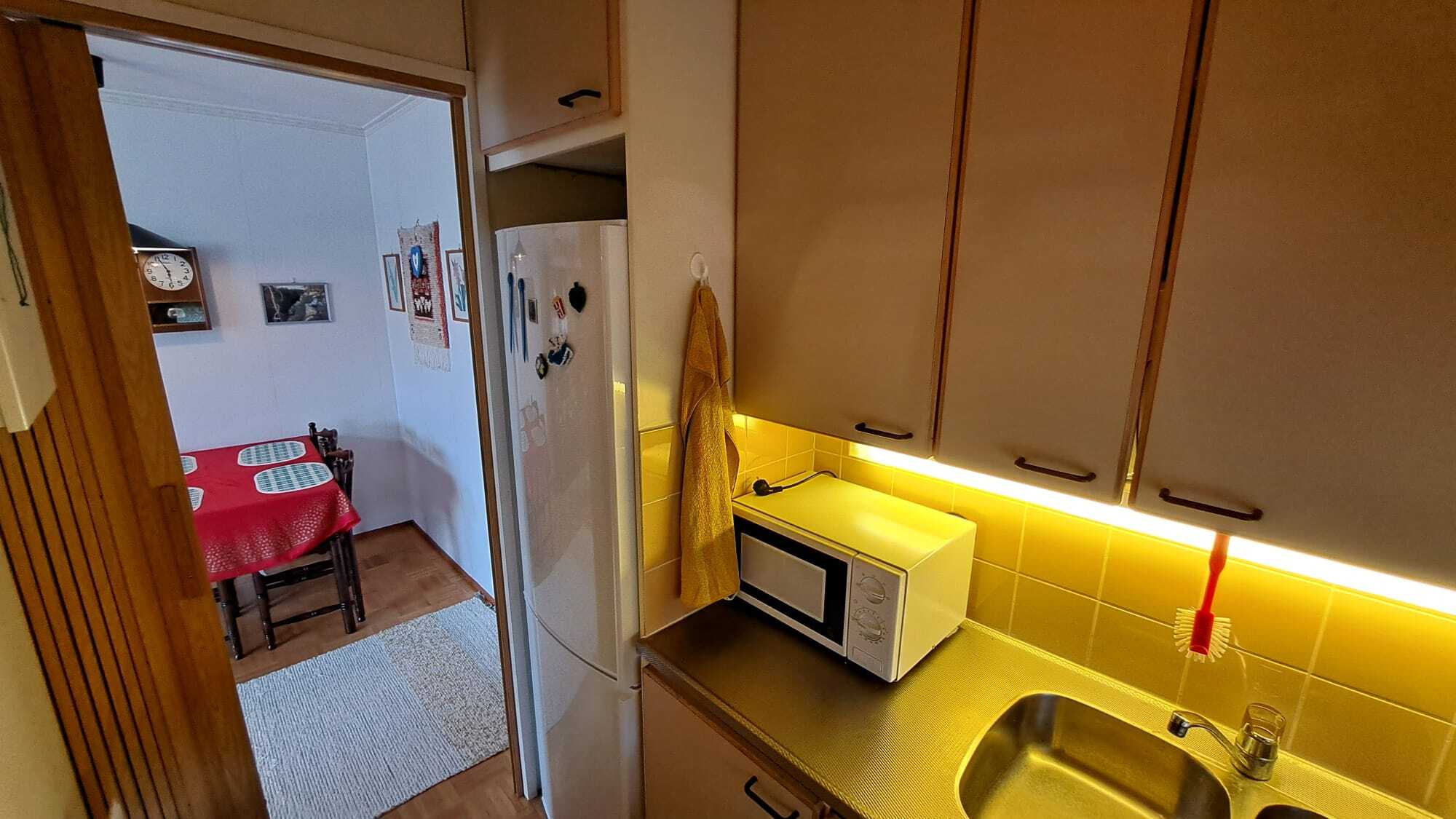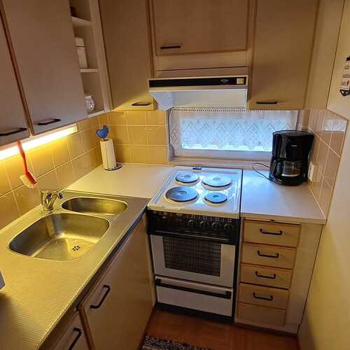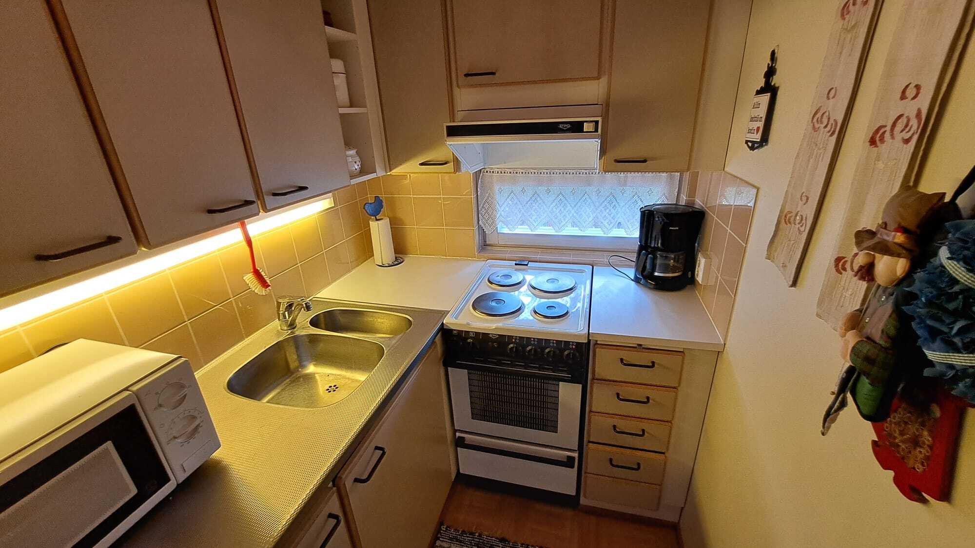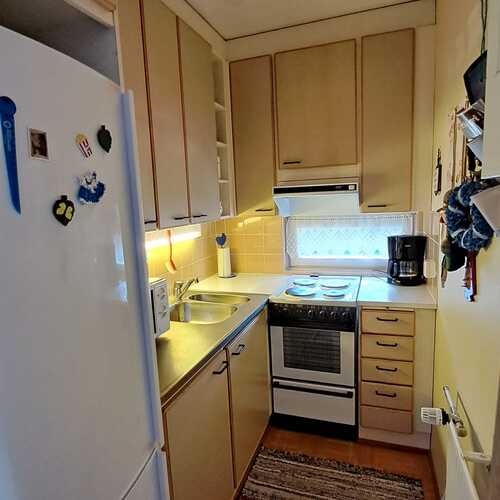 Keittokomero, jääkaappipakastin, sähköliesi, liesituuletin (hormiliitäntä), keittiökaapistot ja -tasot.