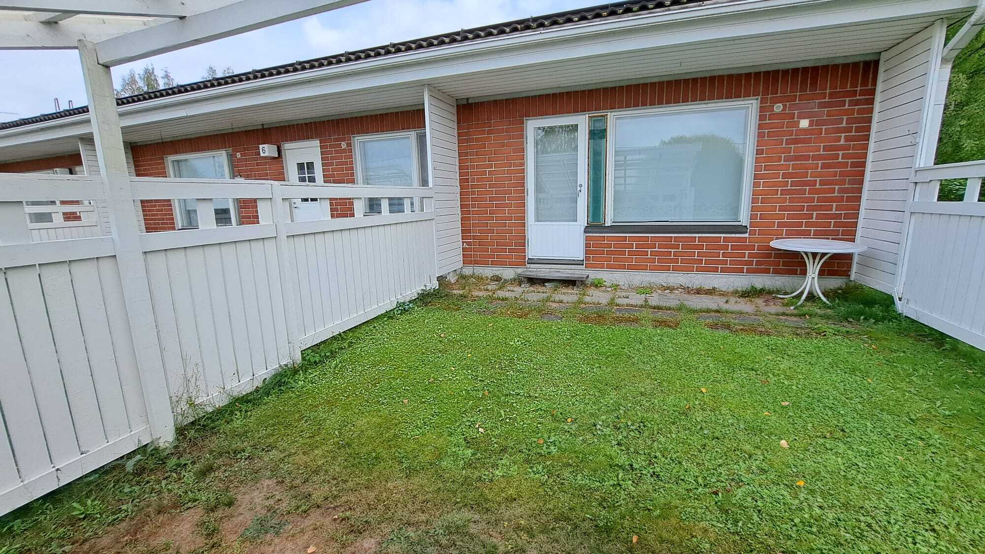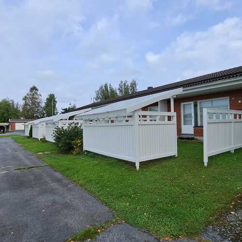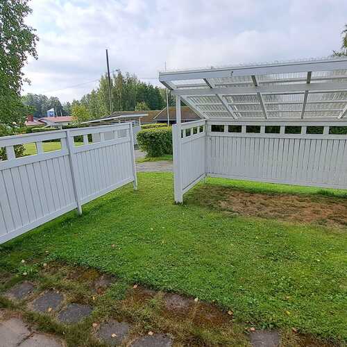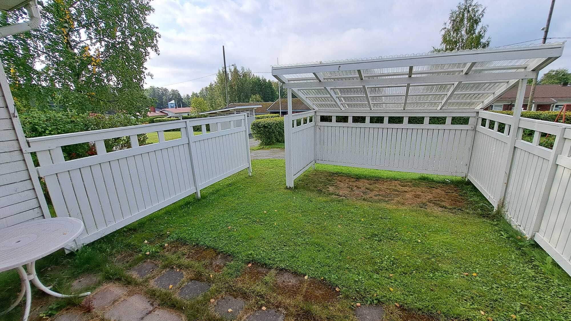 Reilunkokoinen aidattu terassi takapiha, joka osin katettu valokatteella.