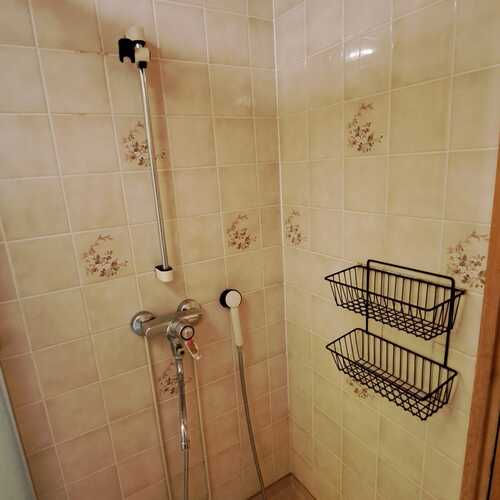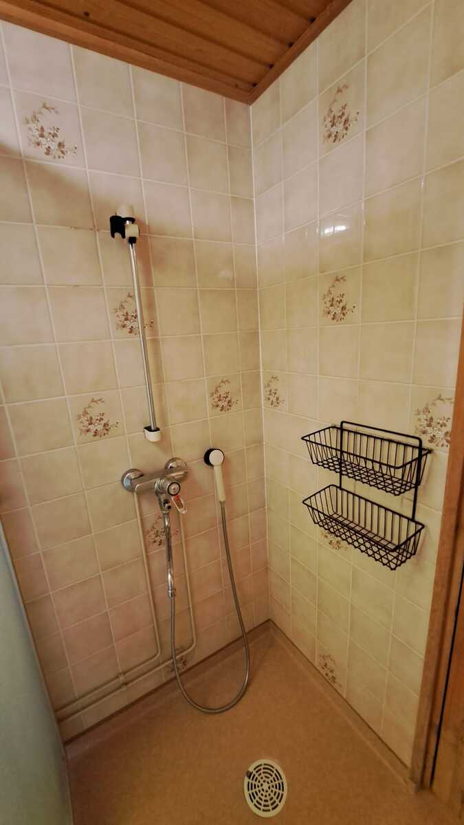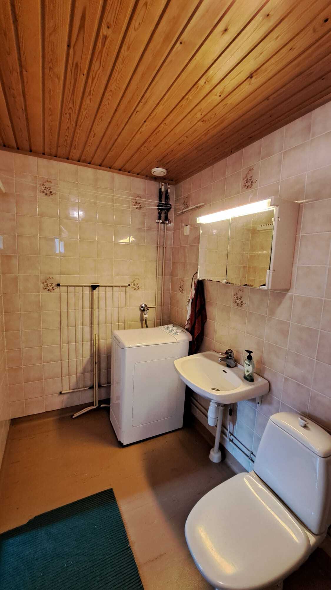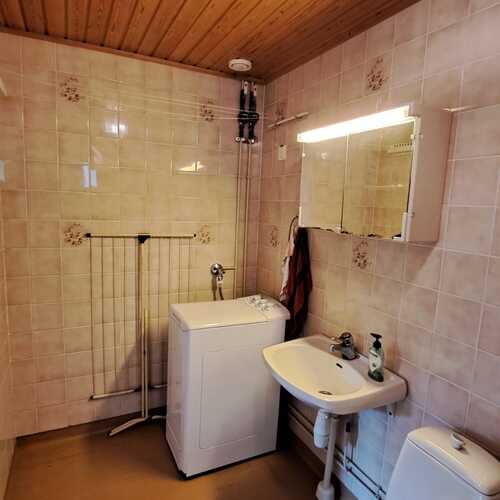 Suihku, suihkuseinä, allas, peilikaappi, WC-istuin, pyykinpesukone, kiinteä valaisin, lattialämmitys sähköllä.