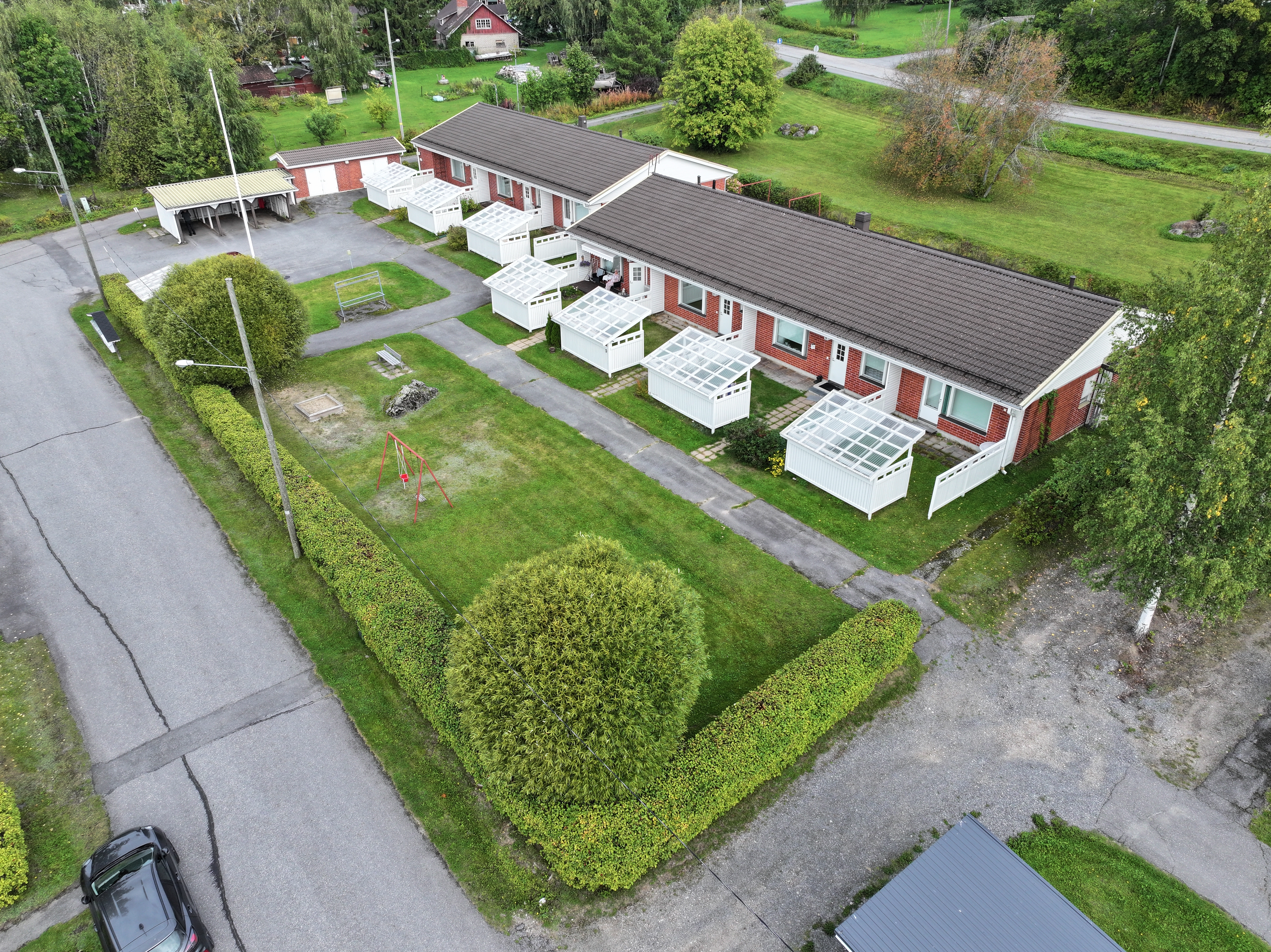 Esteettömät kulkuväylät, jätepiste, tamppaus ja pyykinkuivaus, lasten leikkipaikka, keinu.