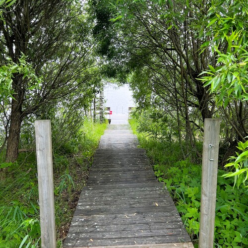 Etupiha on tasainen, rannan puoli on loiva rinne.