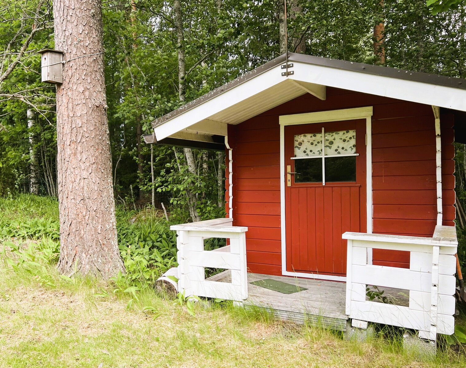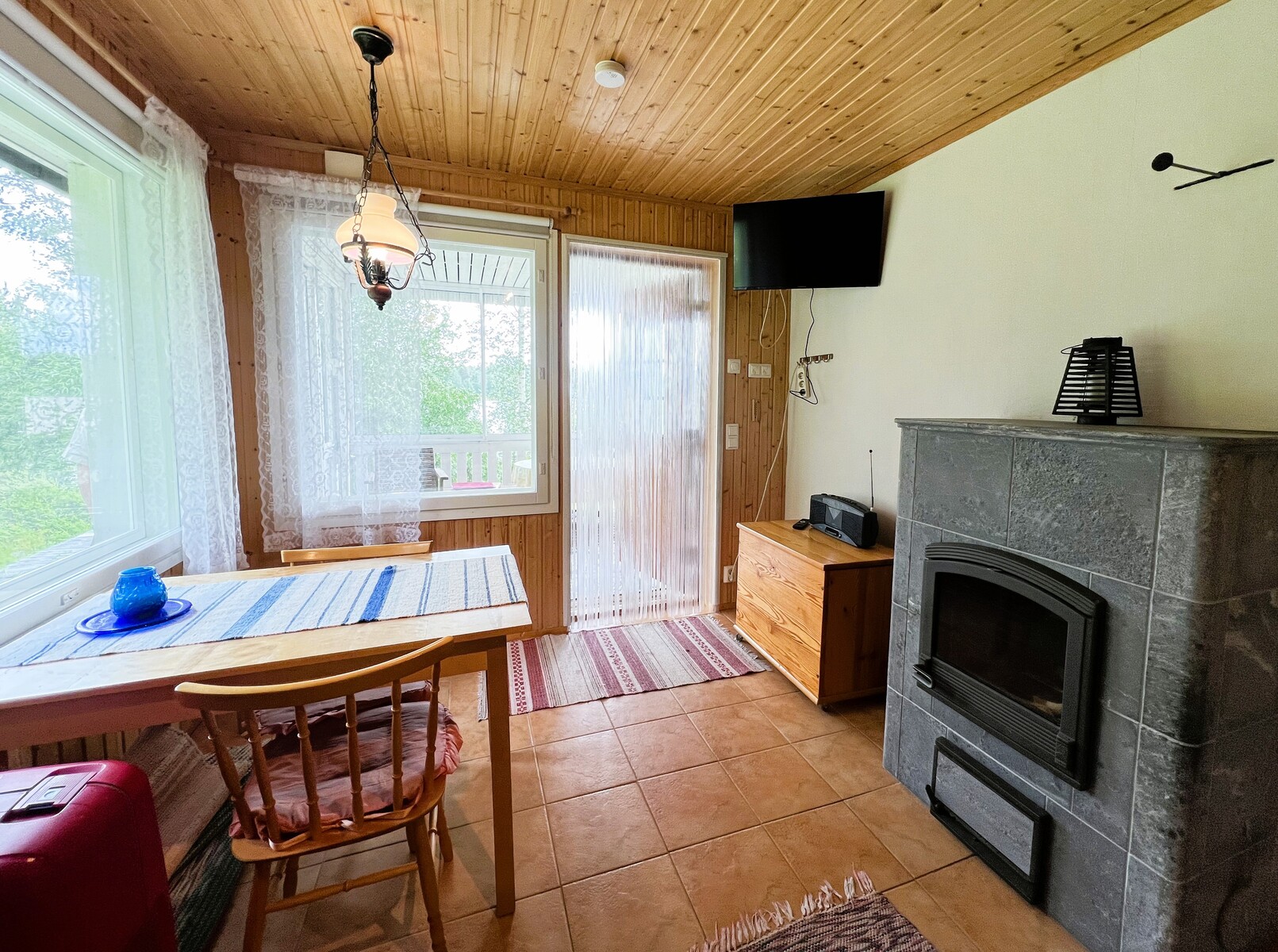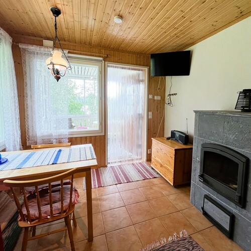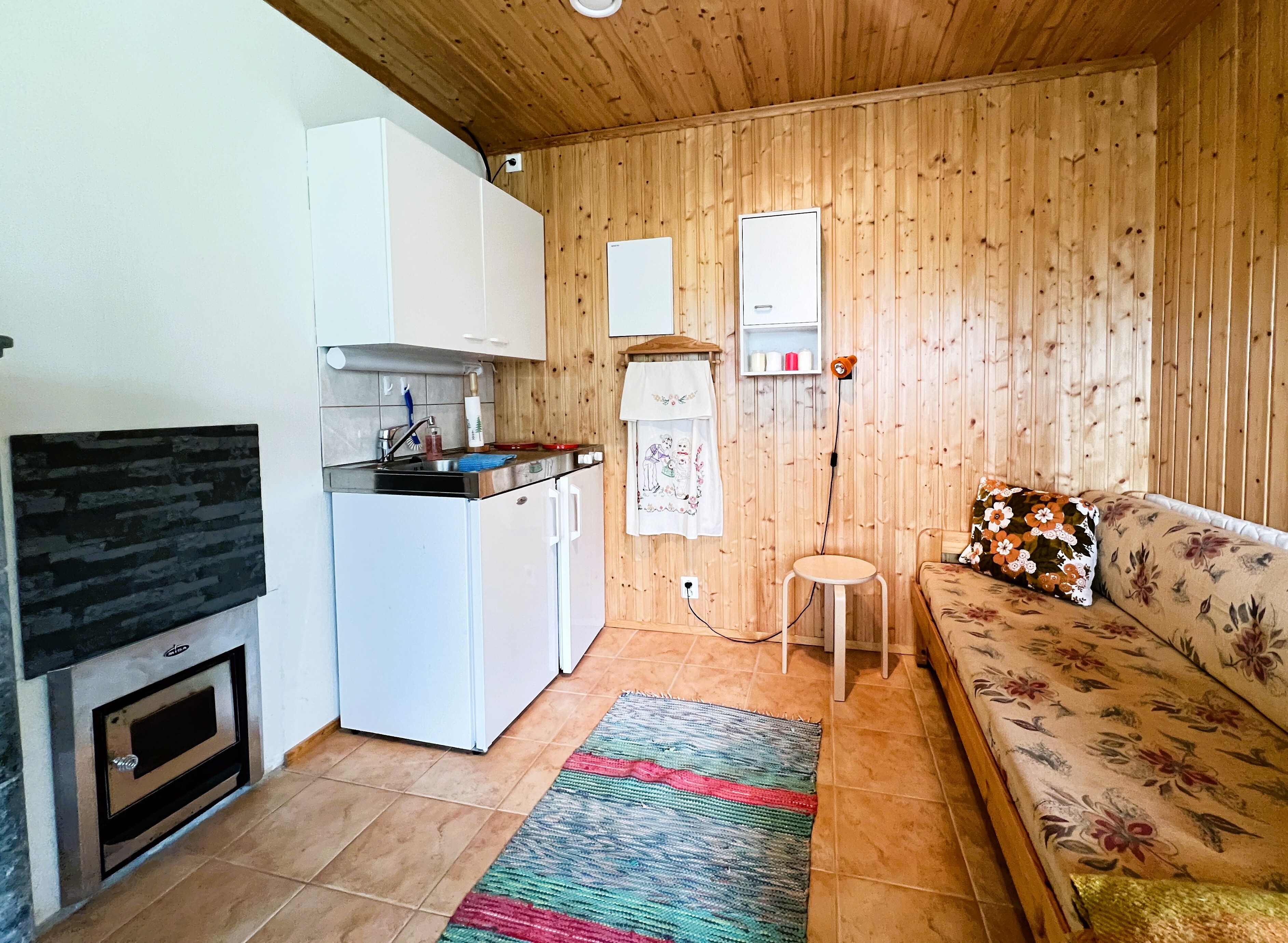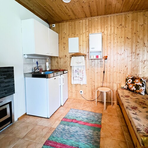 Minikeittiö, varaava takka, puukiuas, lattialämmitys. Mukavuudet: suihku, sisä wc.