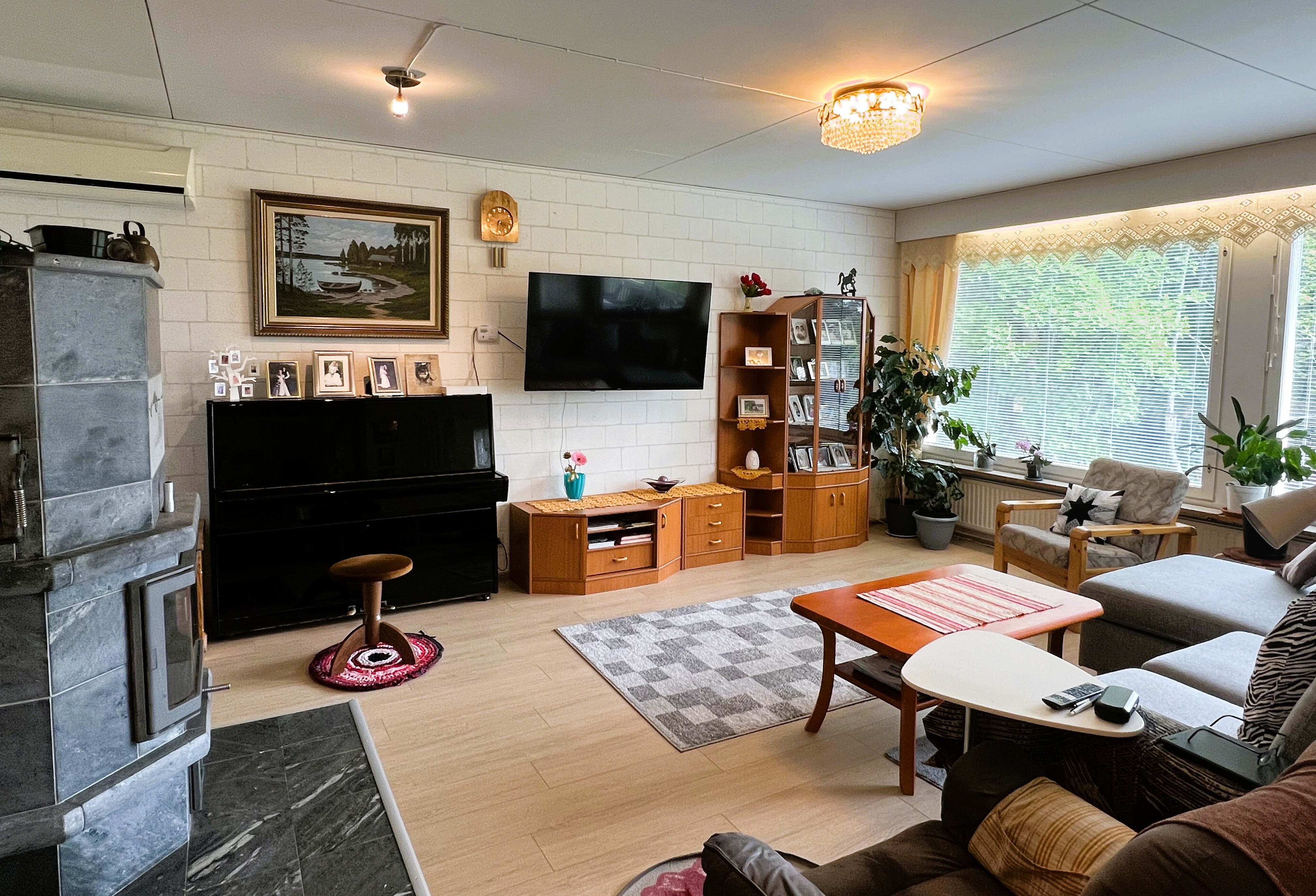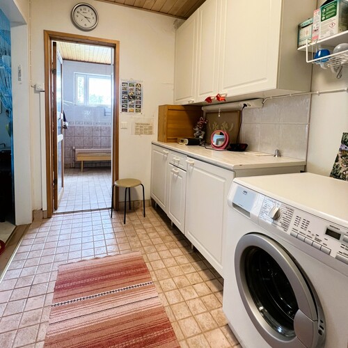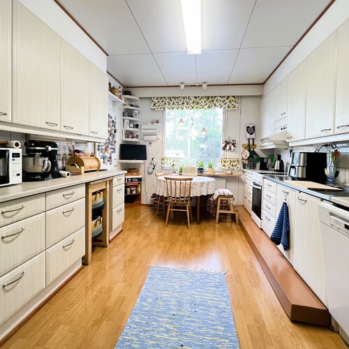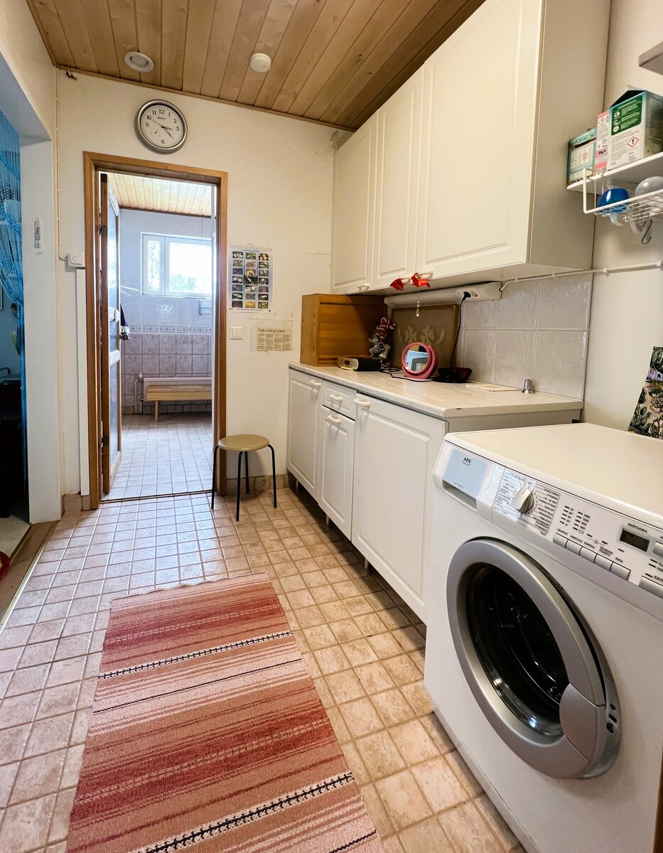 Varaava takka ja leivinuuni luovat lämpimän tunnelman, ja vuonna 2023 asennettu maalämpö pitää asumiskustannukset energiatehokkaina. Kodinhoitohuone, lämmin varasto sekä koneellinen ilmanvaihto lämmön talteenotolla tukevat sujuvaa arkea ympäri vuoden.