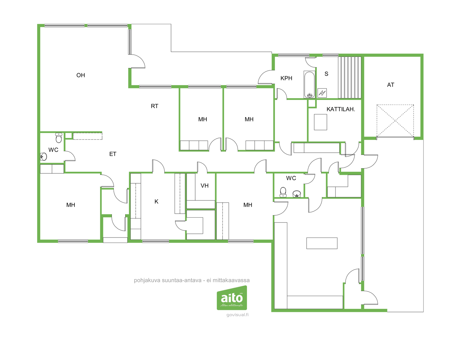 Yli 240 m²:n päärakennus tarjoaa runsaasti tilaa asumiseen ja monipuolisiin käyttötarpeisiin. Olohuone, keittiö ja ruokailutila muodostavat kodin keskeisen oleskelualueen, jossa on tilaa yhdessäololle. Neljä makuuhuonetta, erillinen toimistohuone sekä kaksi wc:tä tuovat joustavuutta perhe-elämään ja etätyöhön.