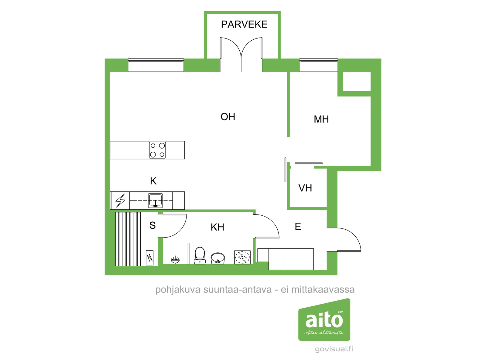 Huoneisto sijaitsee hissitalon neljännessä kerroksessa ja käsittää olohuoneen, keittiön, makuuhuoneen, kylpyhuoneen, oman saunan sekä vaatehuoneen. Olohuone ja keittiö muodostavat avaran ja yhtenäisen oleskelutilan, jossa parkettilattia ja suuret ikkunat tuovat tilaan valoa ja avaruutta. Olohuoneesta on käynti parvekkeelle, joka tuo lisätilaa asumiseen ja tarjoaa mukavan paikan hengähtää keskusta-asumisesta huolimatta.