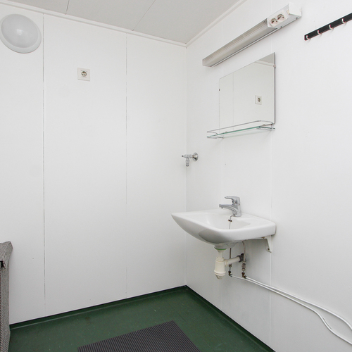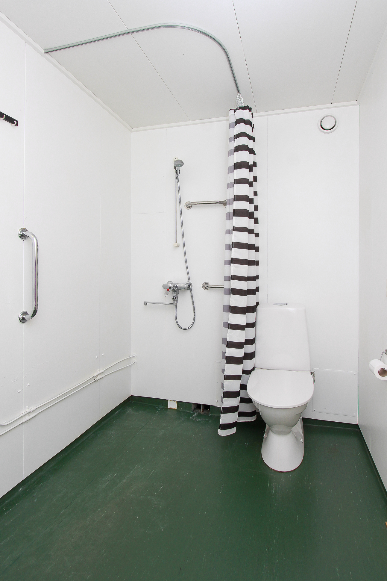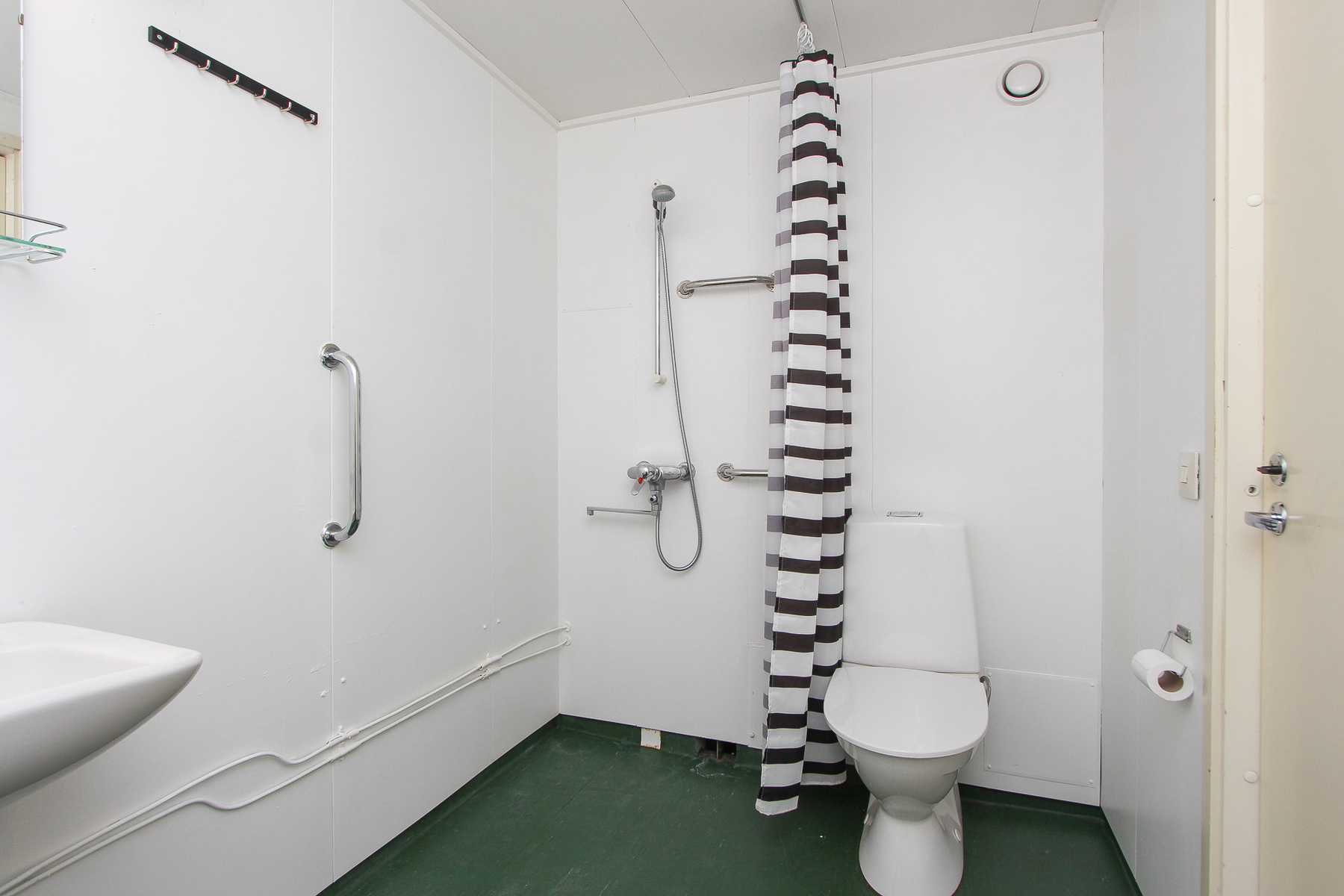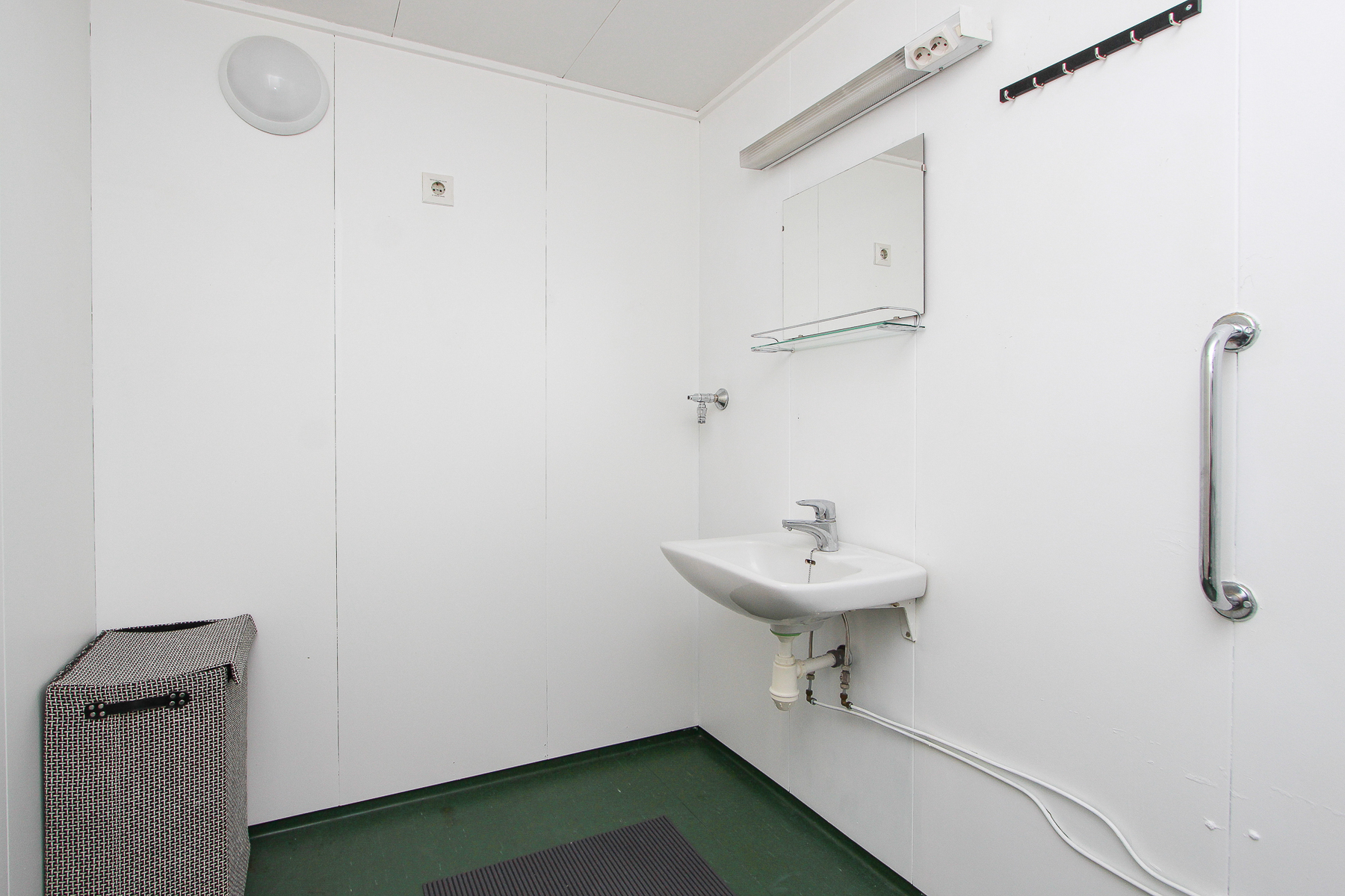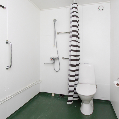 Lattia muovimattoa. Peltielementtiseinät. Suihku, wc-istuin, käsiallas, peili, pesukoneliitäntä.