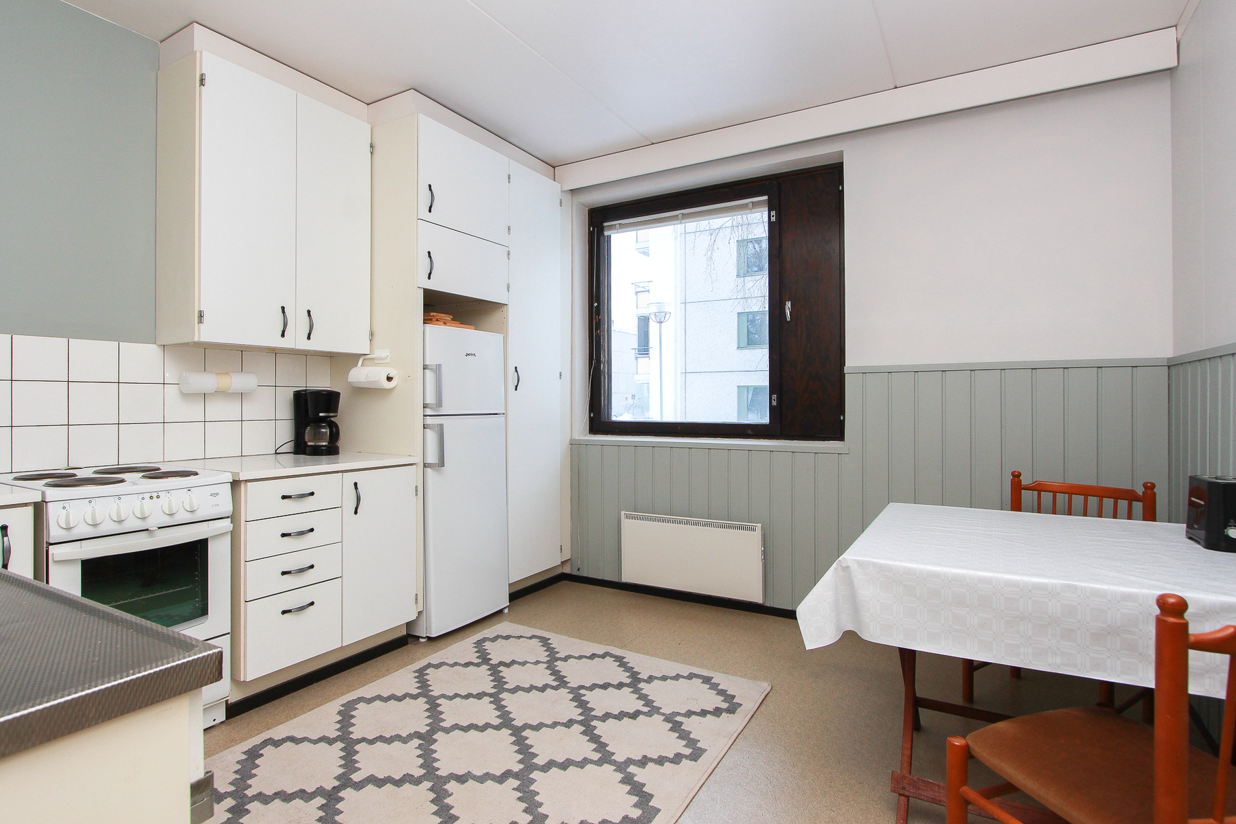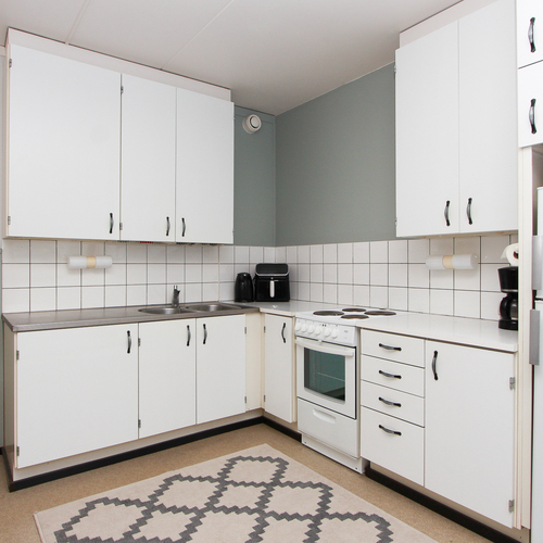 Vaaleat kaapistot. Laminaattitasot. Jääkaappi/pakastin, sähköliesi. Lattia muovimattoa. Seinät ja puolipaneelit maalattu 2025.