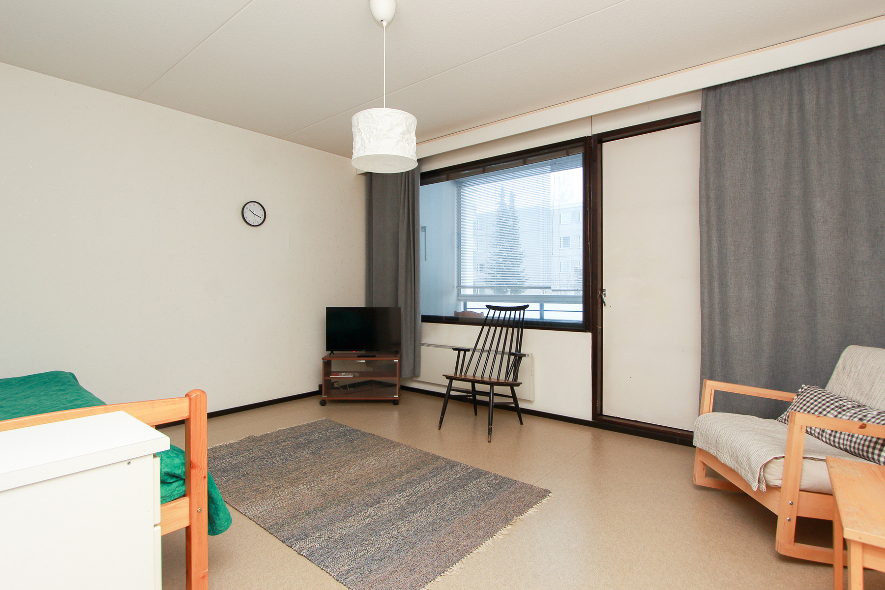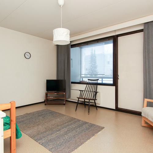Lattia muovimattoa. Seinät tapetoitu. Olohuoneesta käynti lasitetulle parvekkeelle.