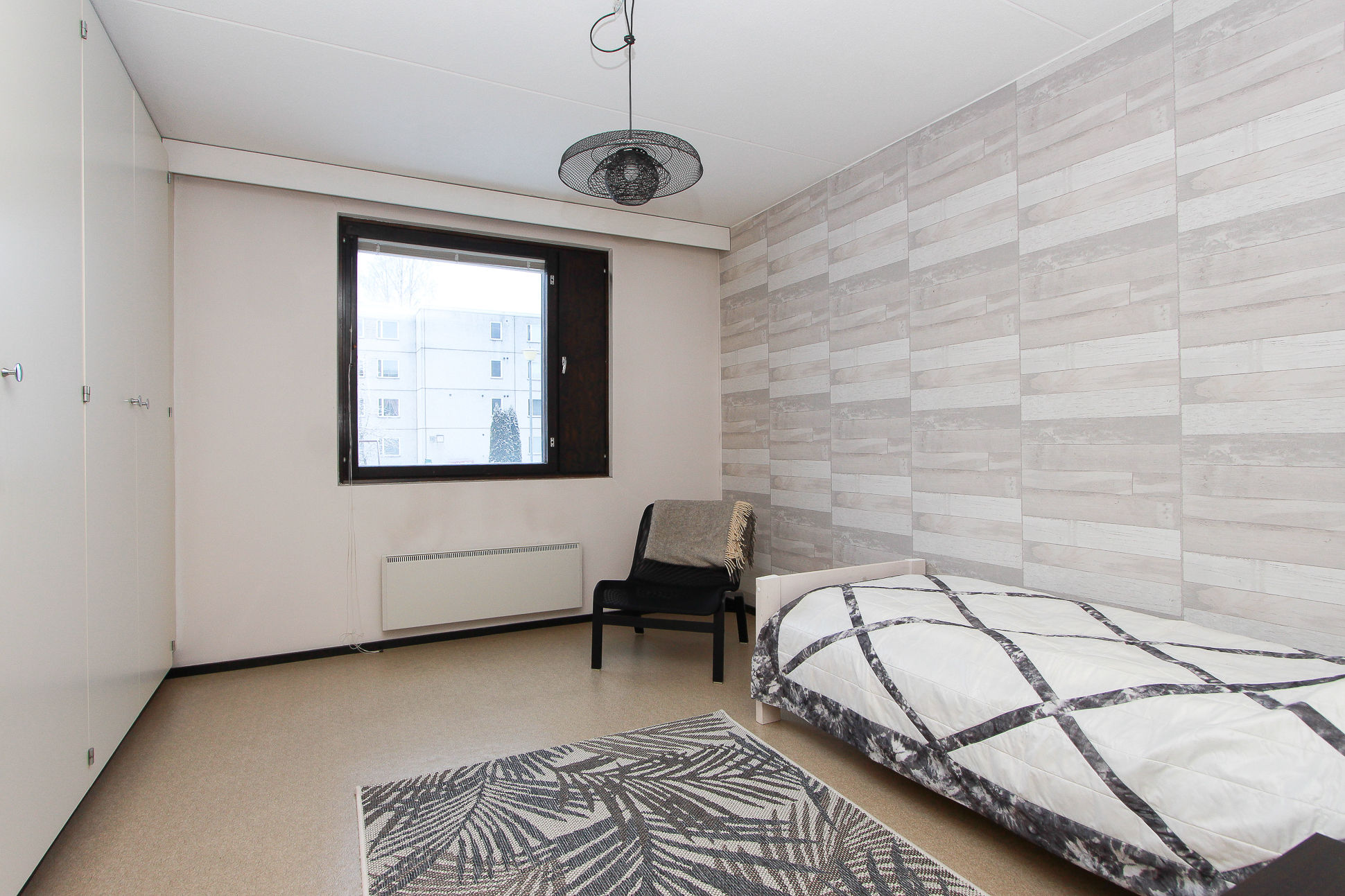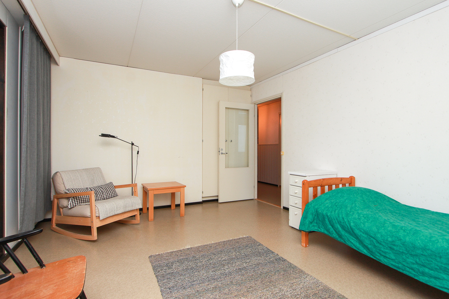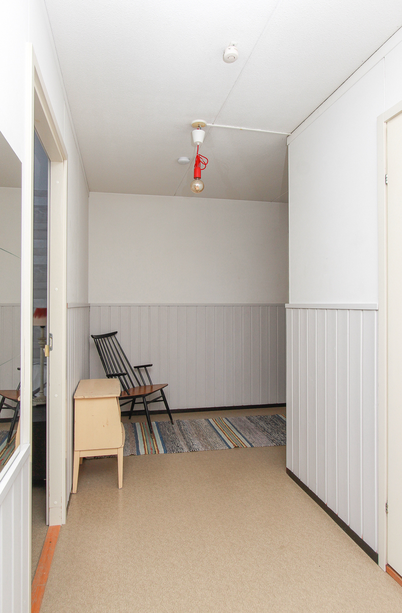 Lattia muovimattoa. Seinät tapettia. Makuuhuoneessa komerot.