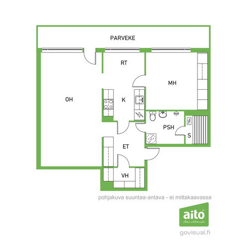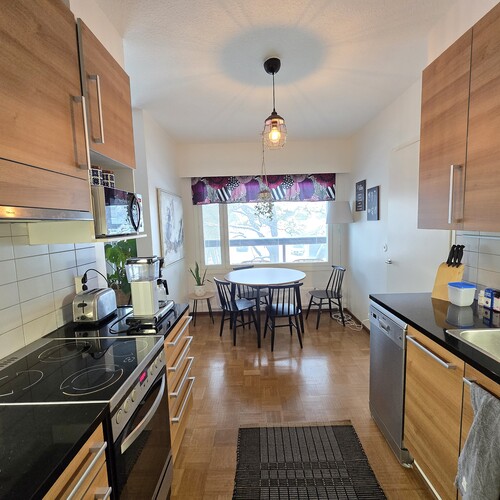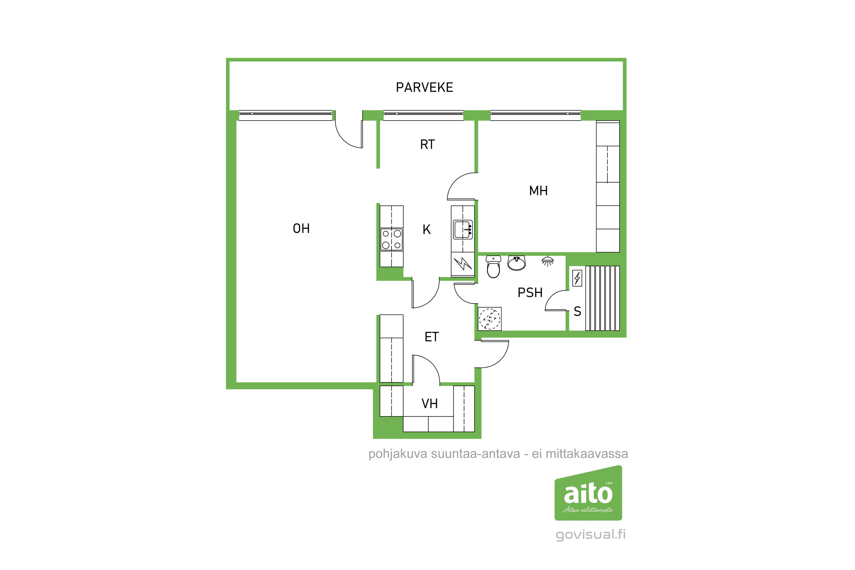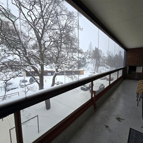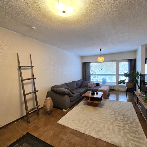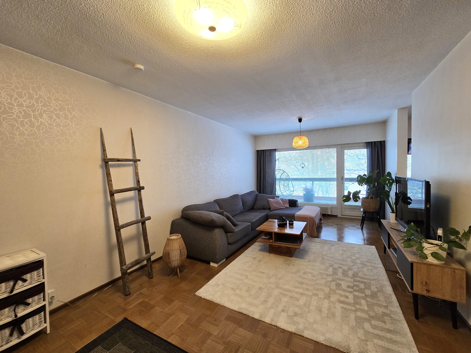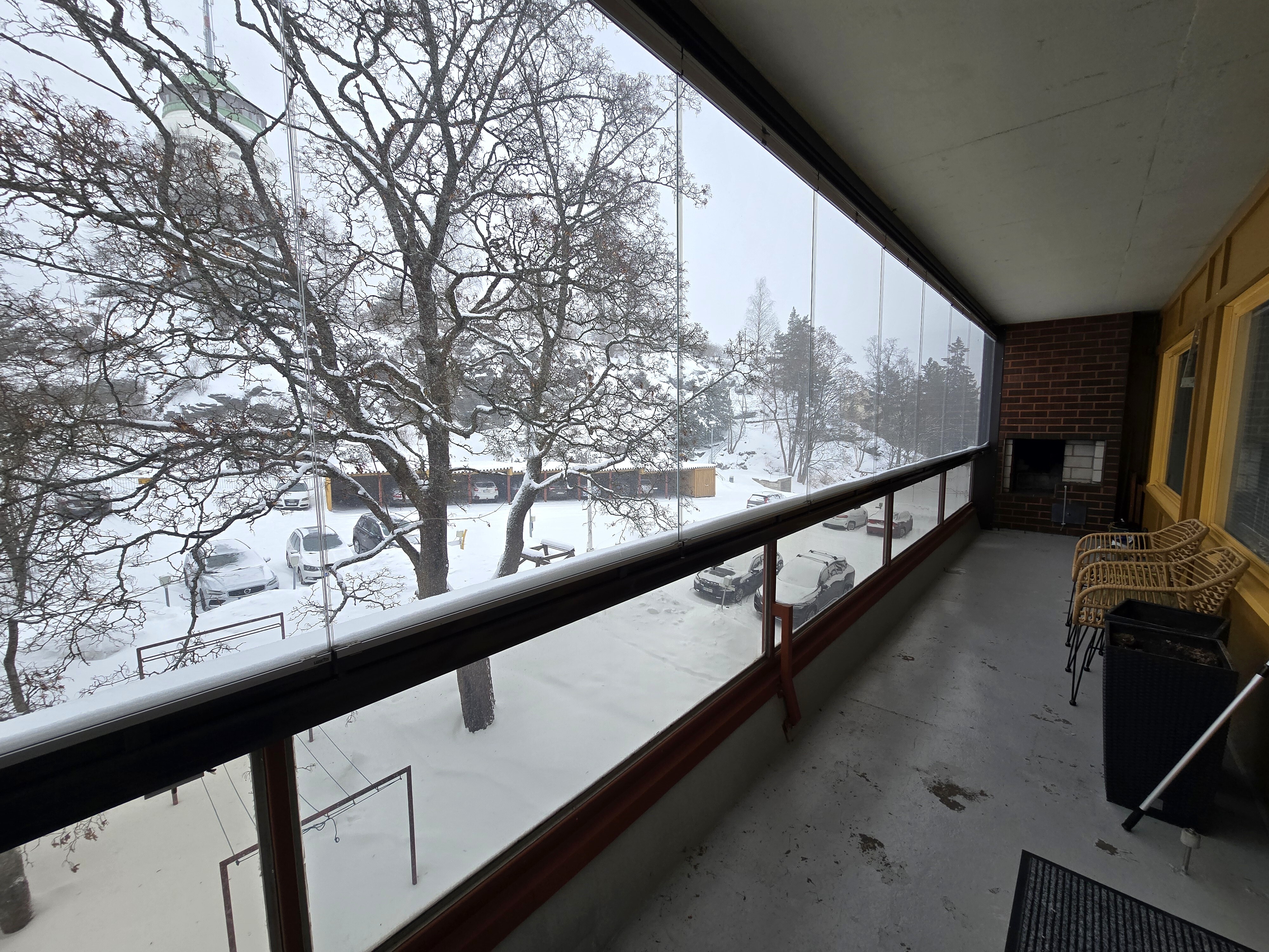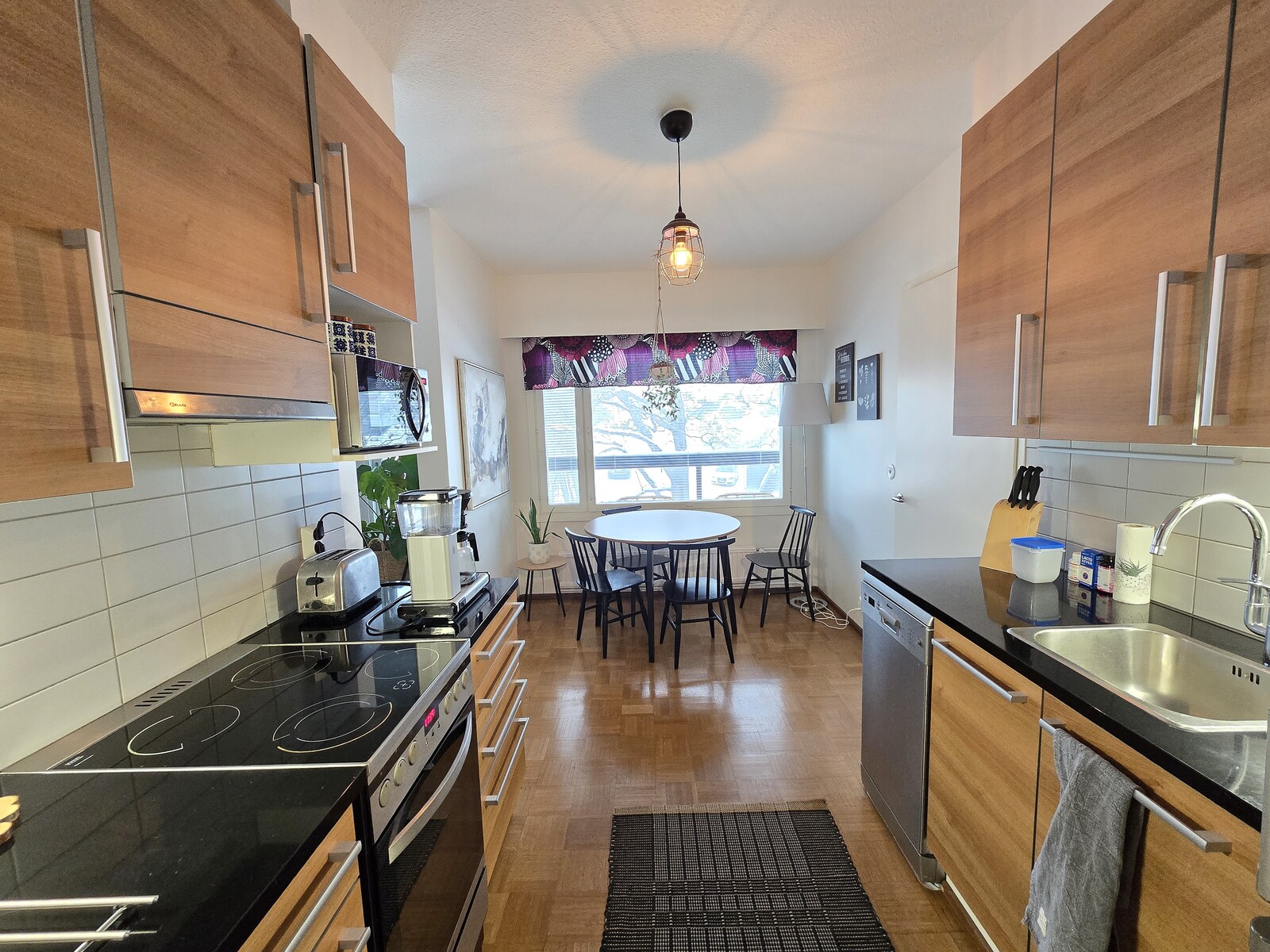 Huoneisto on yksitasoinen ja tilaratkaisu on selkeä. Keittiö tarjoaa hyvin työ- ja säilytystilaa, ja ruokailuryhmälle jää luonteva paikka ikkunan ääreen. Olohuone on avara ja valoisa, ja siitä on käynti lasitetulle parvekkeelle, joka suuntautuu länteen sisäpihan puolelle. Parveke tuo lisätilaa asumiseen ja mahdollistaa viihtyisän oleskelun keväästä pitkälle syksyyn.