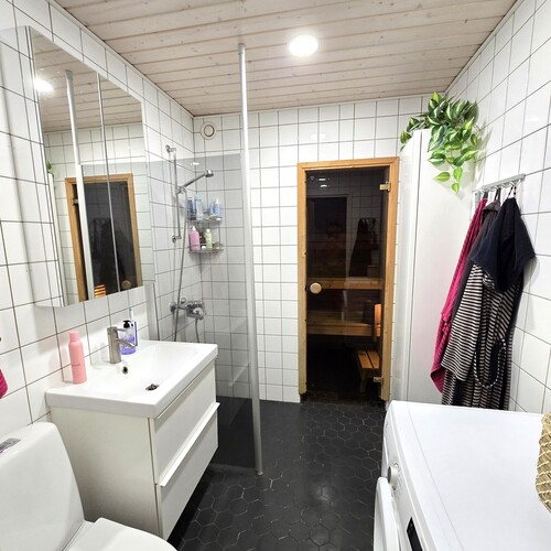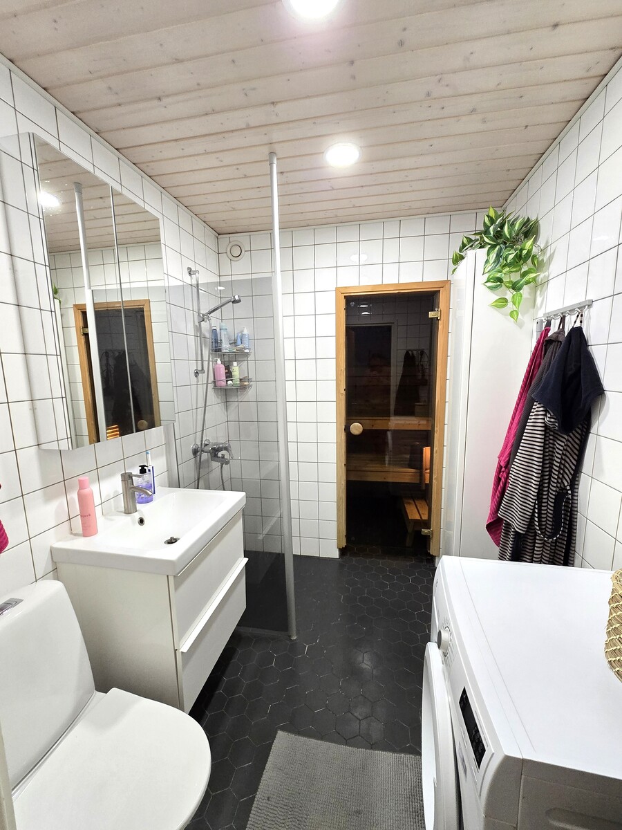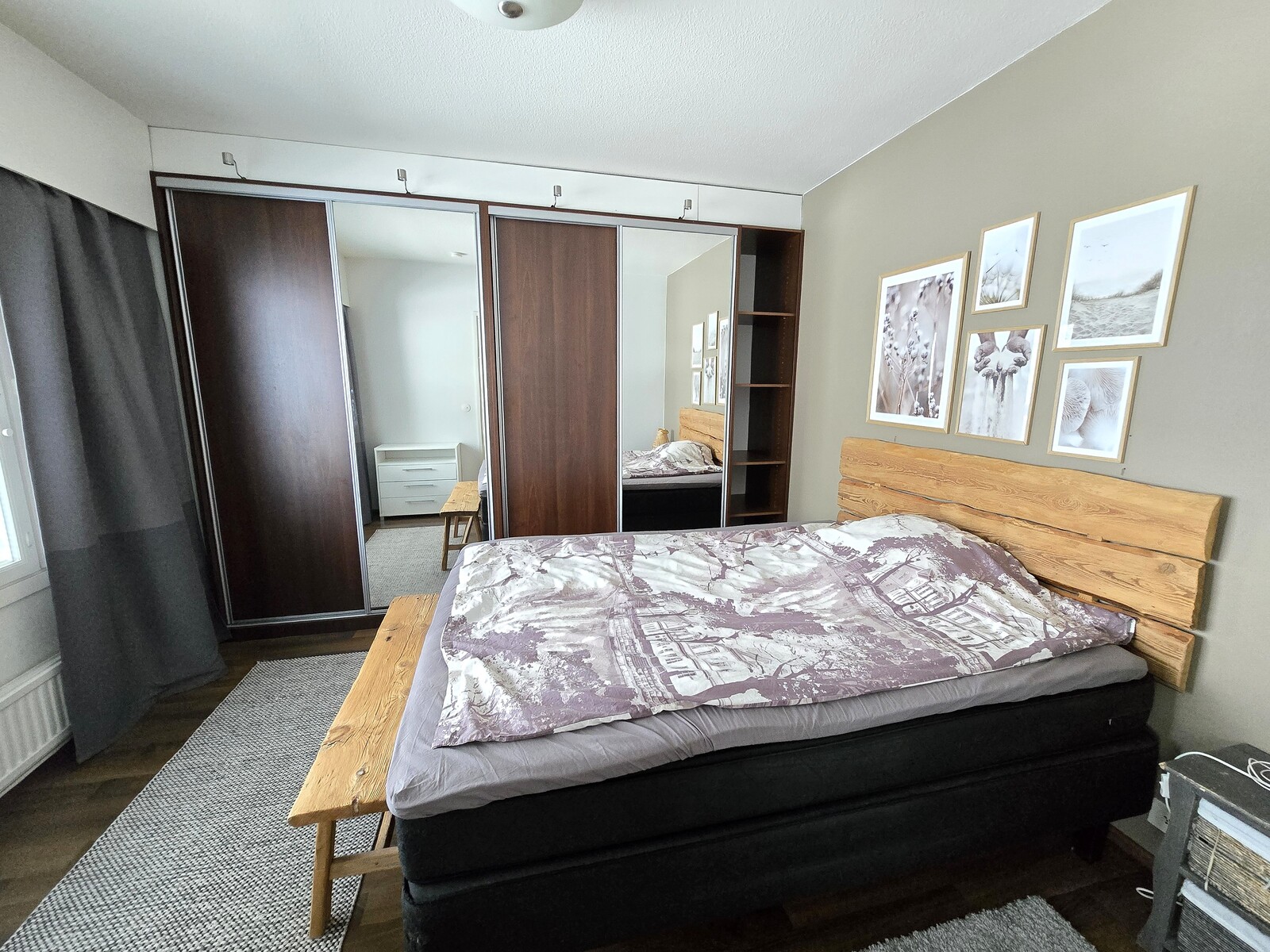 Makuuhuone on rauhallinen ja tilava, ja säilytystilaa täydentää huoneiston muut säilytysratkaisut. Oma sauna lisää asumismukavuutta ja tekee kokonaisuudesta houkuttelevan myös pitkäaikaiseen käyttöön.
