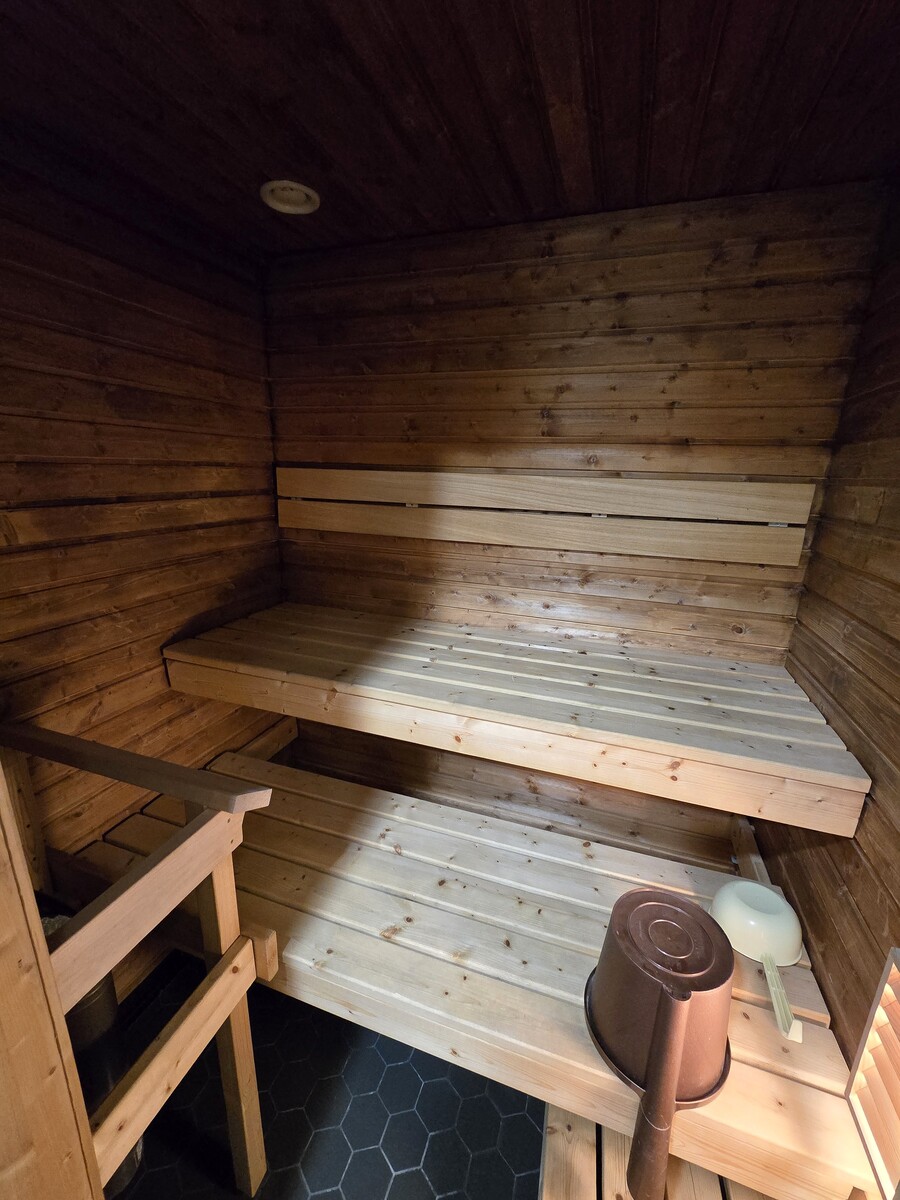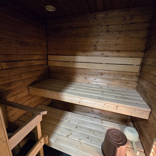 Sauna paneloitu, sähkökiuas, kokolasinen ovi.