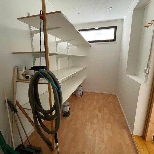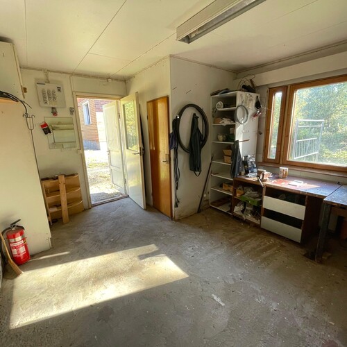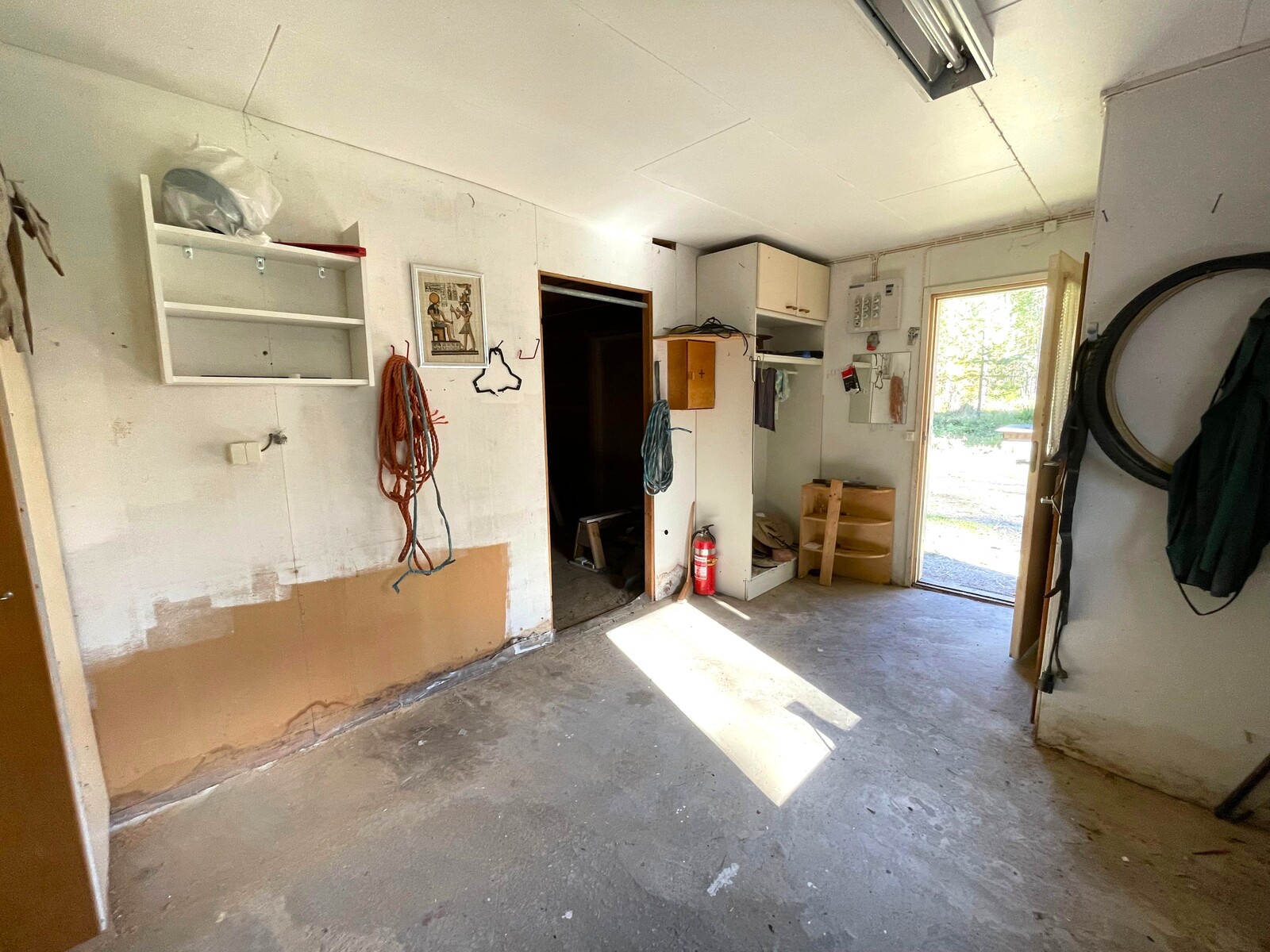 Noin 30 m²:n varasto/verstas, joka palvelee esimerkiksi työtilana tai säilytyksessä.