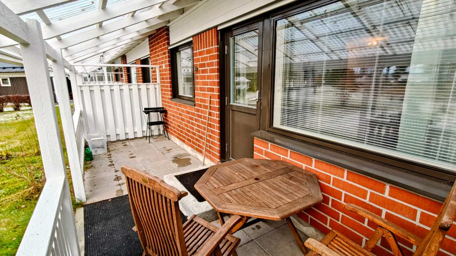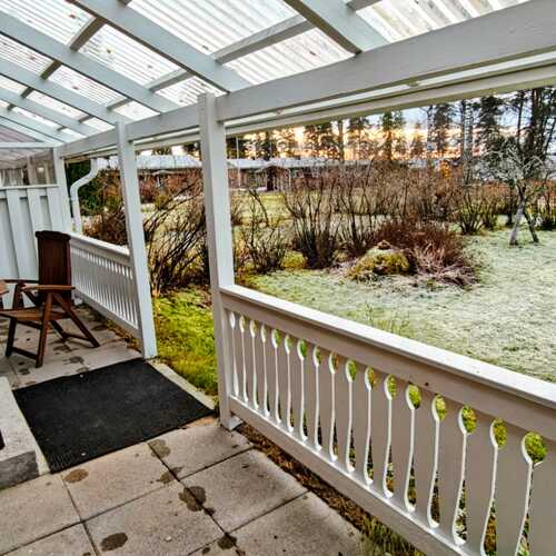Rauhalliselle puistoalueelle lännen suuntaan aukeava valokatteellinen terassi.