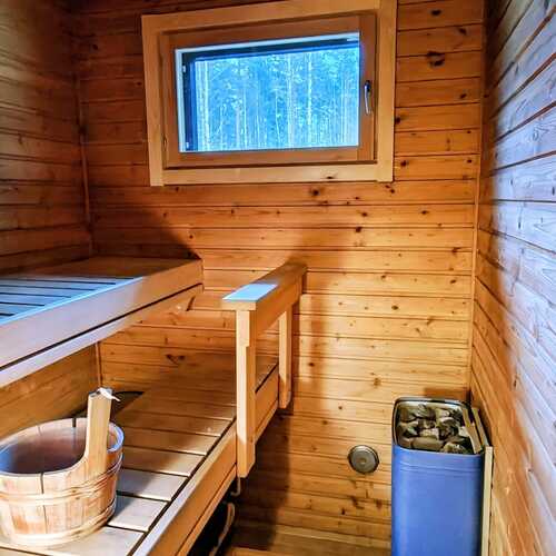 Sähkökäyttöinen kiuas, ikkuna ulos, puukehyksinen lasiovi.