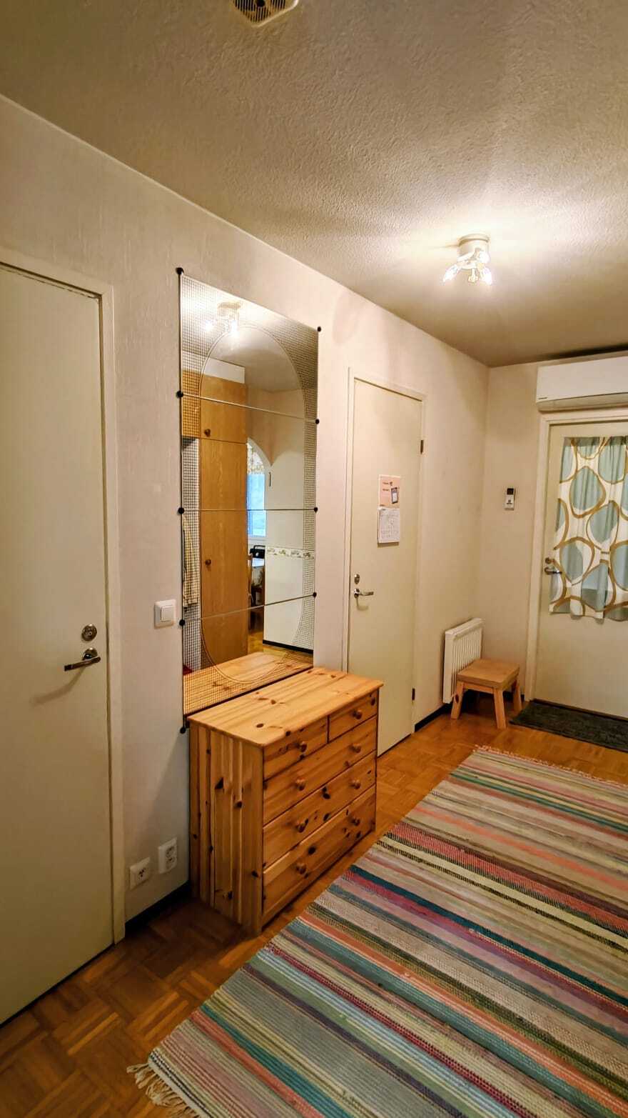 Pintamateriaalit: lattia tammiparketti, seinät tapetti, katto maalattu rakennuslevy.
