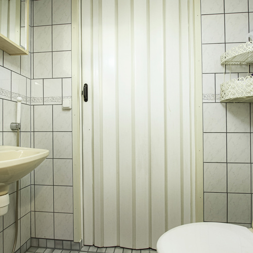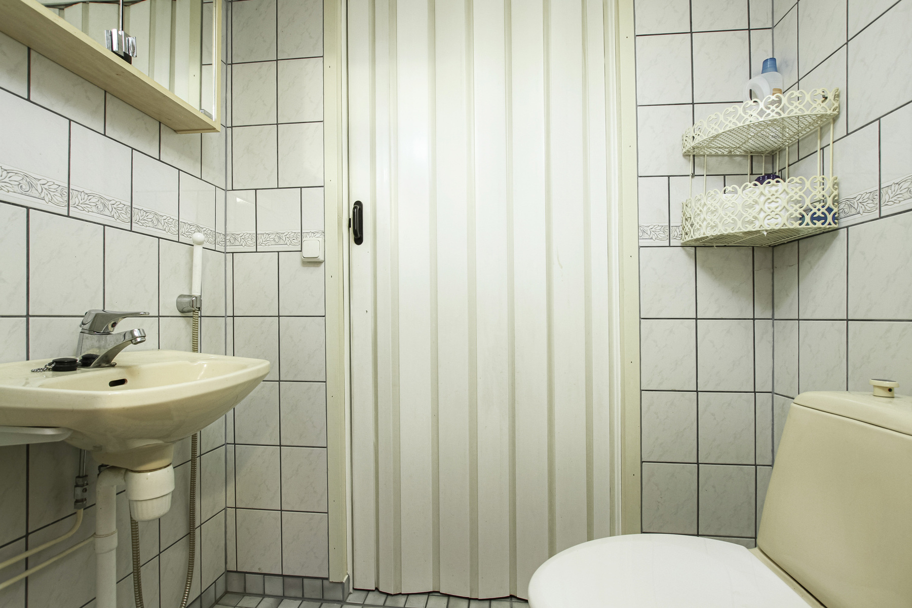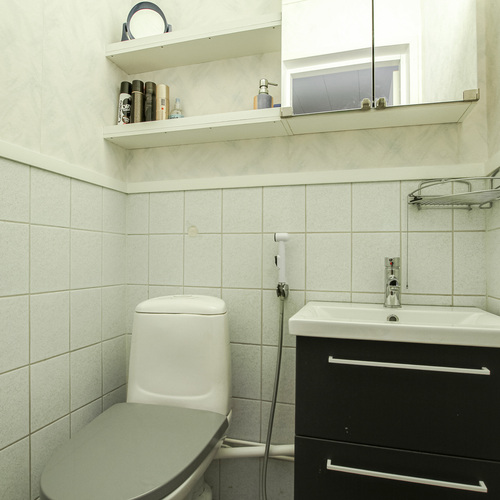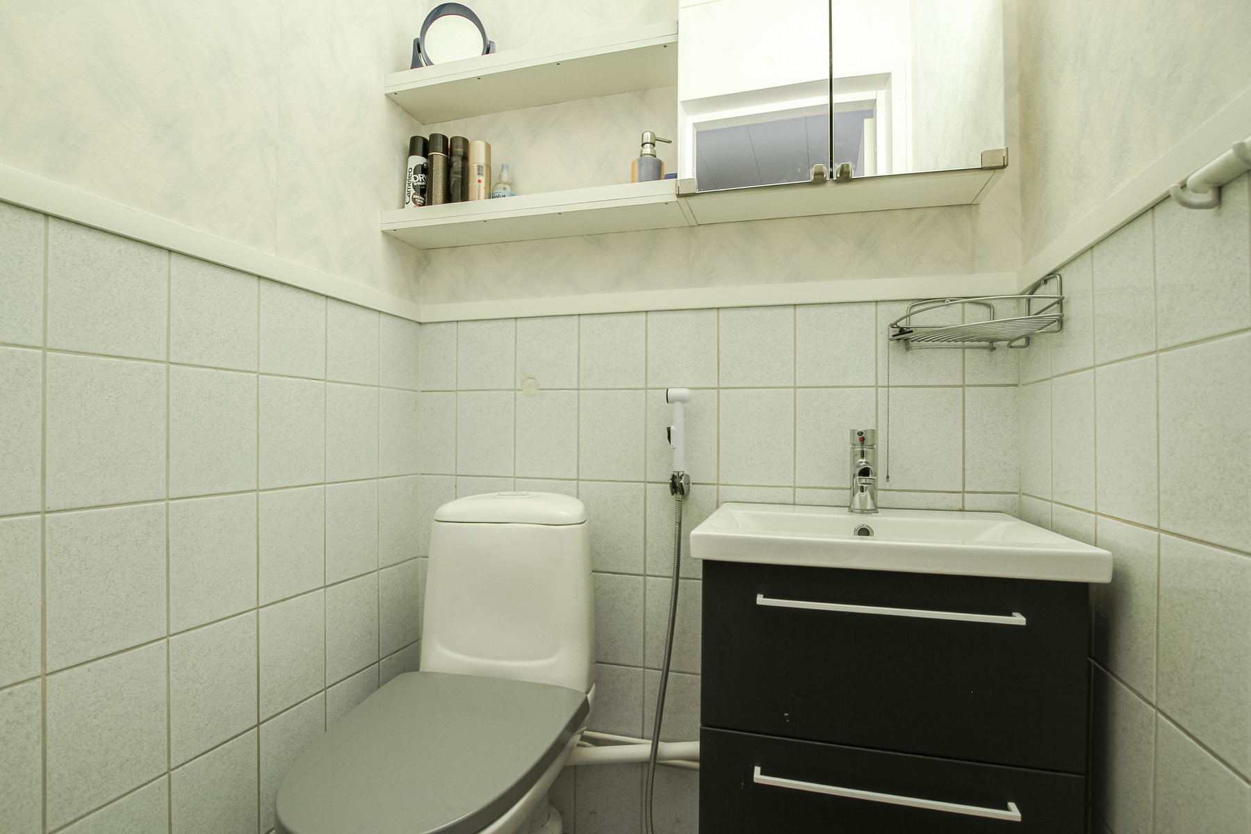 Varusteet: lattiaan asennettu WC, peilikaappi, allaskaappi, bidee