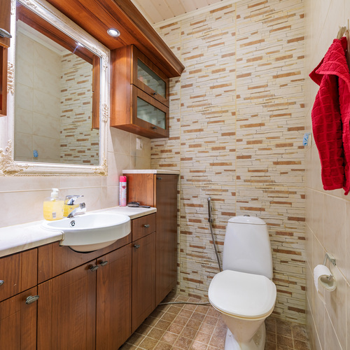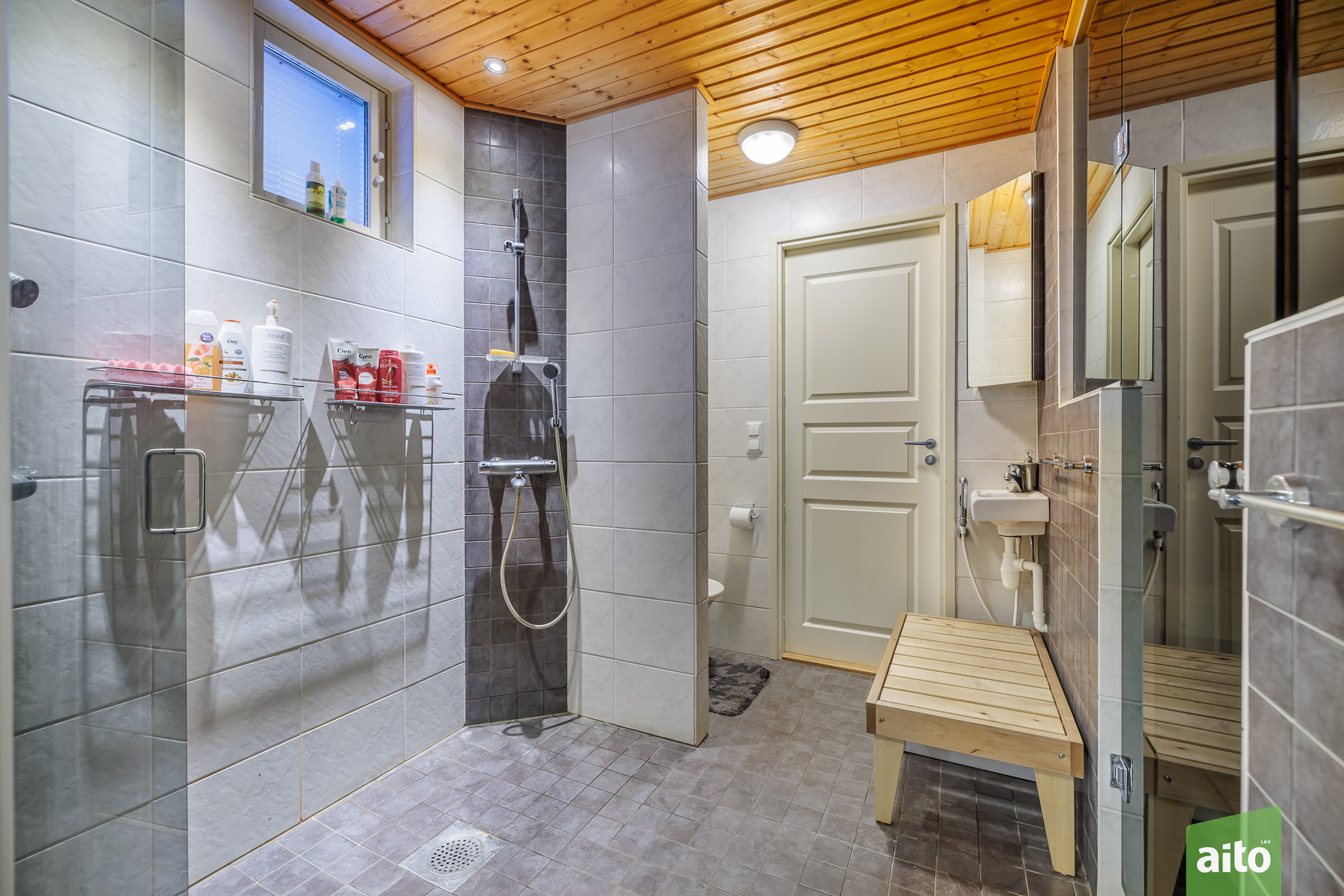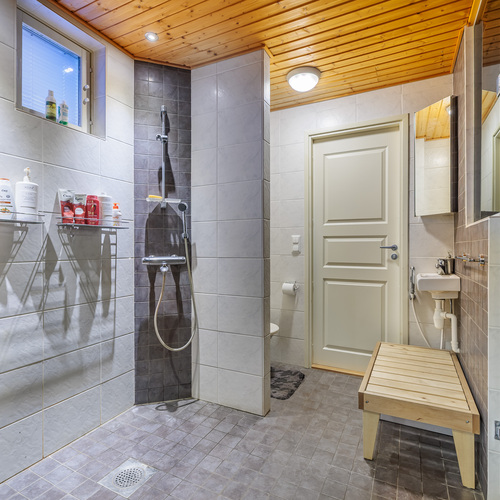 Varusteet: lattiaan asennettu WC, bidee, lattialämmitys, lattiakaivo, peili, allaskaappi, peilikaappi