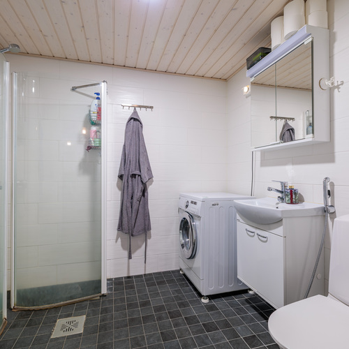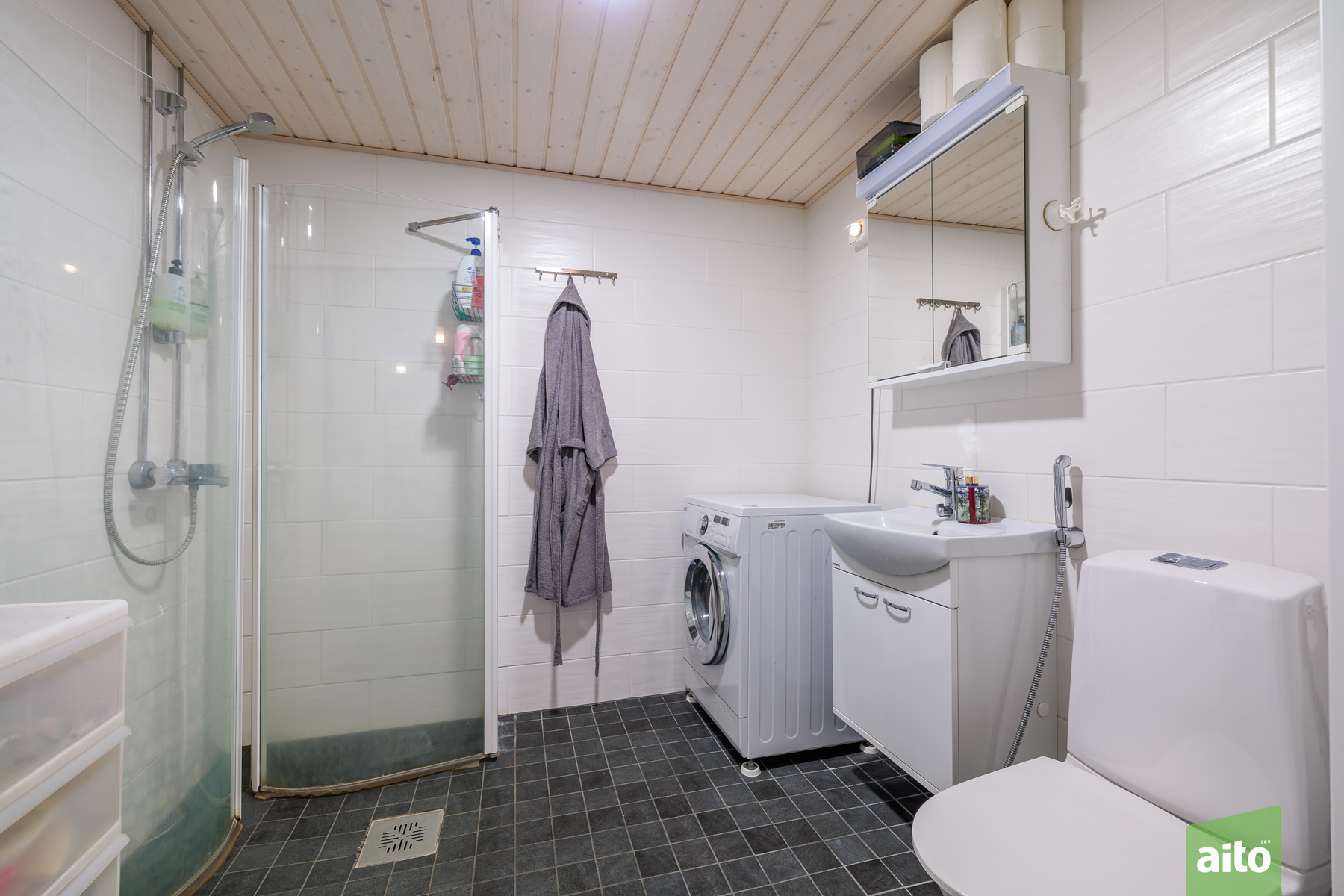 Kylpyhuoneen kuvaus Varusteet: suihku, suihkuseinä, pesukoneliitäntä, kylpyhuonekaapistot, allaskaappi, peilikaappi, lattialämmitys