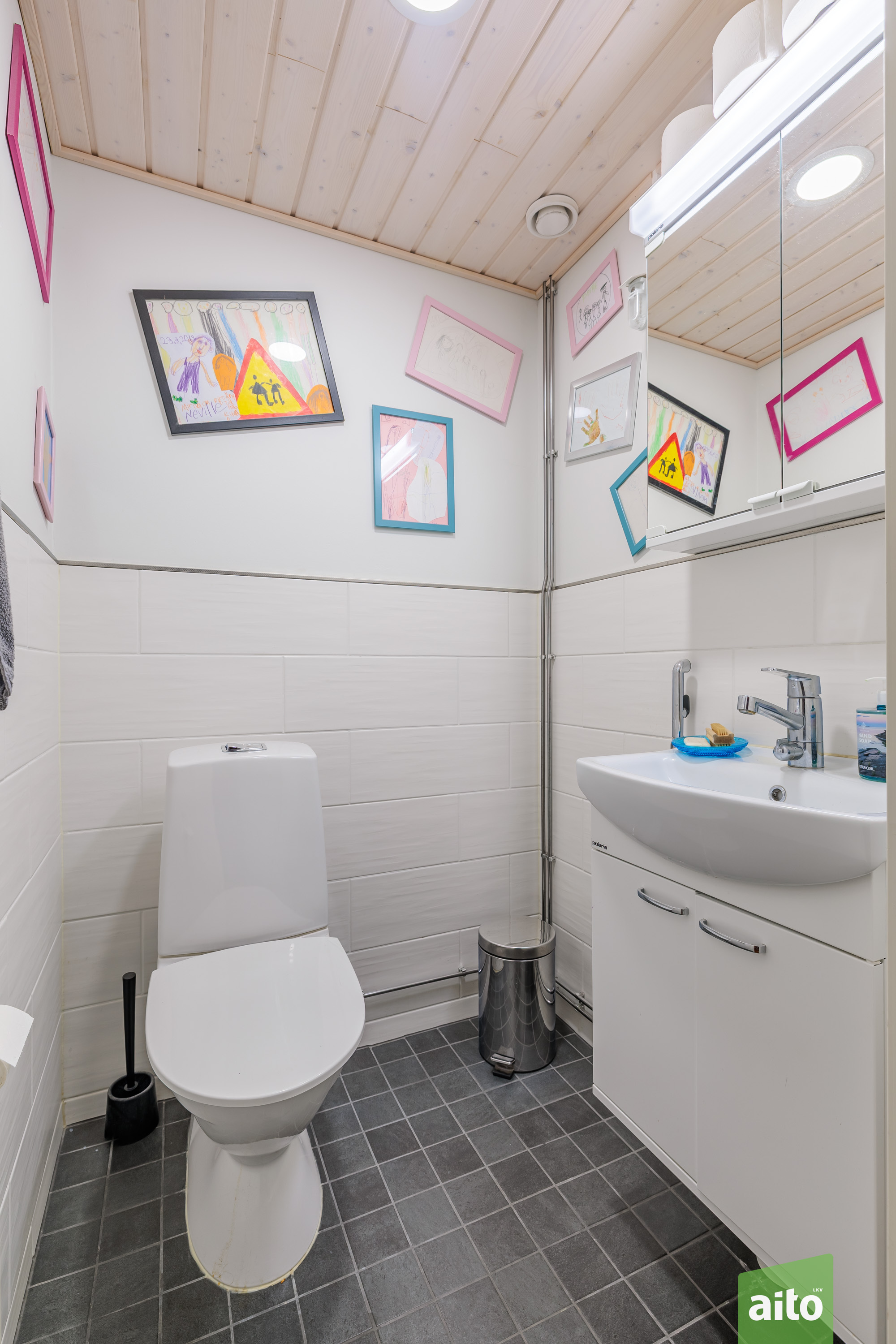 Varusteet: lattiaan asennettu WC, bidee, allaskaappi, peilikaappi