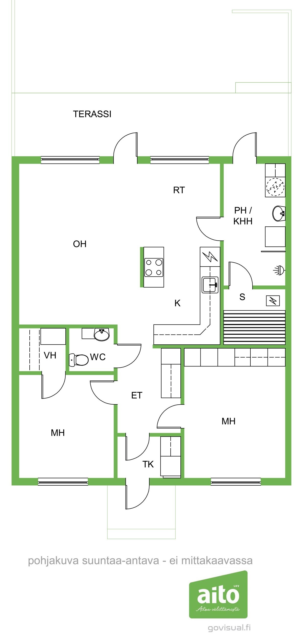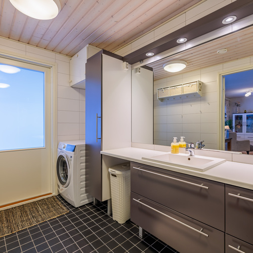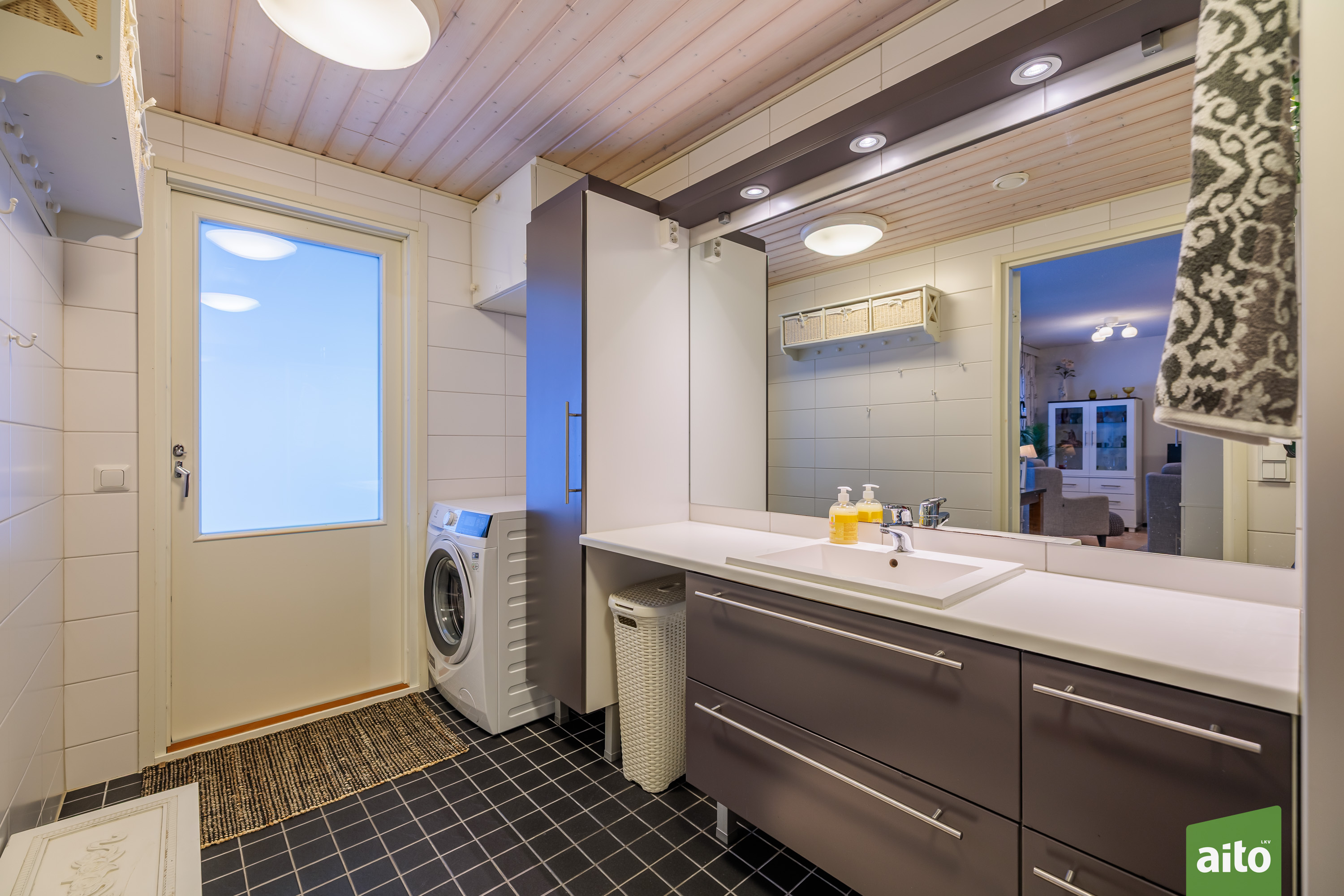 Varusteet: pesukoneliitäntä, pyykkikaapit, pöytätaso, pesuallas, lattialämmitys, uloskäynti