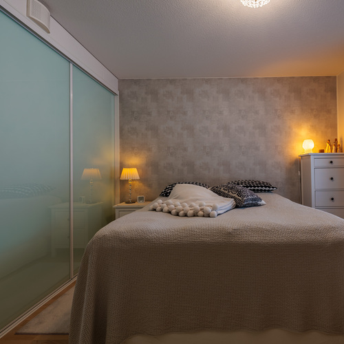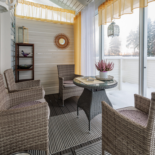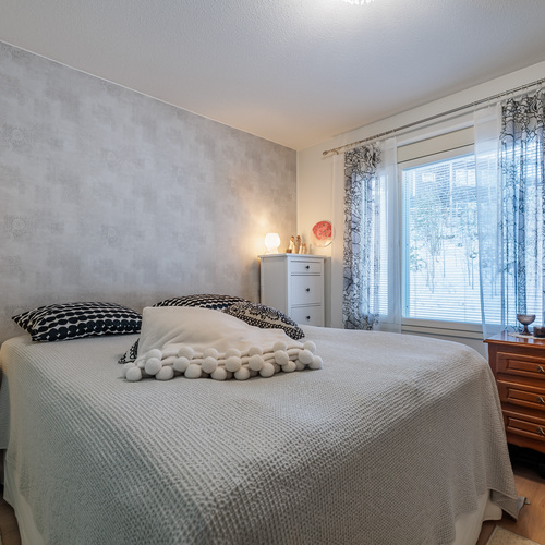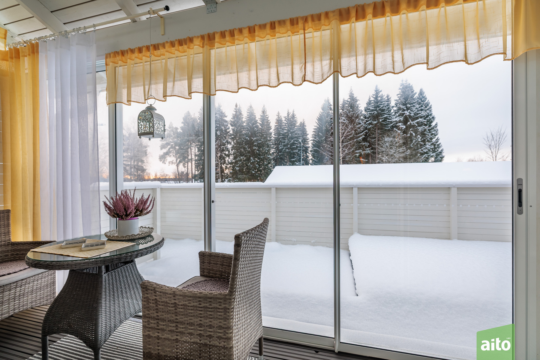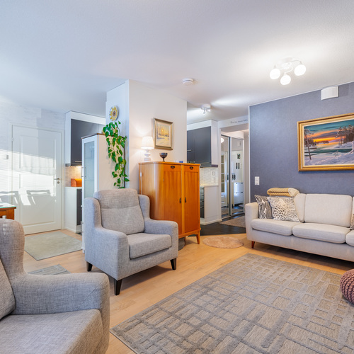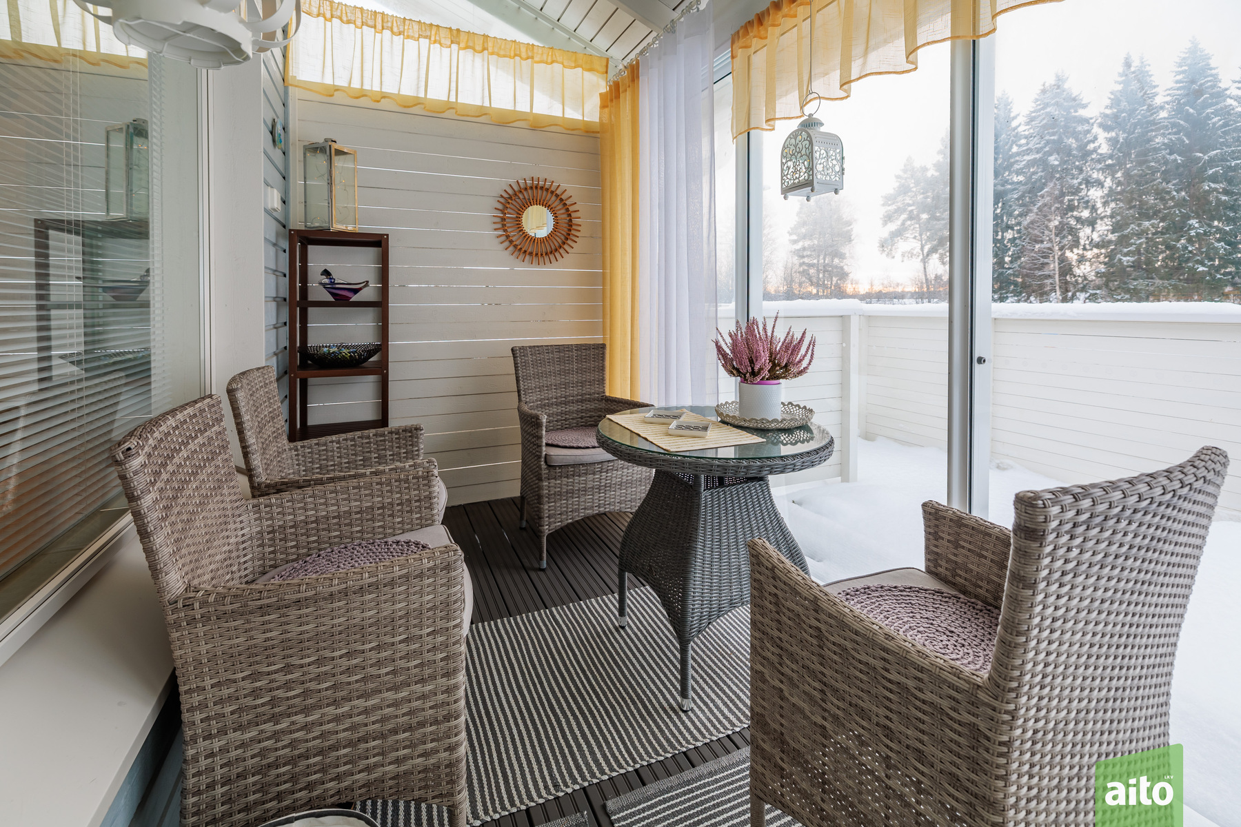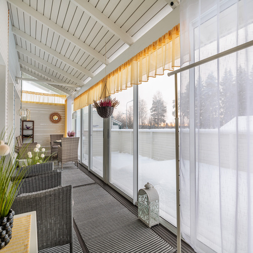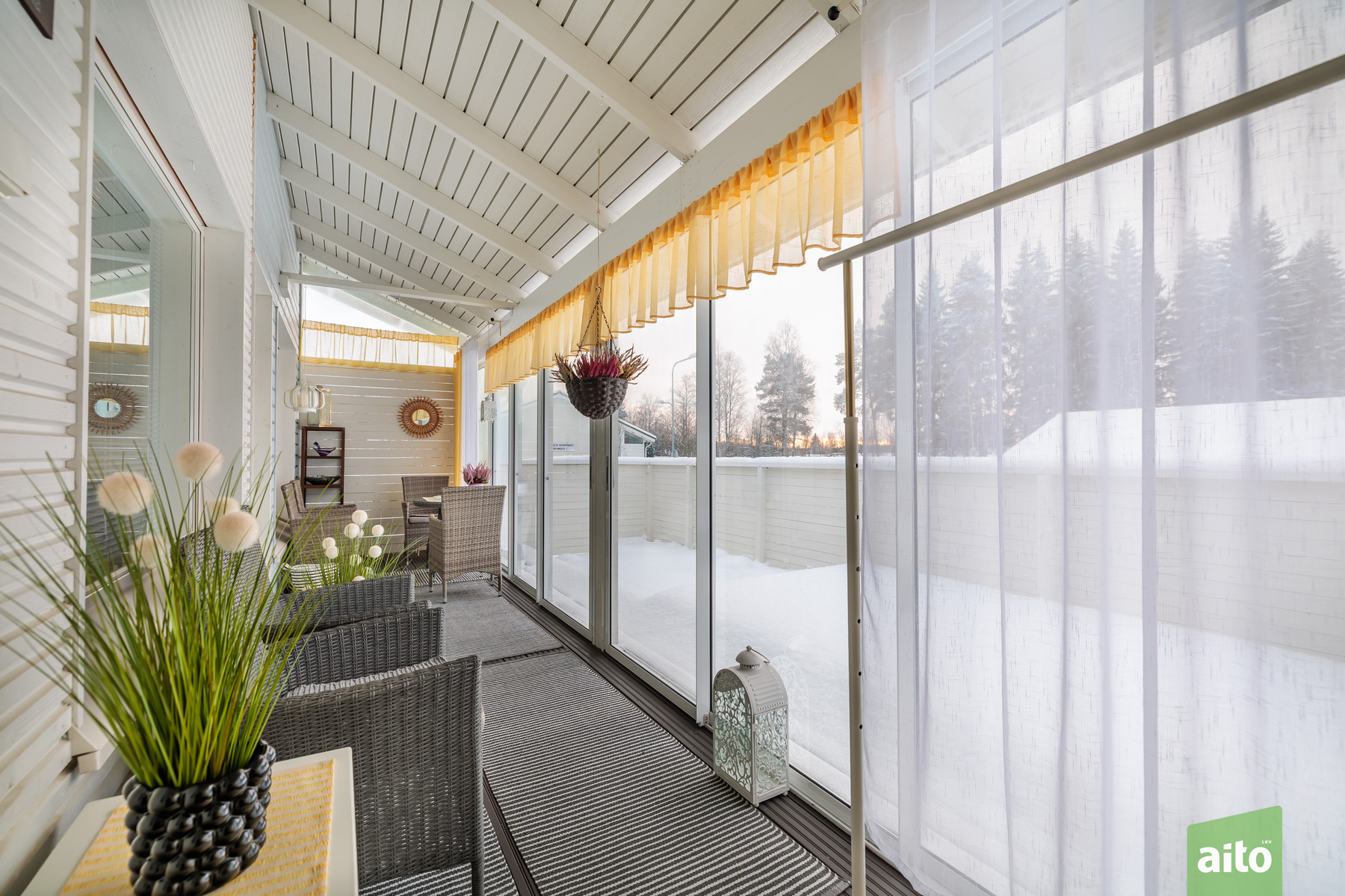 Kodikas olohuone avautuu suurelle suojaisalle lasitetulle terassille, joka toimii lisähuoneena pitkälle syksyyn. Keittiössä on runsaasti säilytystilaa ja laadukkaat kodinkoneet, ja kaksi makuuhuonetta tarjoavat hyvät säilytysratkaisut liukuovikaapistojen ansiosta. Kylpyhuoneen yhteydessä on kätevä kodinhoitotila sekä käynti terassille.