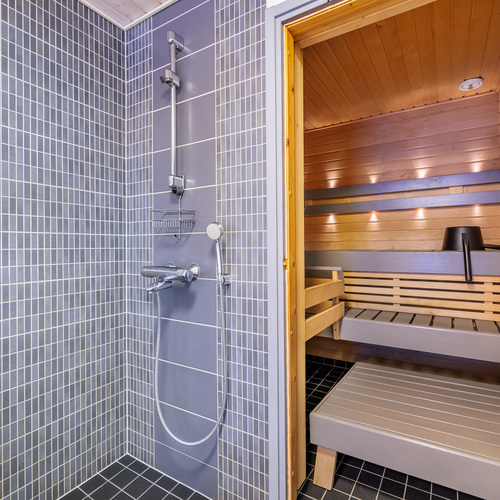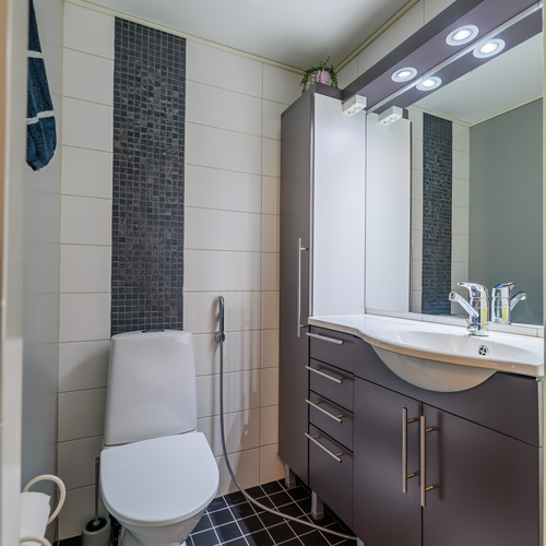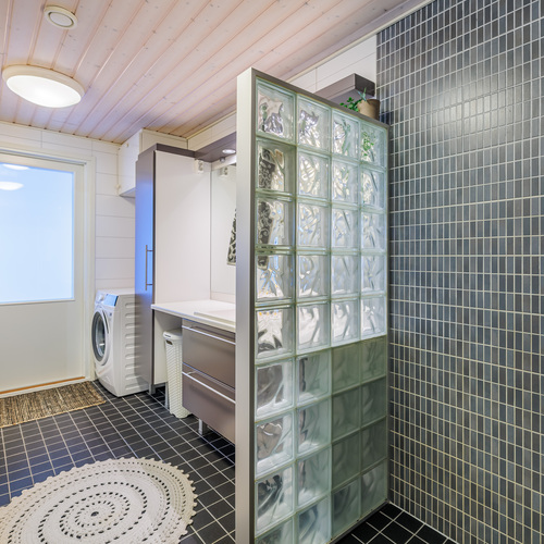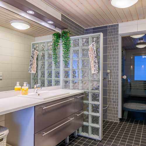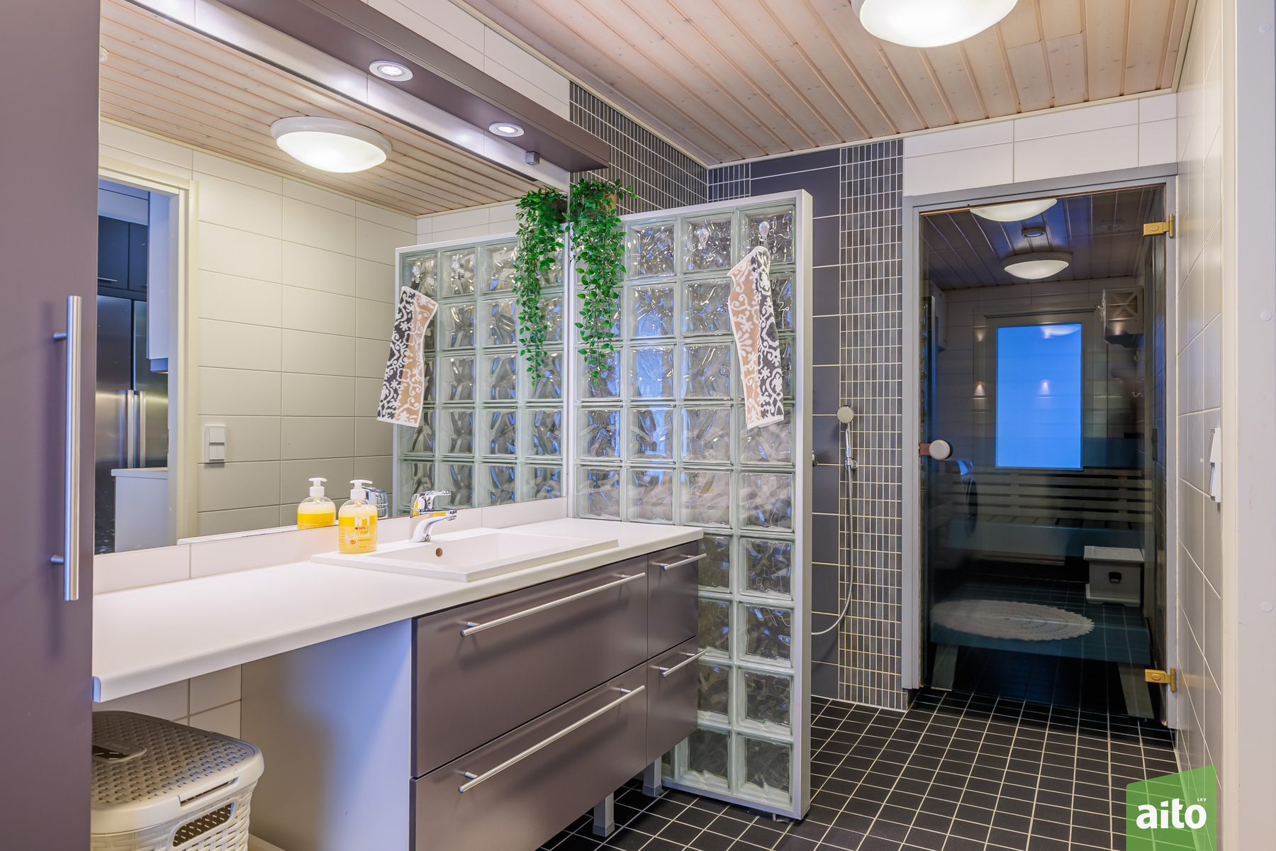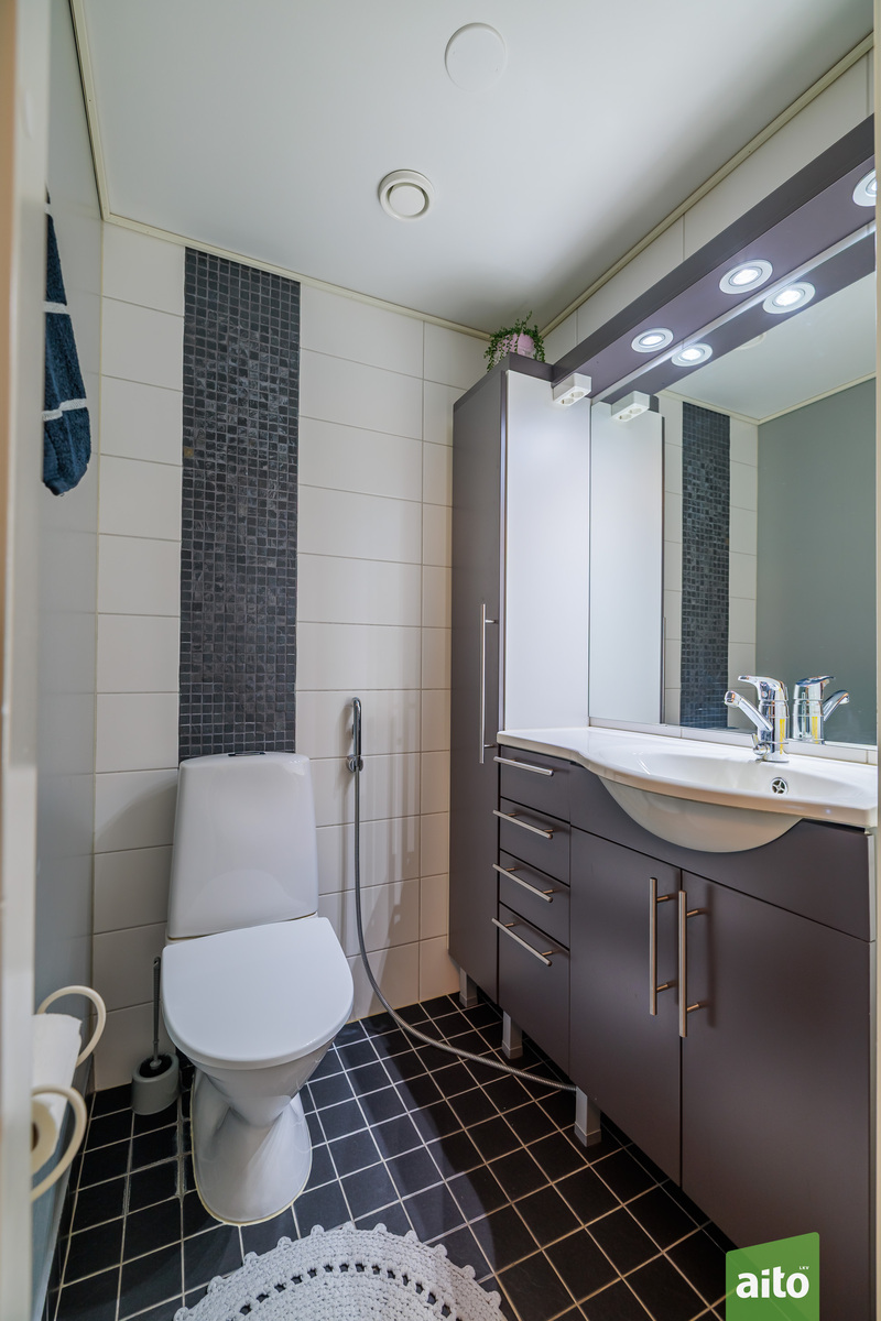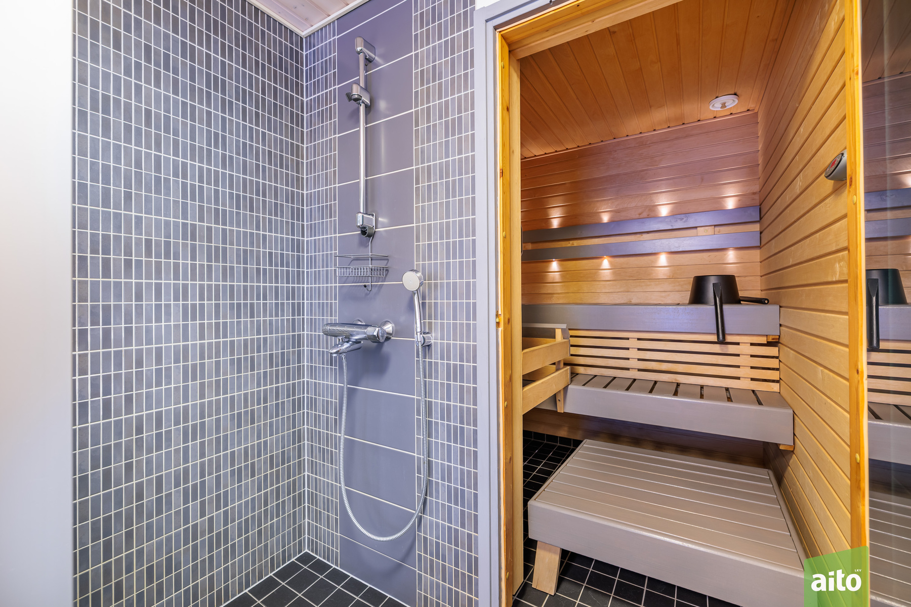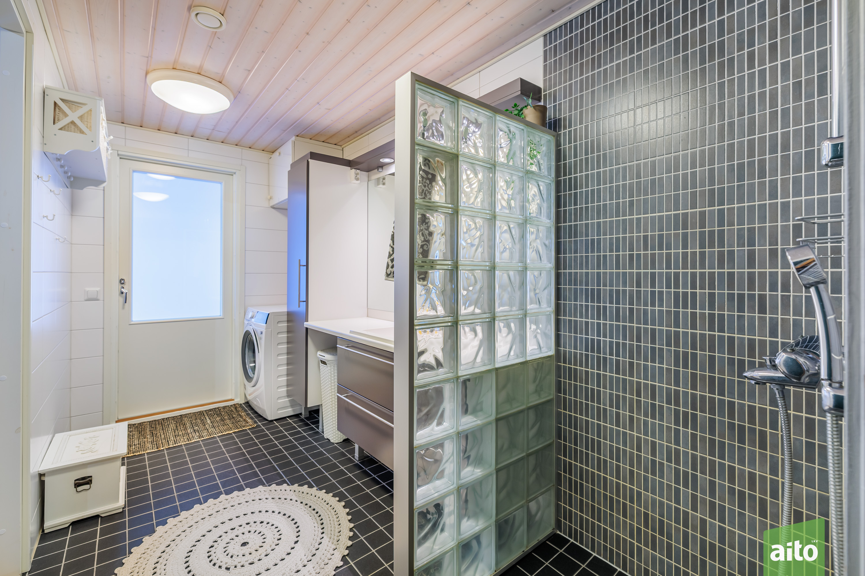 Varusteet: suihku, suihkuseinä, lattialämmitys, pesukoneliitäntä, kylpyhuonekaapistot