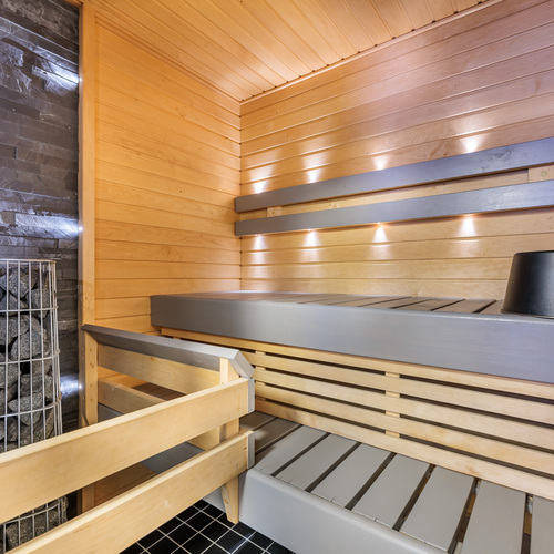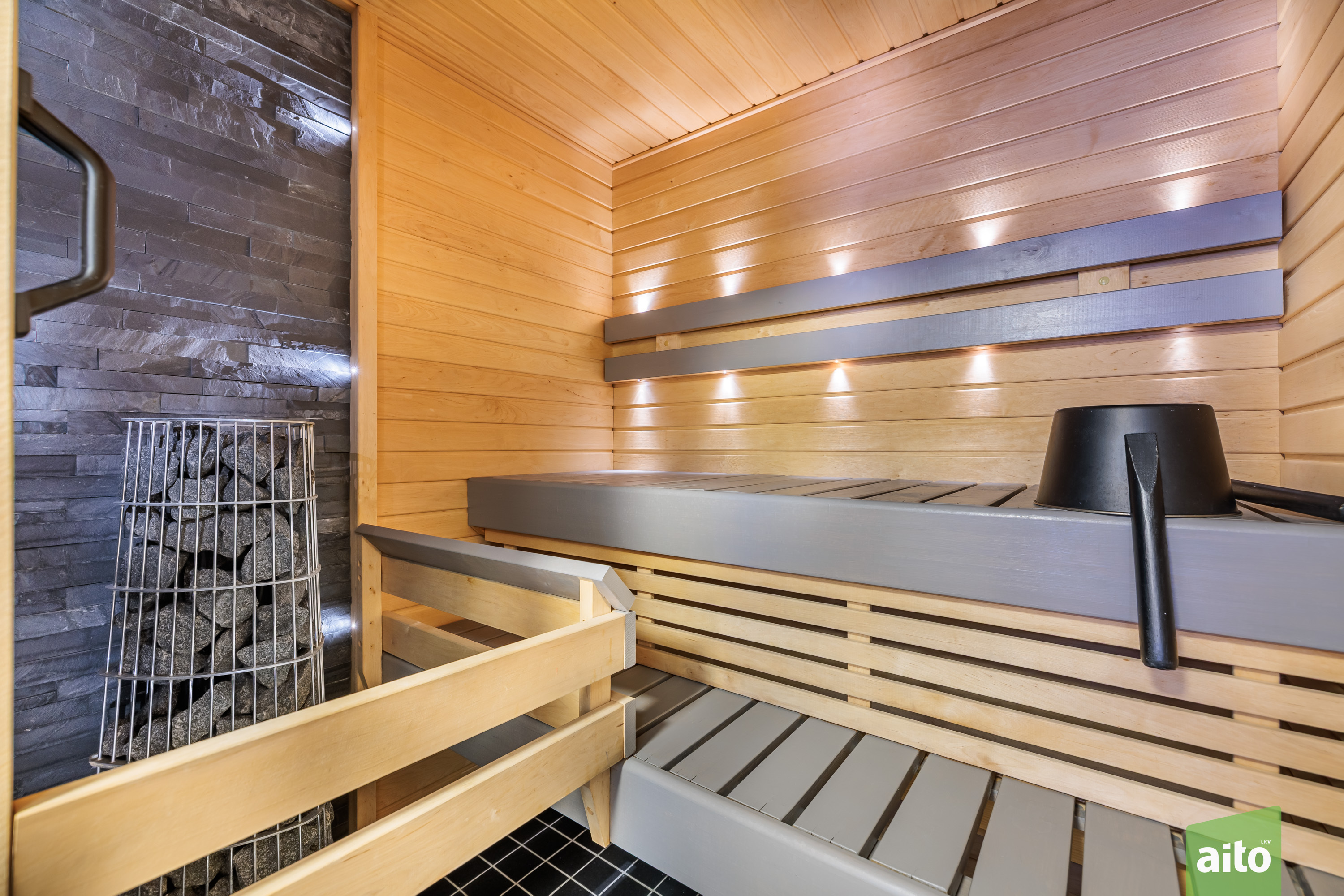 Hyväkuntoinen sauna lämpiää pylväsmallisella sähkökiukaalla.