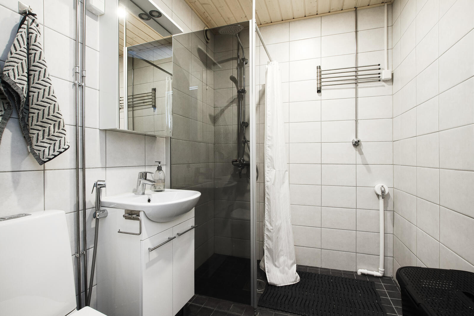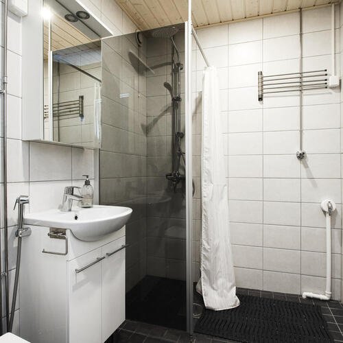 Varusteet: suihku, lattialämmitys, allaskaappi, peilikaappi, pesukoneliitäntä