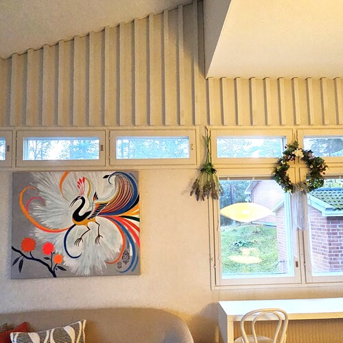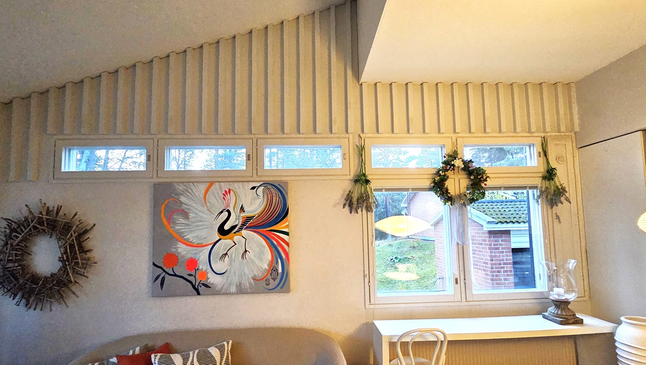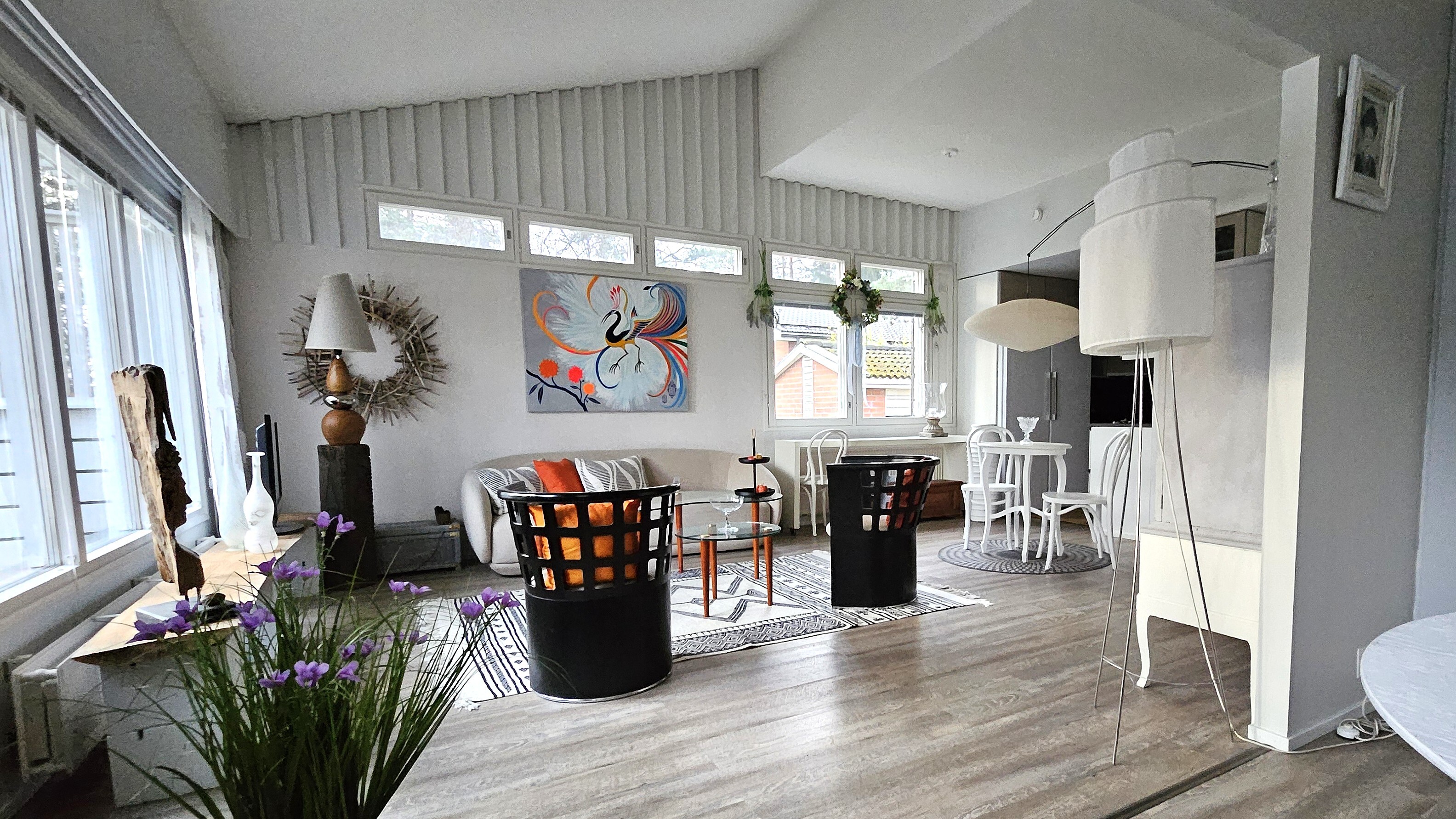 Olohuoneen korkea, lähes nelimetrinen huonetila ja isot ikkunat tulvivat luonnonvaloa, luoden ilmavan ja avaran vaikutelman.