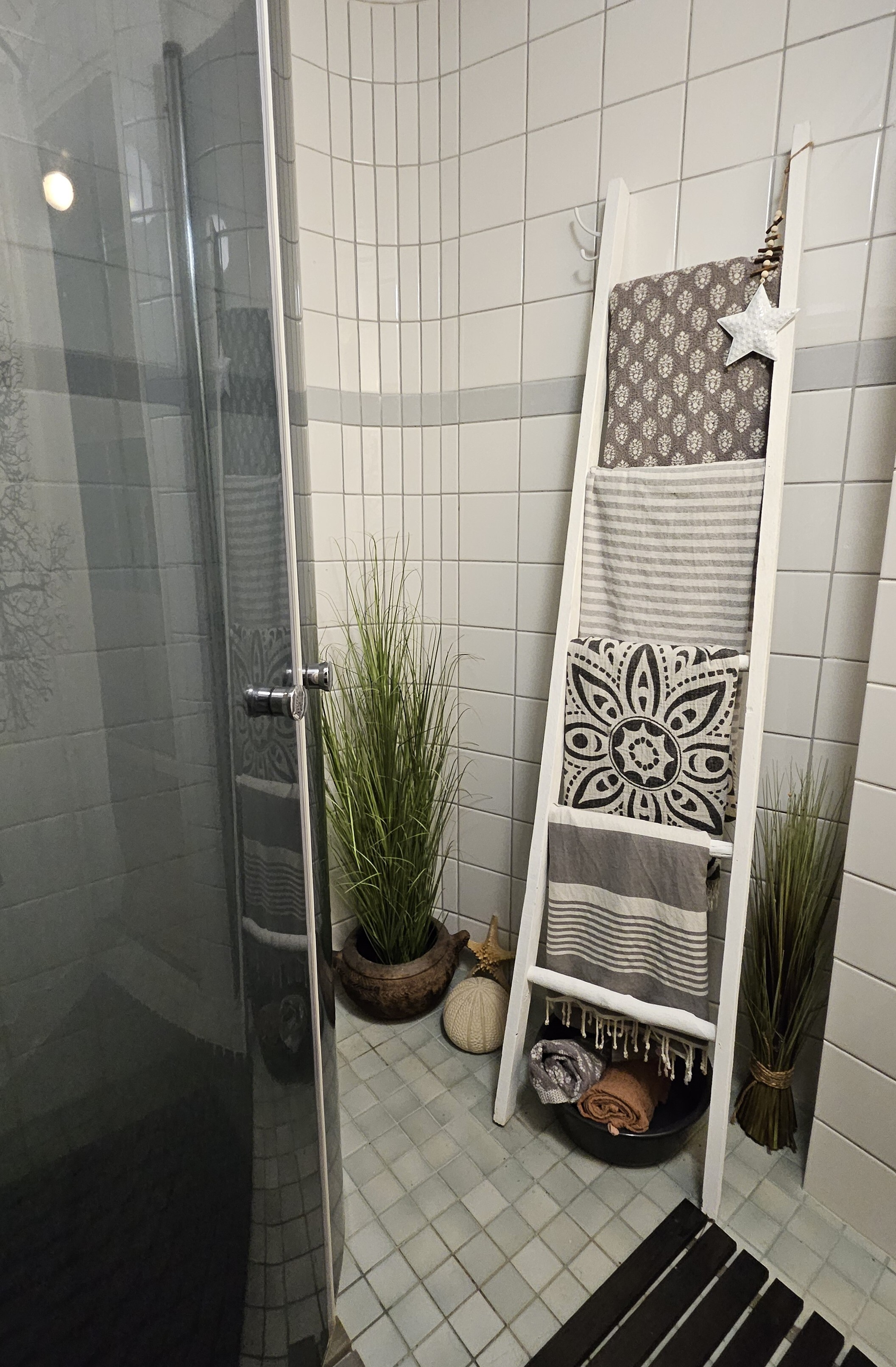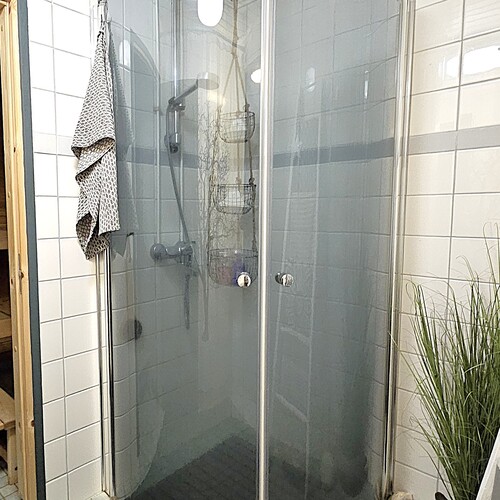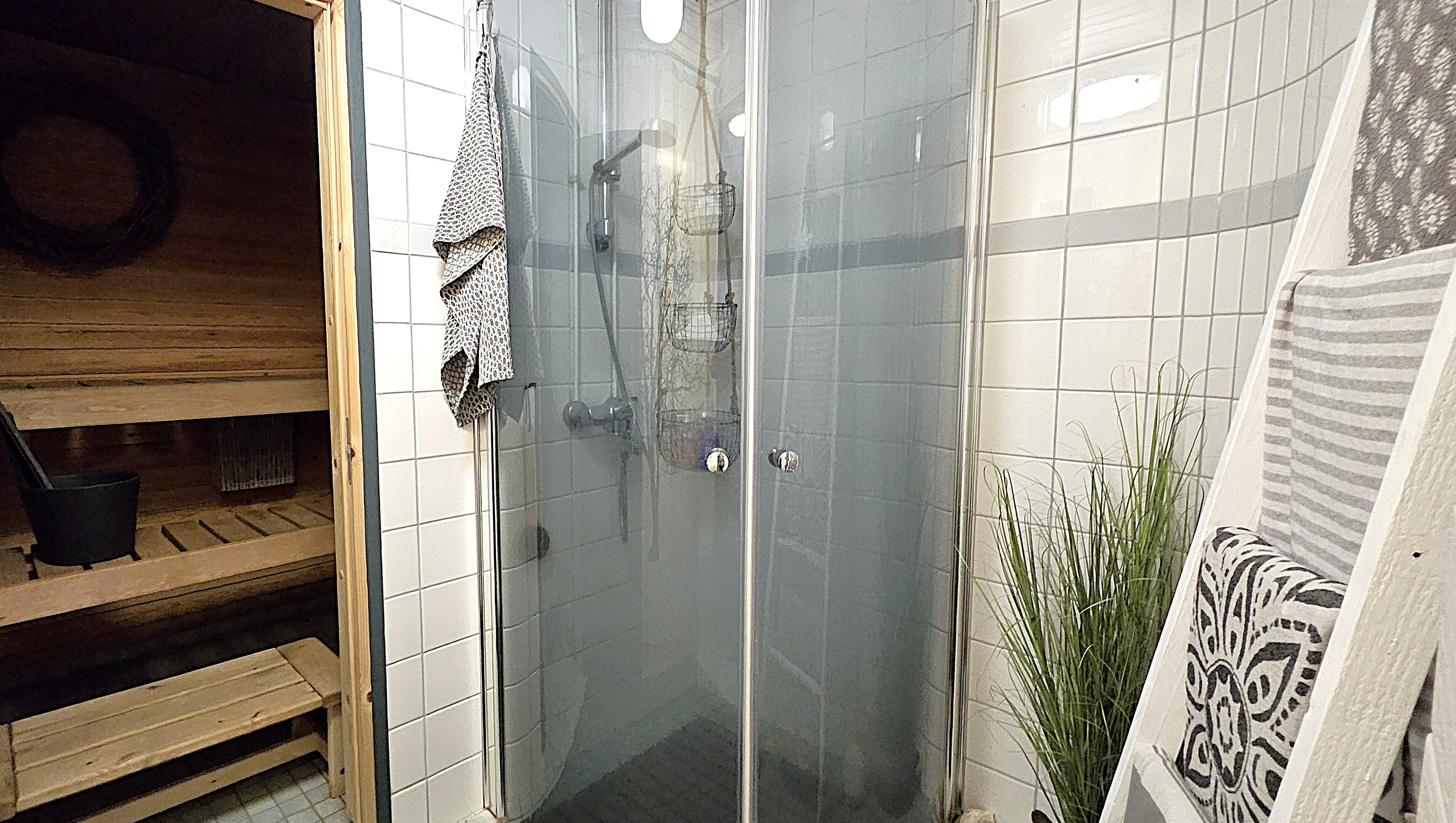 Tunnelmallinen, tilava löylyhuone, viihtyisä kokonaisuus kylpyhuoneen kanssa