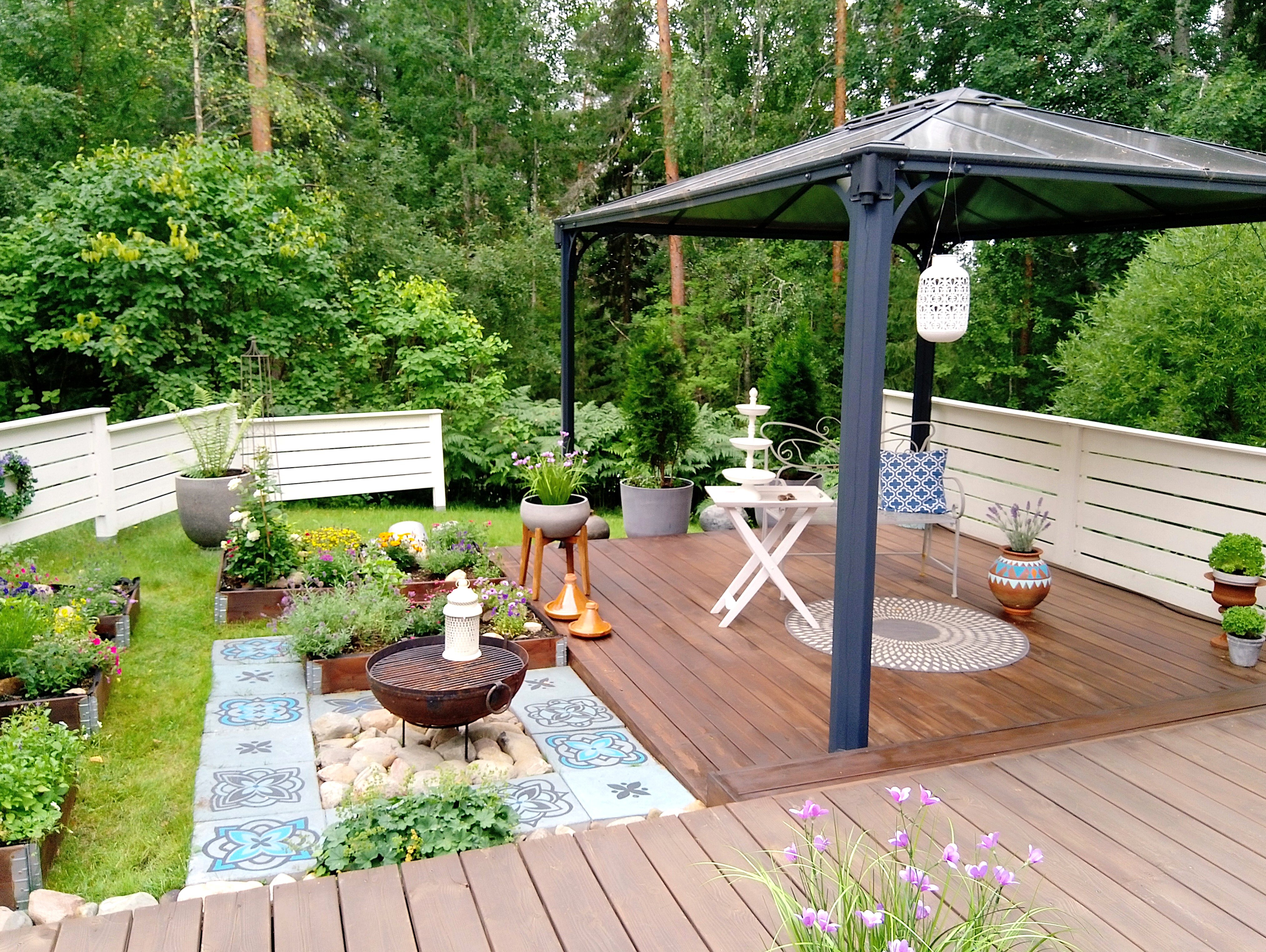 Takapihalle toteutettu kahteen tasoon laaja terassialue, jolla tilat nivoutuvat sisätilojen jatkeeksi ulko-olohuoneeksi.