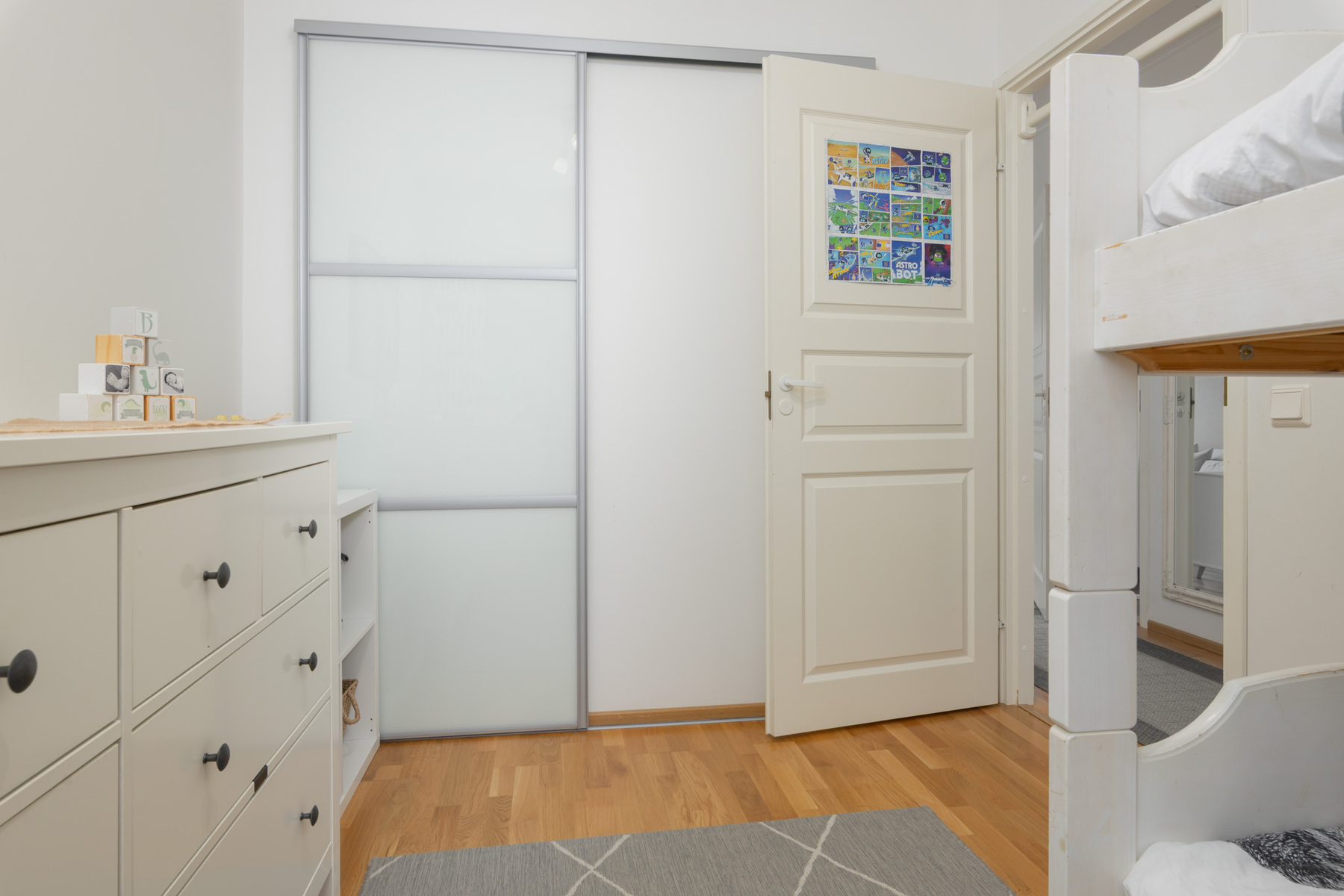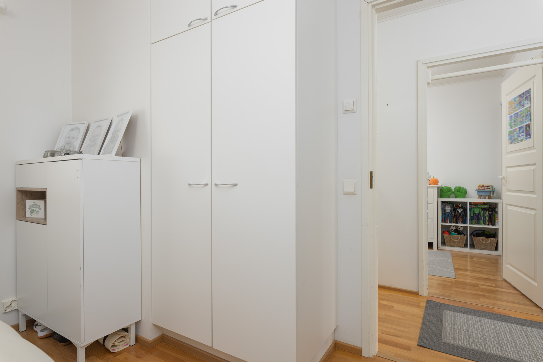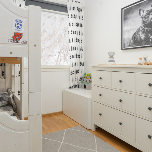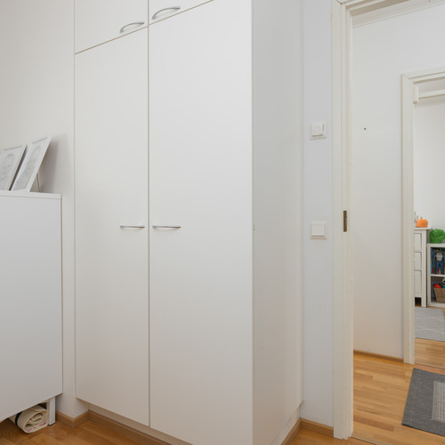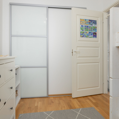 Pienemmän makuuhuoneen yhteydessä liukuovellinen vaatehuone. Seinät: maali. Lattia: parketti.