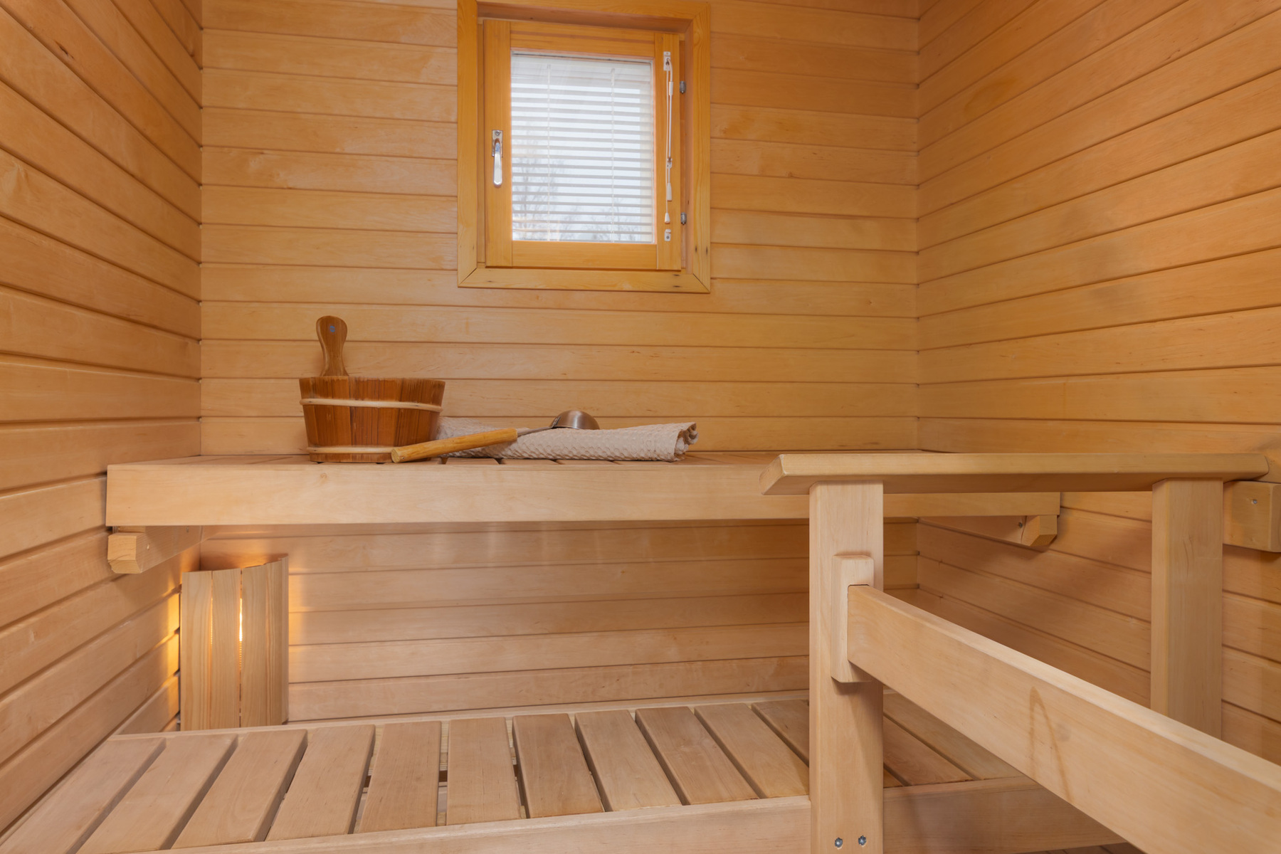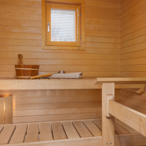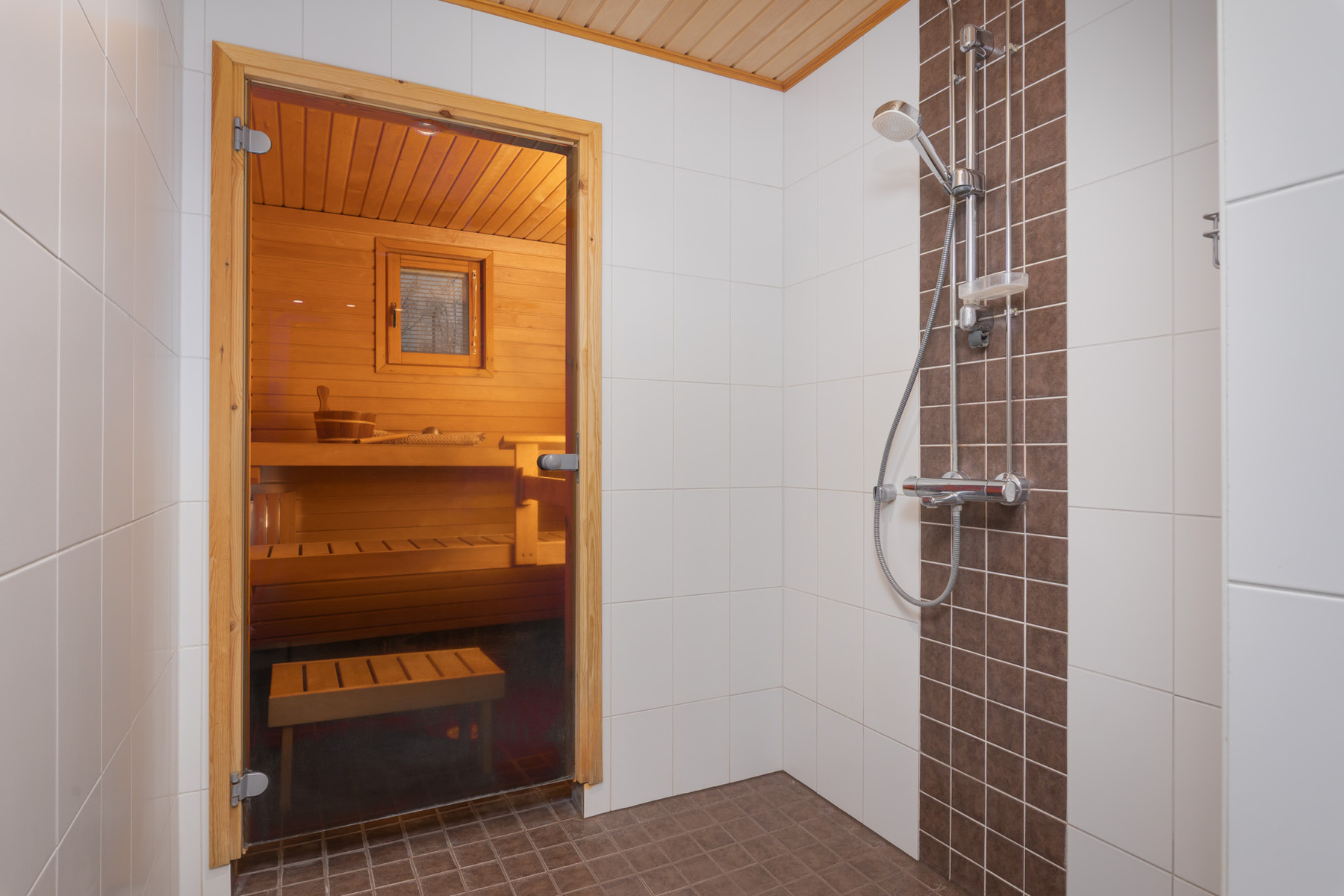 Ikkunallinen sauna. Sähkökiuas, lasiovi, lattialämmitys. Seinät: puupaneeli. Lattia: laatta.