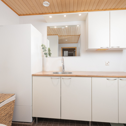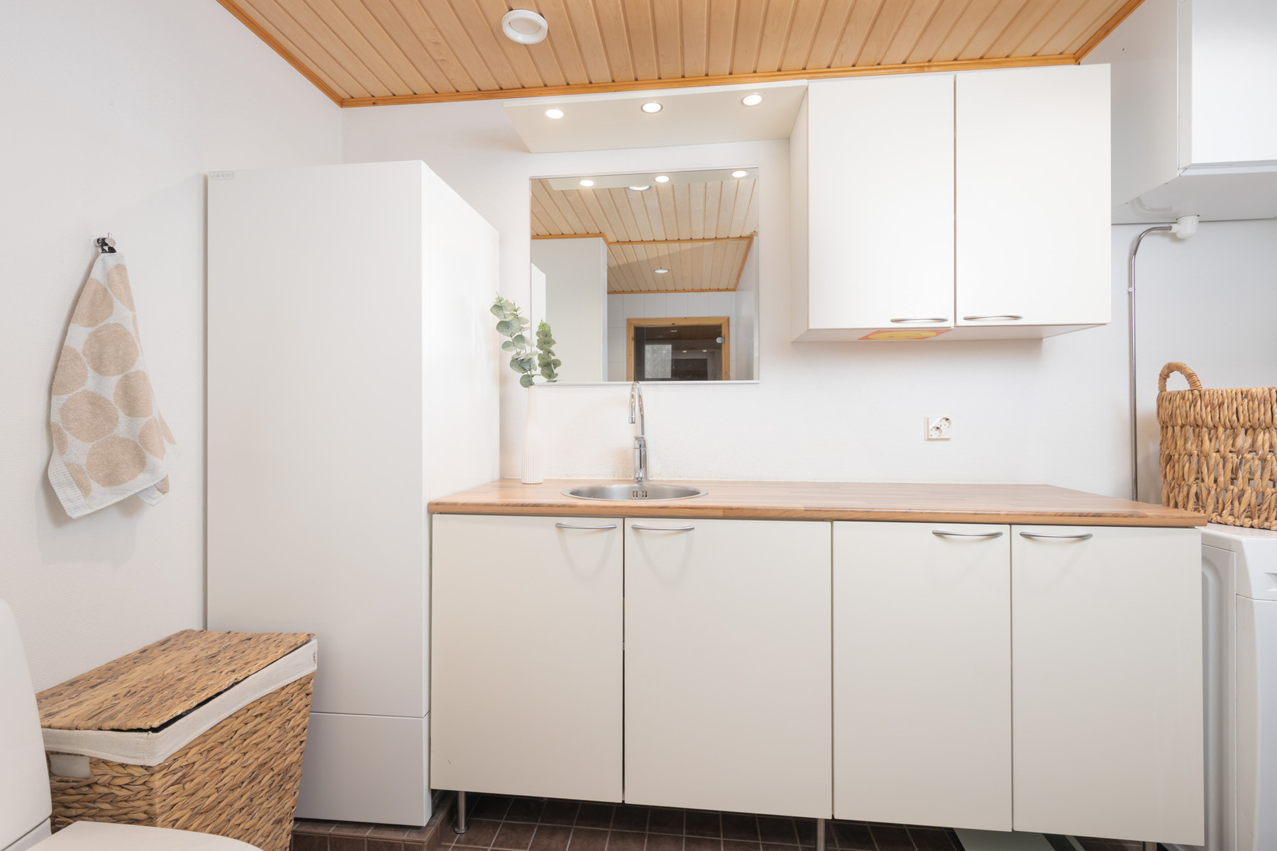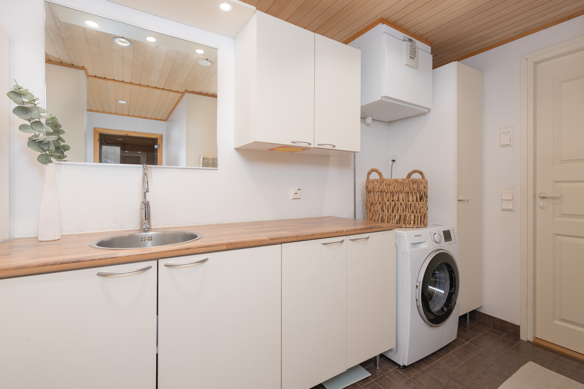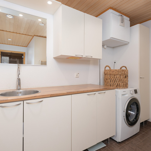 Kodinhoitotila samassa tilassa. Wc-istuin, pesuallas, peili, siivouskaappi, runsaasti kaappi- ja laskutilaa, pesukoneliitäntä, tila pesutornille, iv-laite, lämminvesivaraaja. Lattialämmitys. Seinät: lasikuitutapetti. Lattia: laatta.