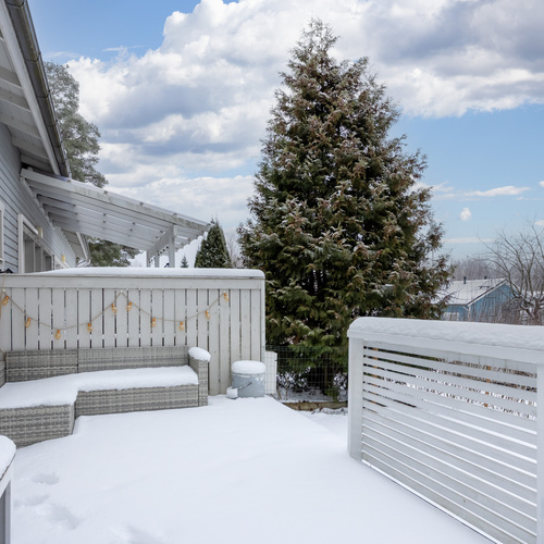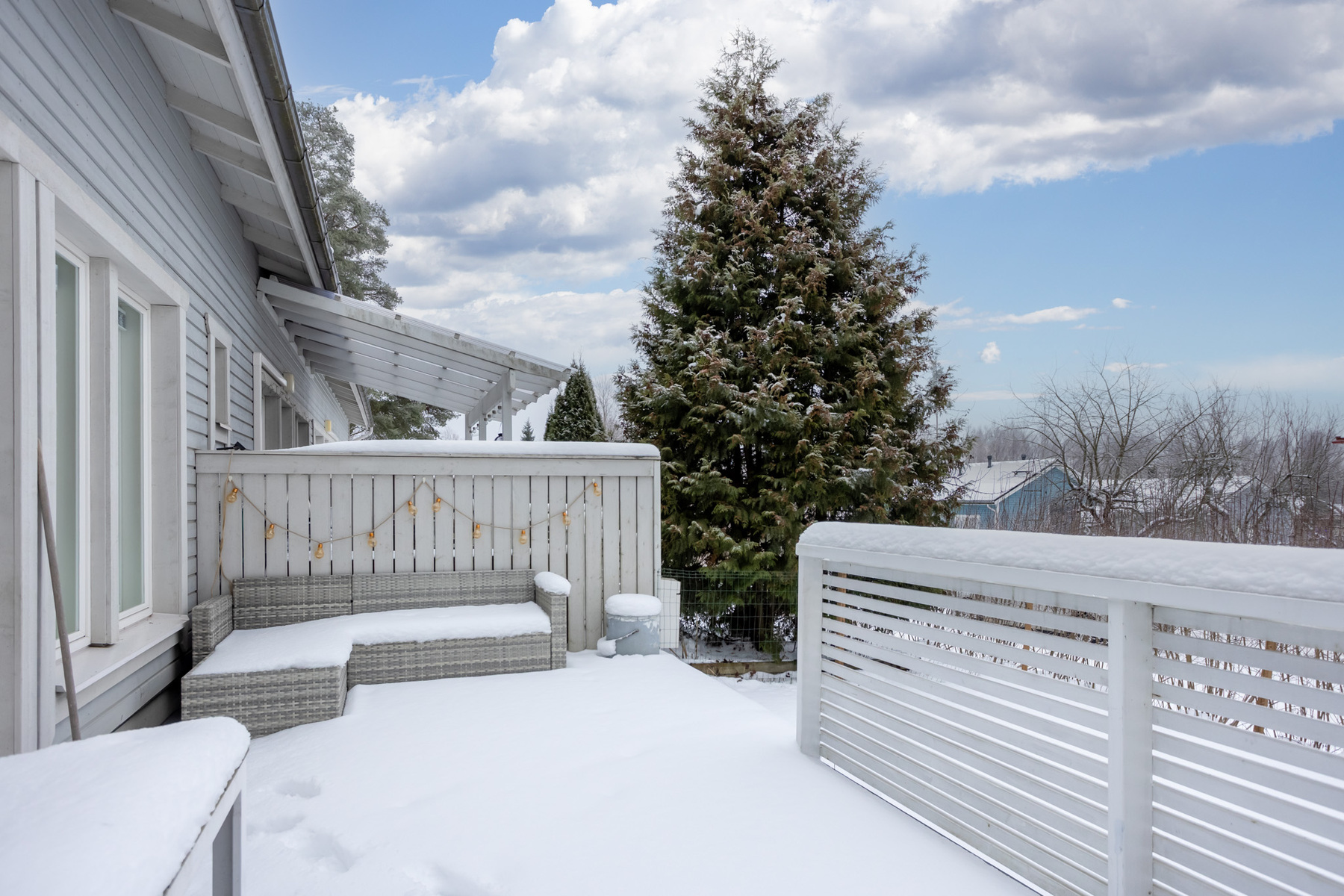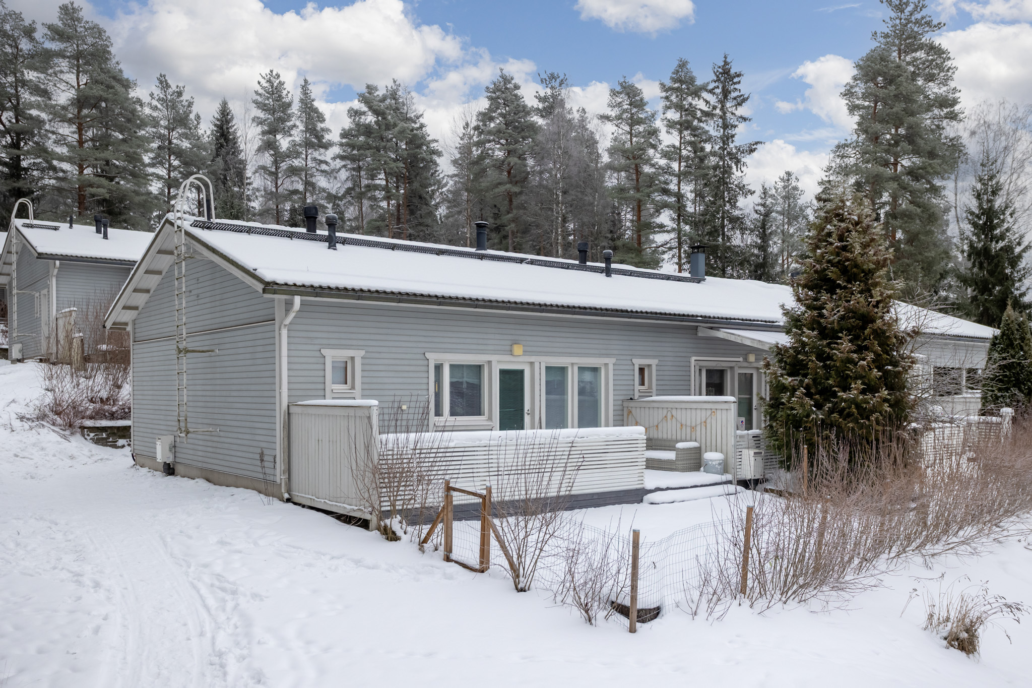 Tilava terassi ja aidattu nurmipiha tarjoavat tilaa niin ulkona rentoutumiseen, puutarhahommiin kuin lasten leikkeihinkin.