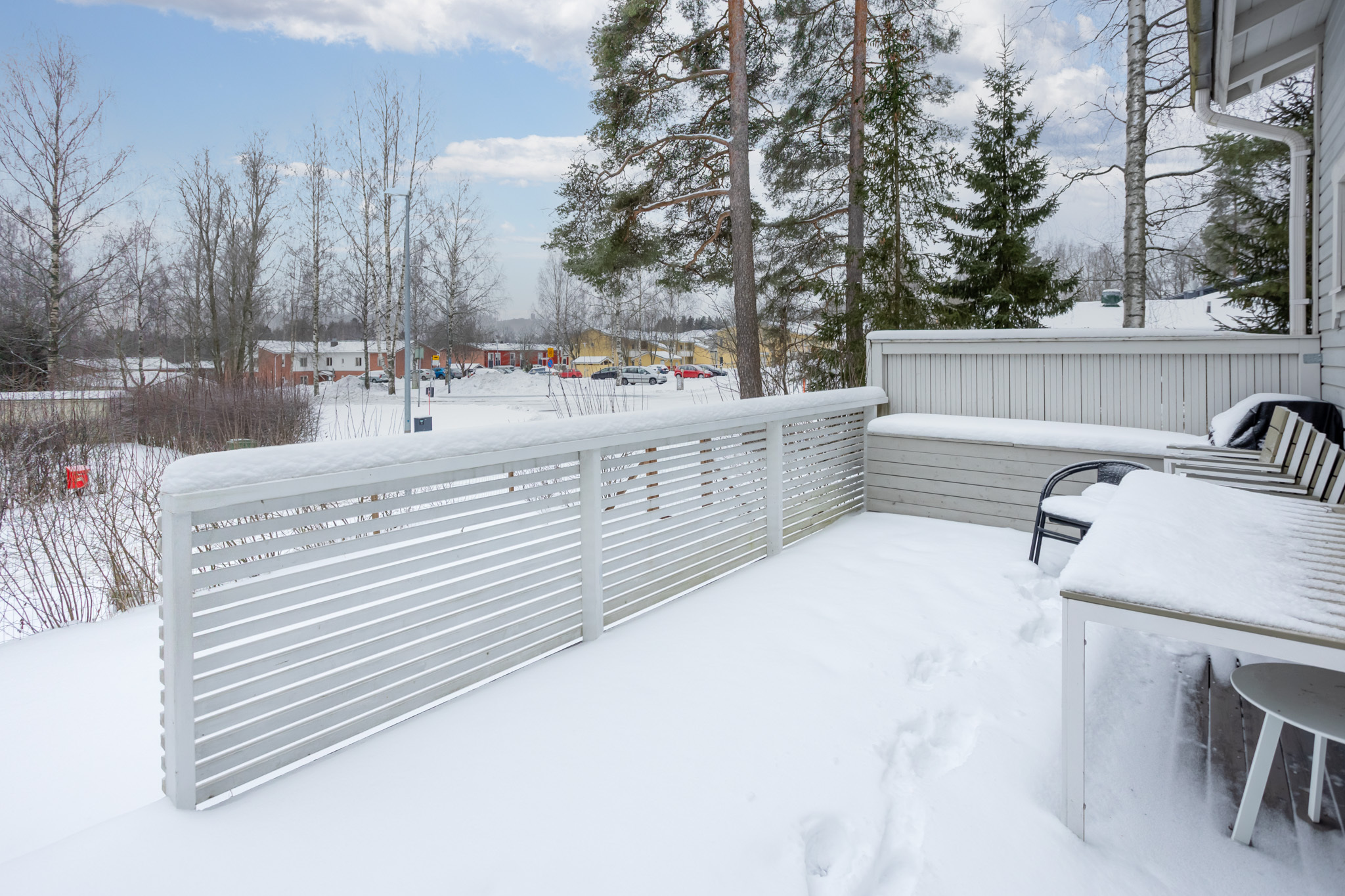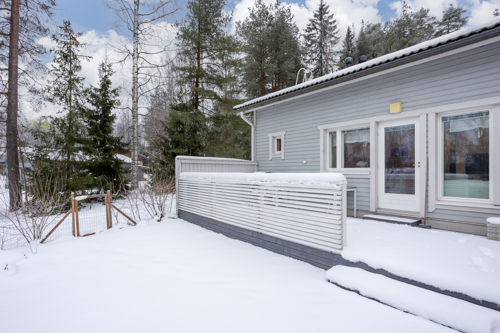 Tilava aidattu terassi ja verkkoaidattu nurmipiha n. etelän suuntaan.