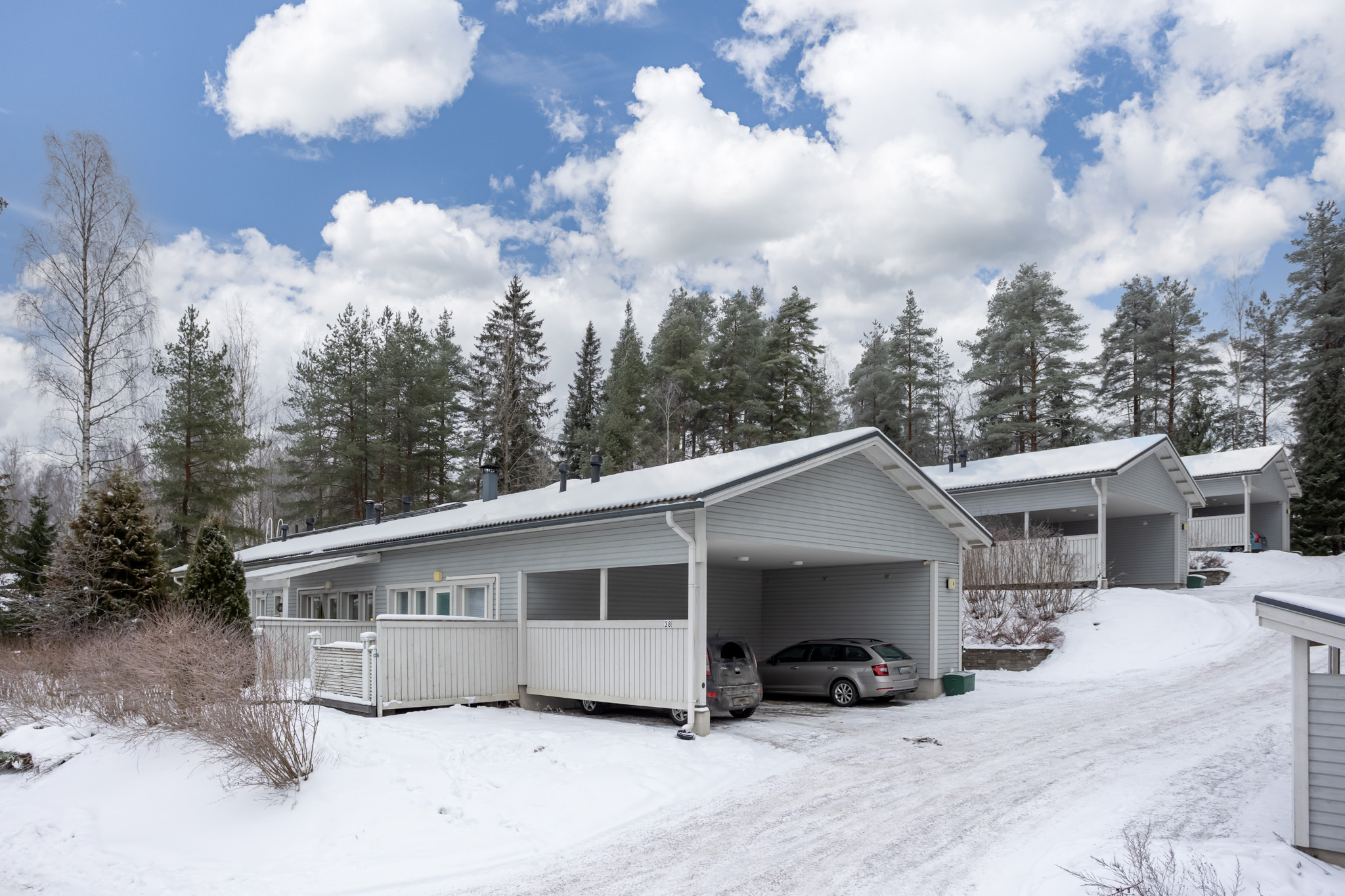 Jokaiselle huoneistolle kuuluu pistokkeellinen autokatospaikka. Pihassa lisäksi kaksi vieraspaikkaa.