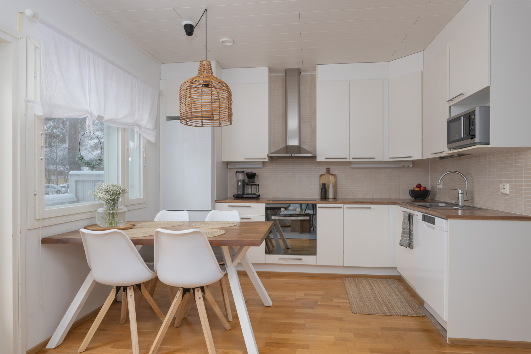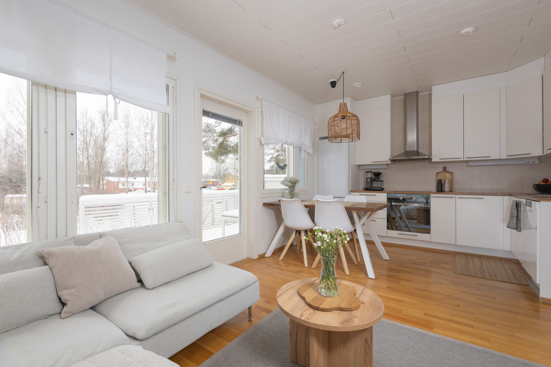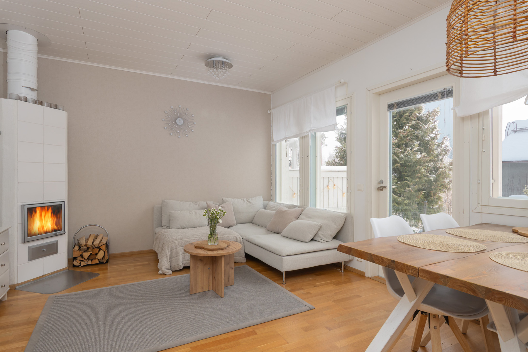 Olohuoneen yhteydessä sijaitseva varaava takka tuo tilaan miellyttävää tunnelmaa ja käytännöllistä lisälämpöä. Tyylikäs avokeittiö jatkaa kokonaisuutta luontevasti. Tilava pesu- ja kodinhoitotila, ikkunallinen sauna sekä kaksi wc:tä helpottavat arjen sujumista.