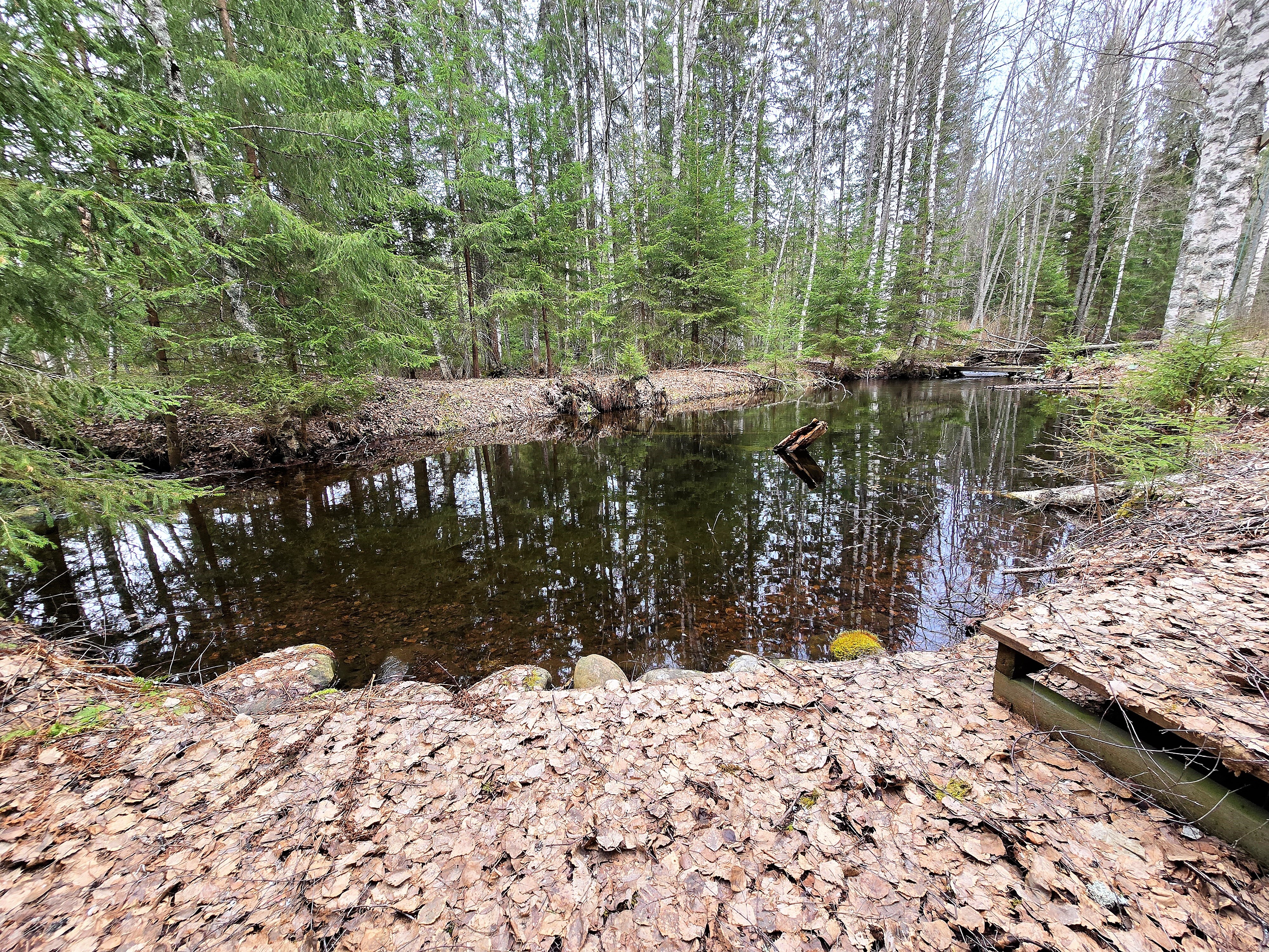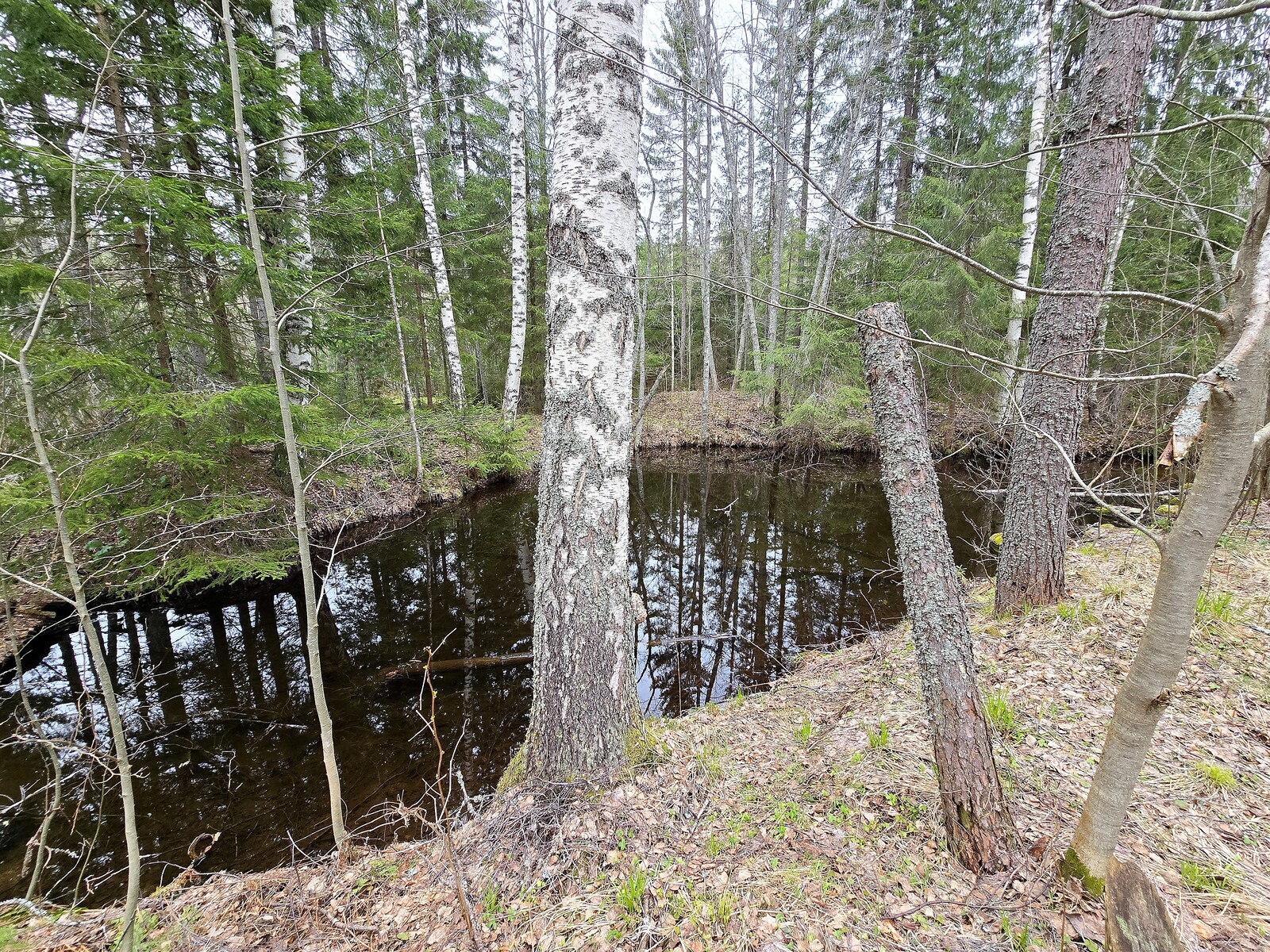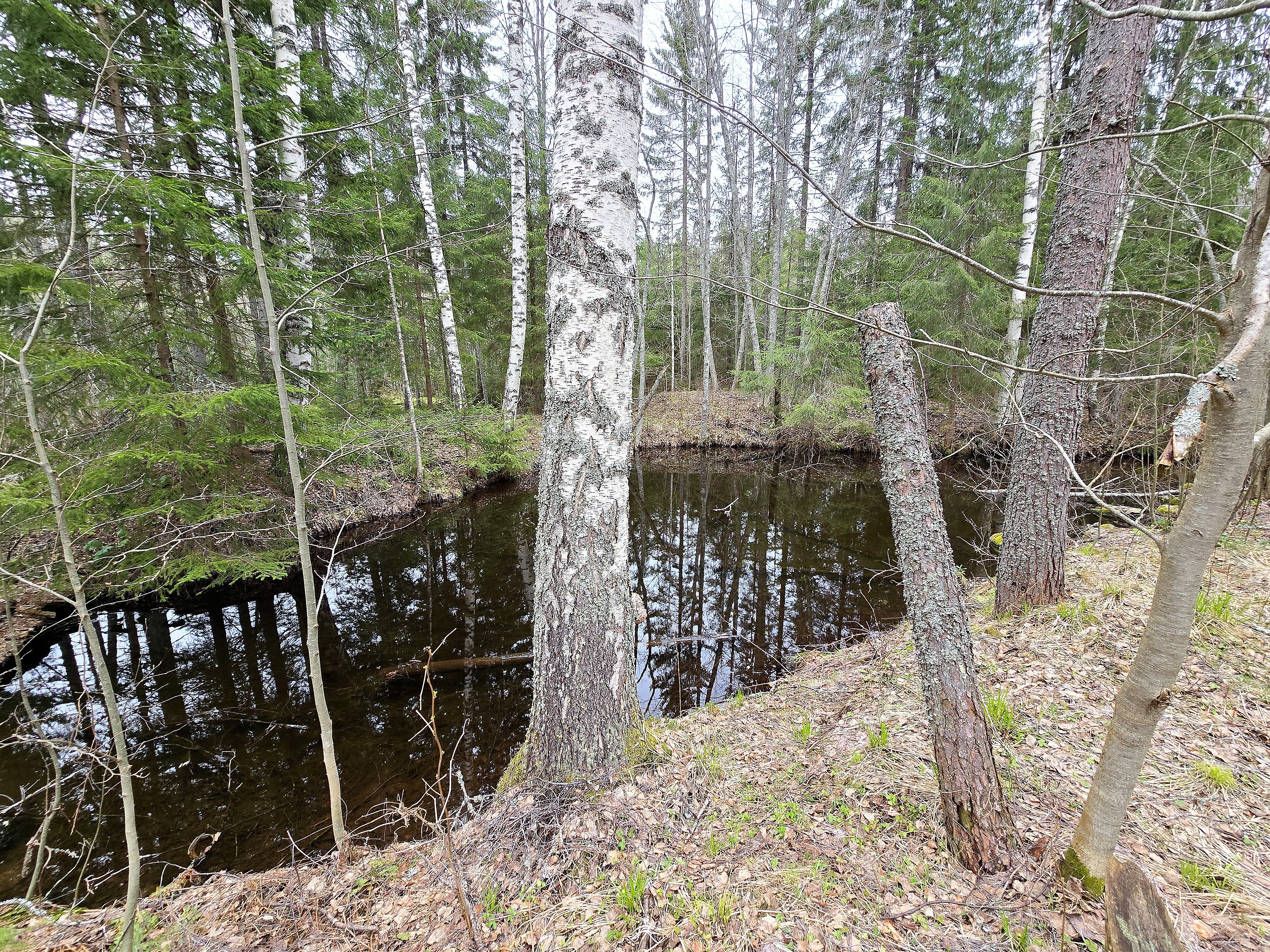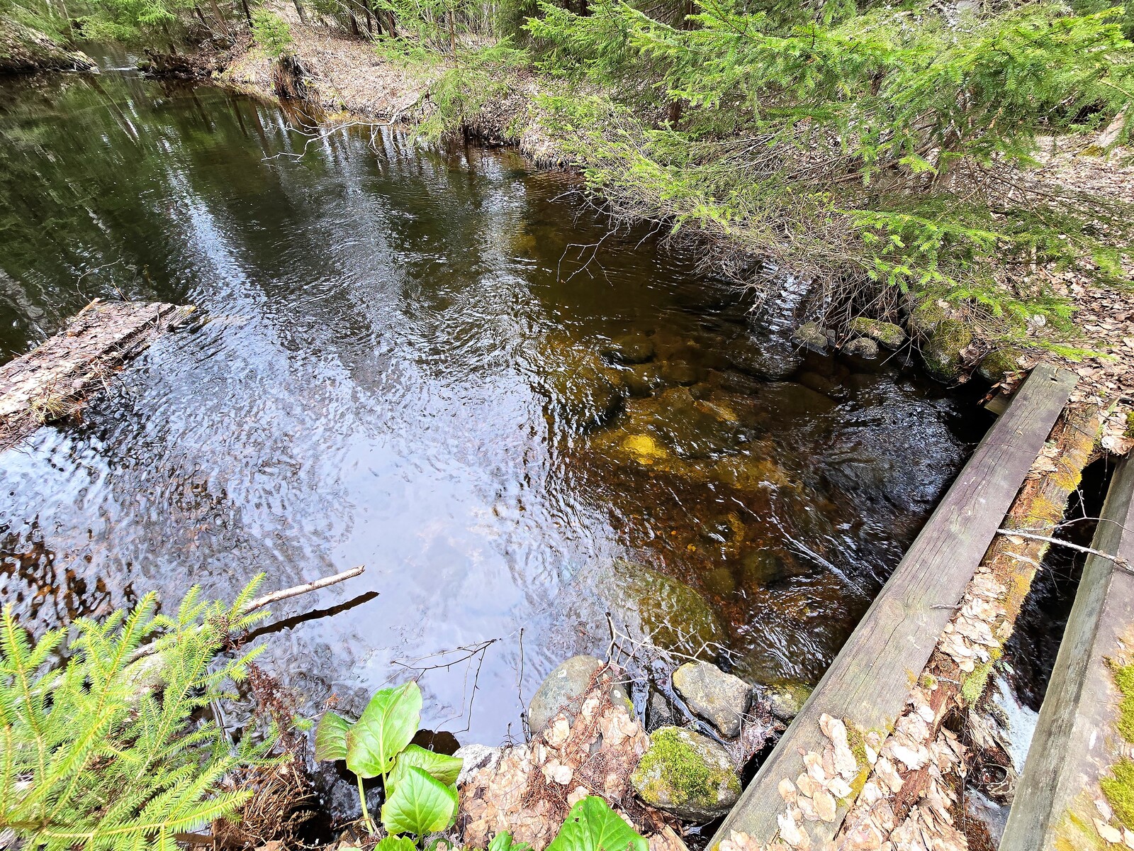 Metsäinen joen ranta. Kirkas vesi.